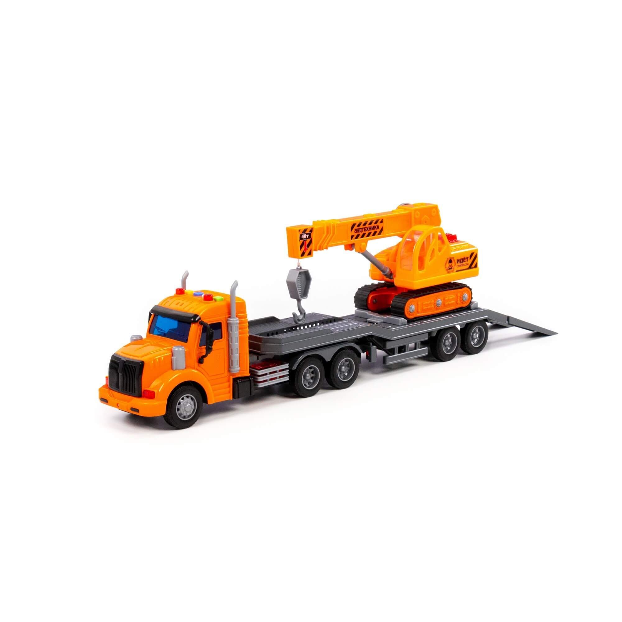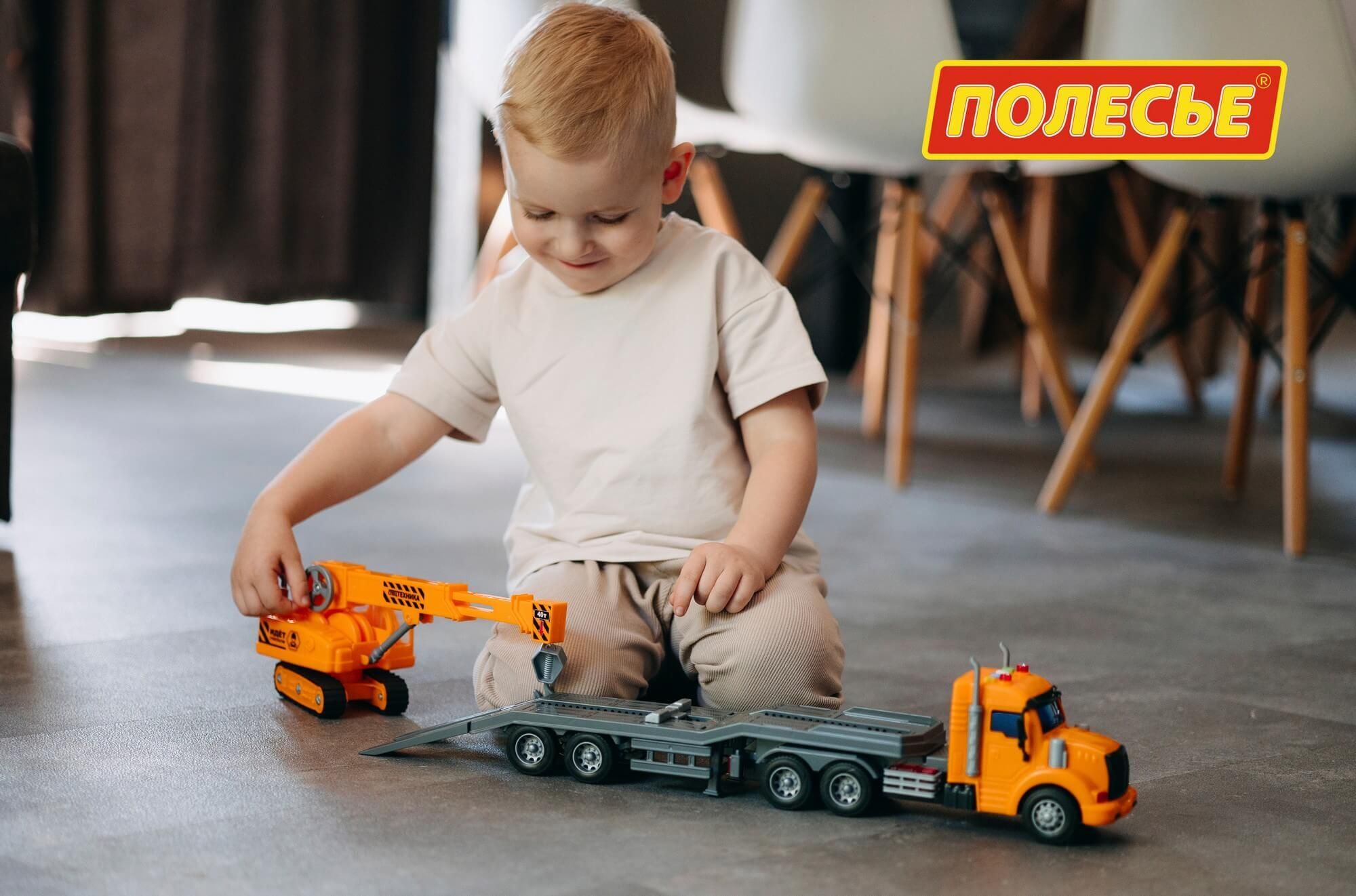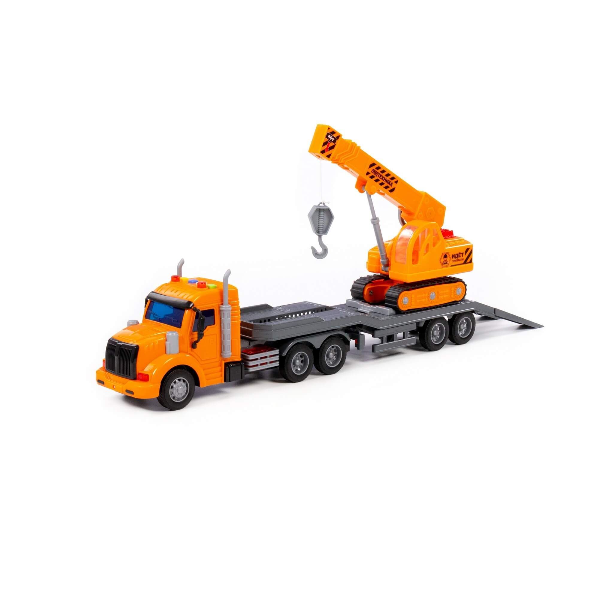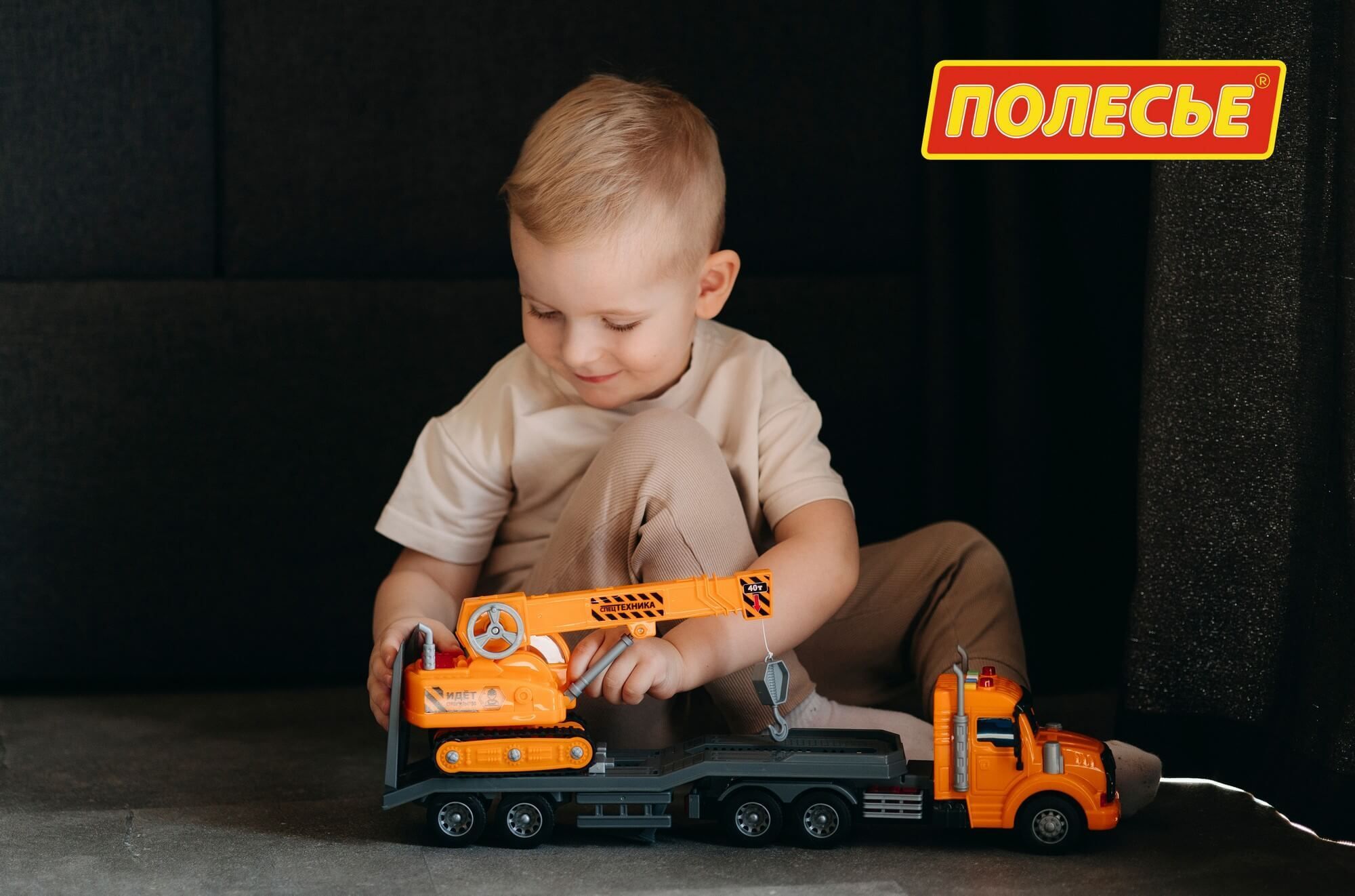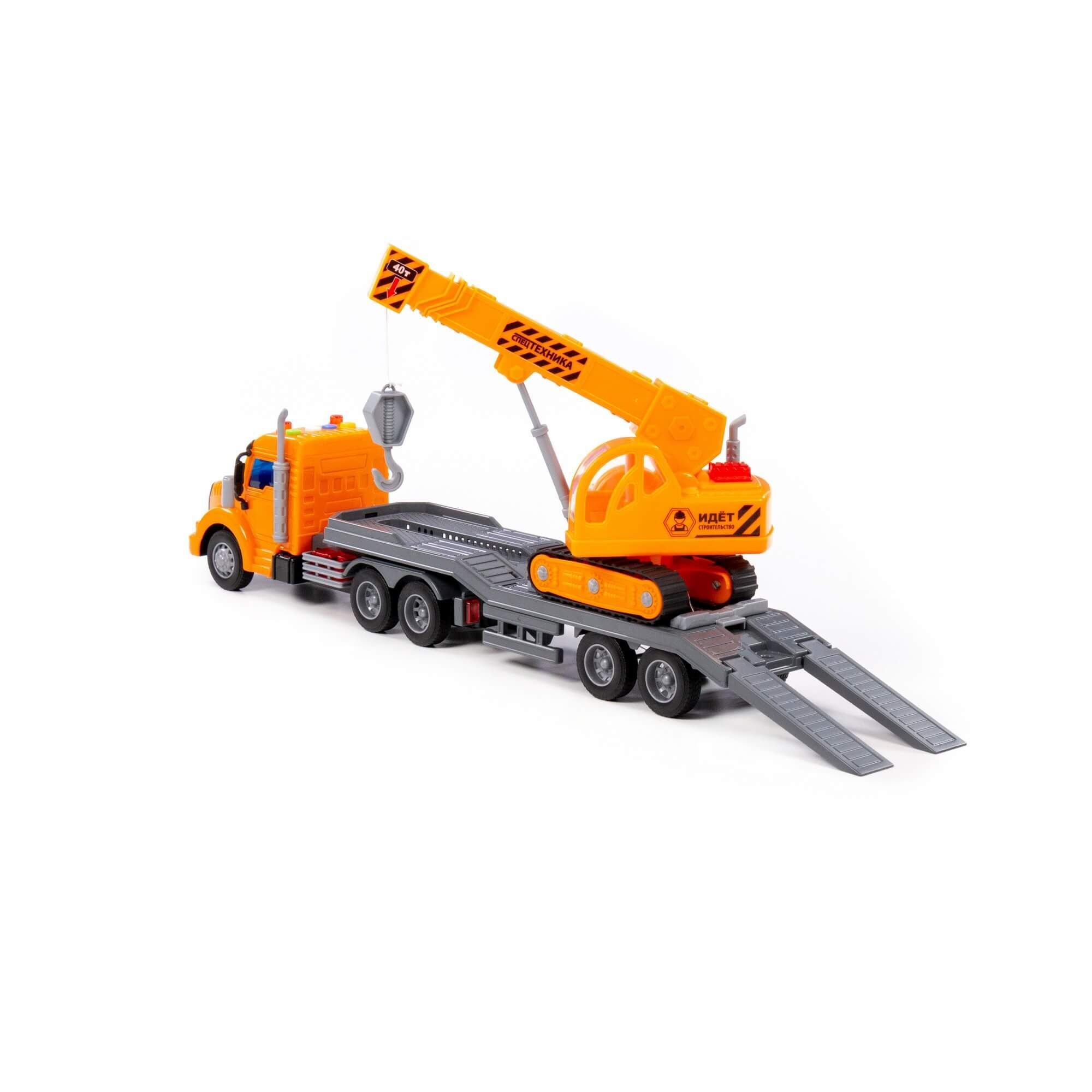 Автомобиль-трейлер «Профи» полностью повторяет конструкцию настоящей техники. В набор входит гусеничный кран, который можно перевозить на платформе трейлера. Автомобиль оснащён инерционным механизмом. На кабине машины 4 кнопки управления звуковыми и световыми эффектами. Продается игрушка в коробке.
