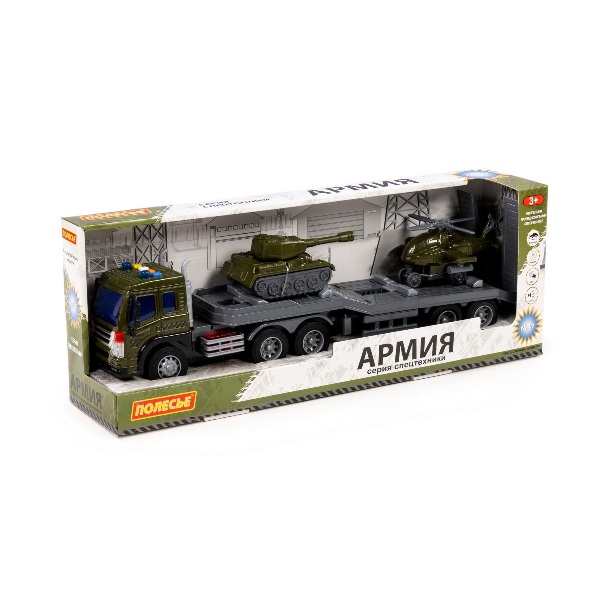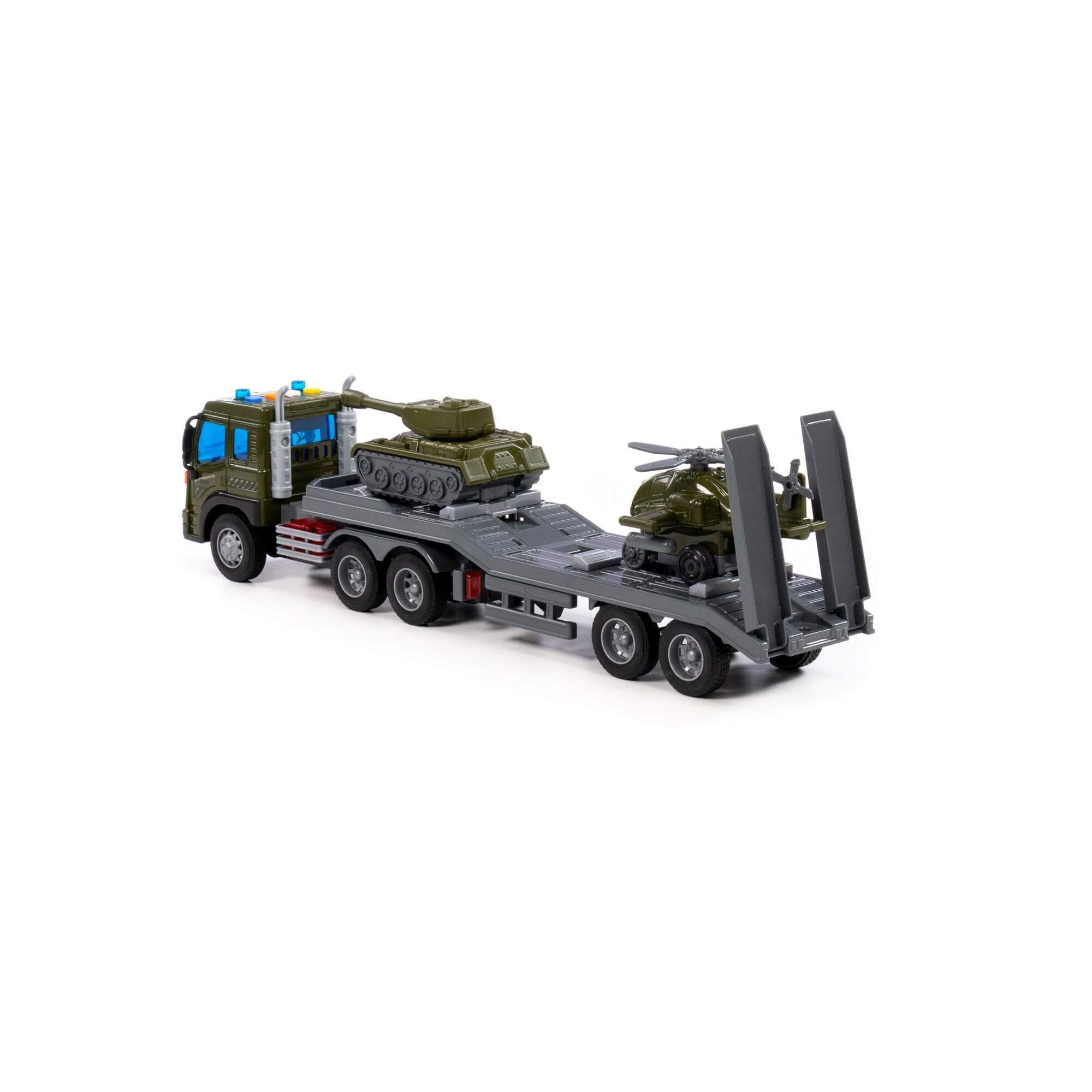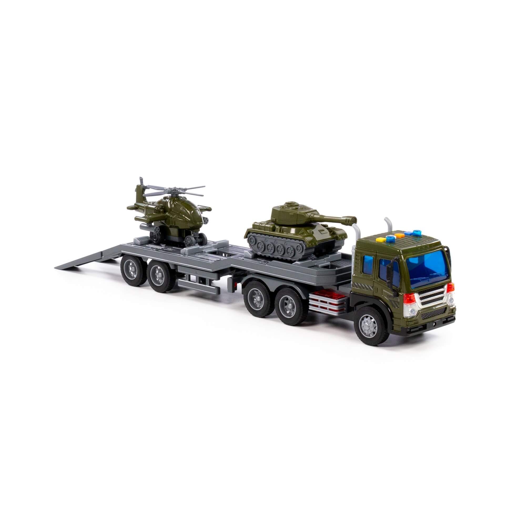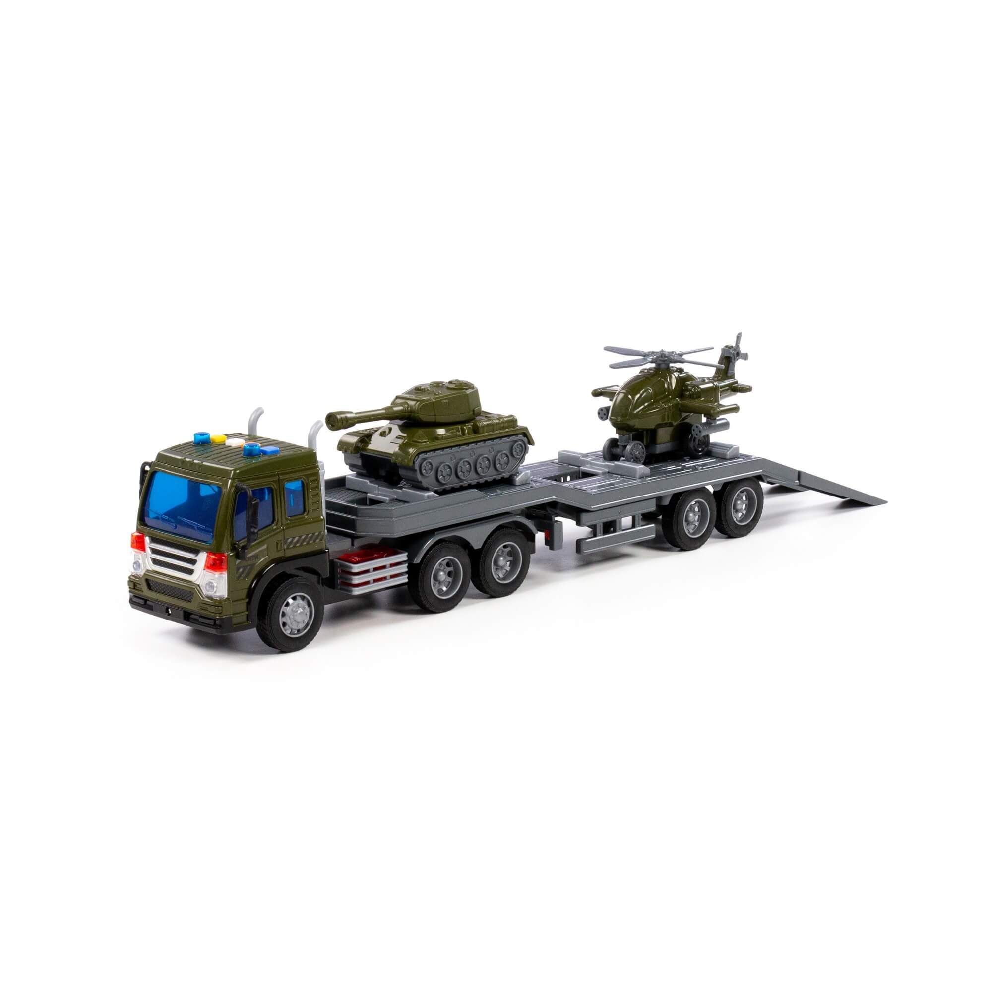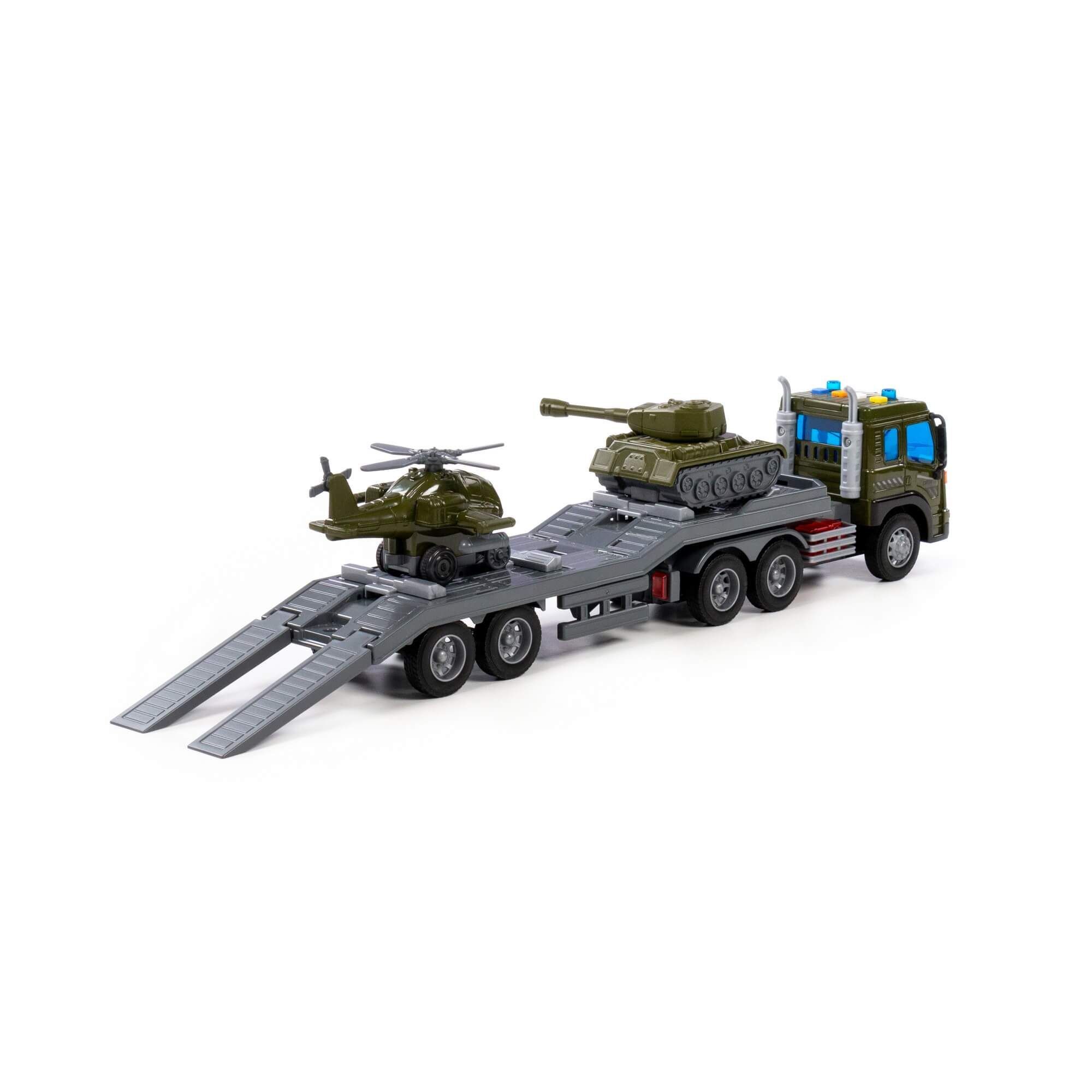 Игрушка, которая точно не оставит никого равнодушным. Автомобиль-трейлер «Сити» выполнен из высококачественных материалов, оснащен пятью парами надежных колес на металлических осях. Наличие инерционного механизма делает игру еще более интересной и реалистичной. На кабине тягача расположены кнопки для управления световыми и звуковыми эффектами, сопровождающими процесс игры при необходимости. Прицеп автомобиля-трейлера оборудован специальным устройством, позволяющим совершать удобную погрузку и выгрузку игрушечного танка и вертолета. Они выполнены в одной цветовой гамме, имеют реалистичный внешний вид и множество интересных деталей, что помогает малышу придумать больше интересных сценариев игры.