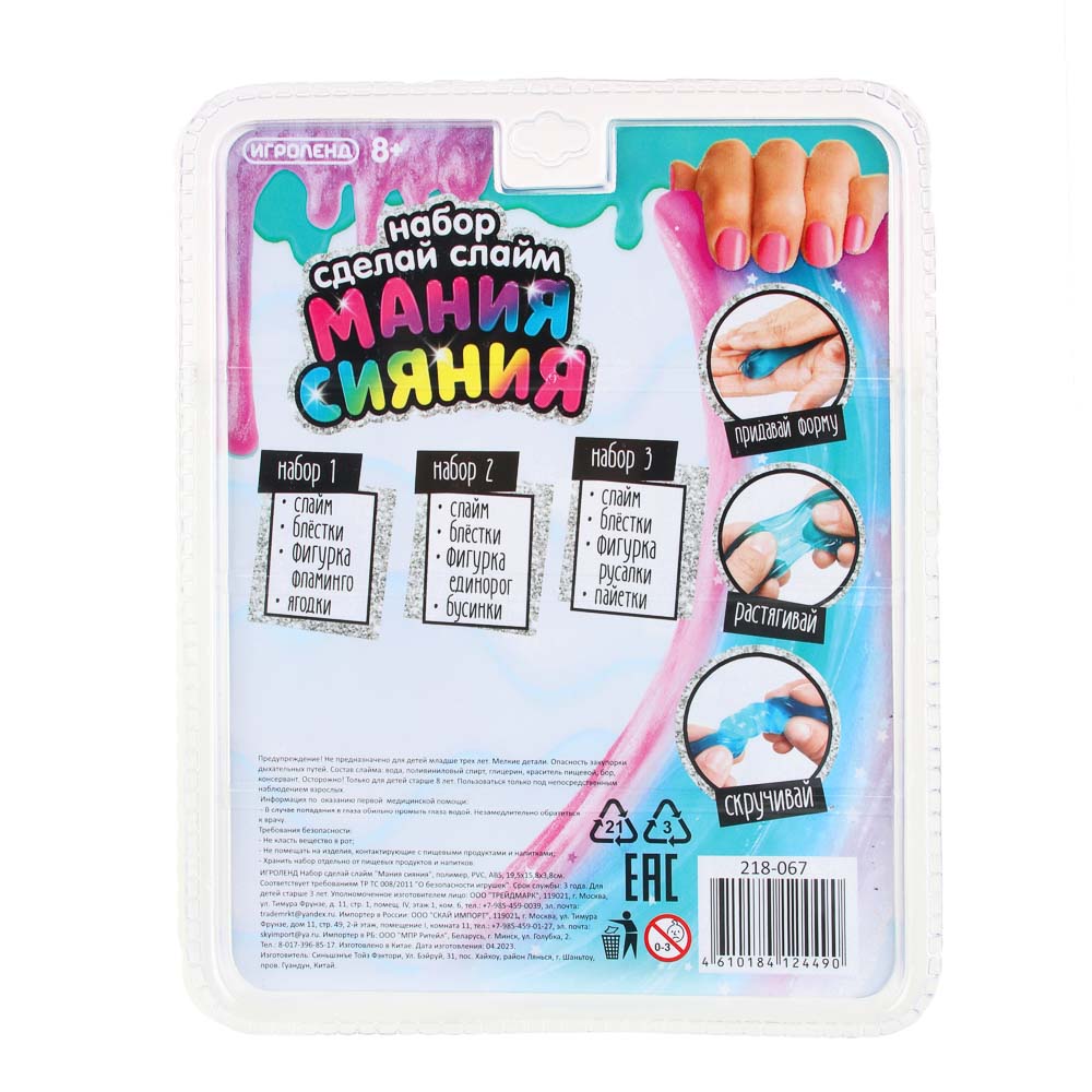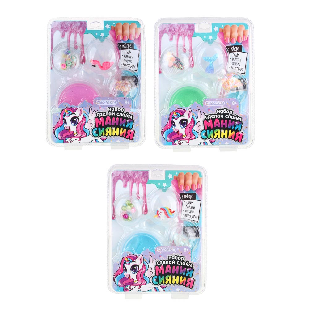 Набор Сделай слайм "Мания сияния" ИГРОЛЕНД – это комплект для детского творчества, который включает себя прозрачный цветной слайм, блестки, фигурку и аксессуары для декора: пайетки, ягодки или бусинки. Слайму можно придать любую форму, а затем украсить его элементами из набора. Благодаря особой текстуре слайм можно скручивать и растягивать снова и снова. Доступно 3 дизайна.