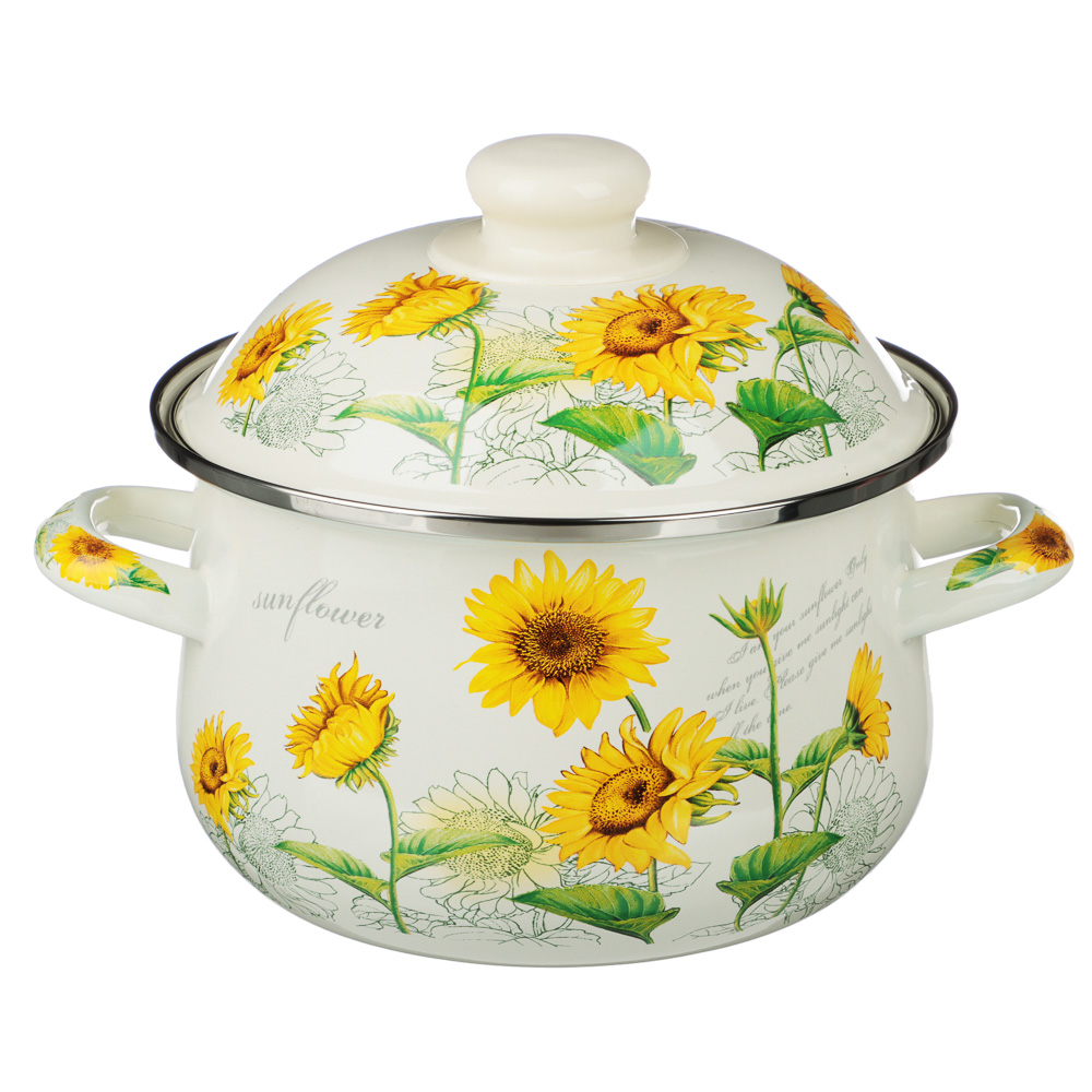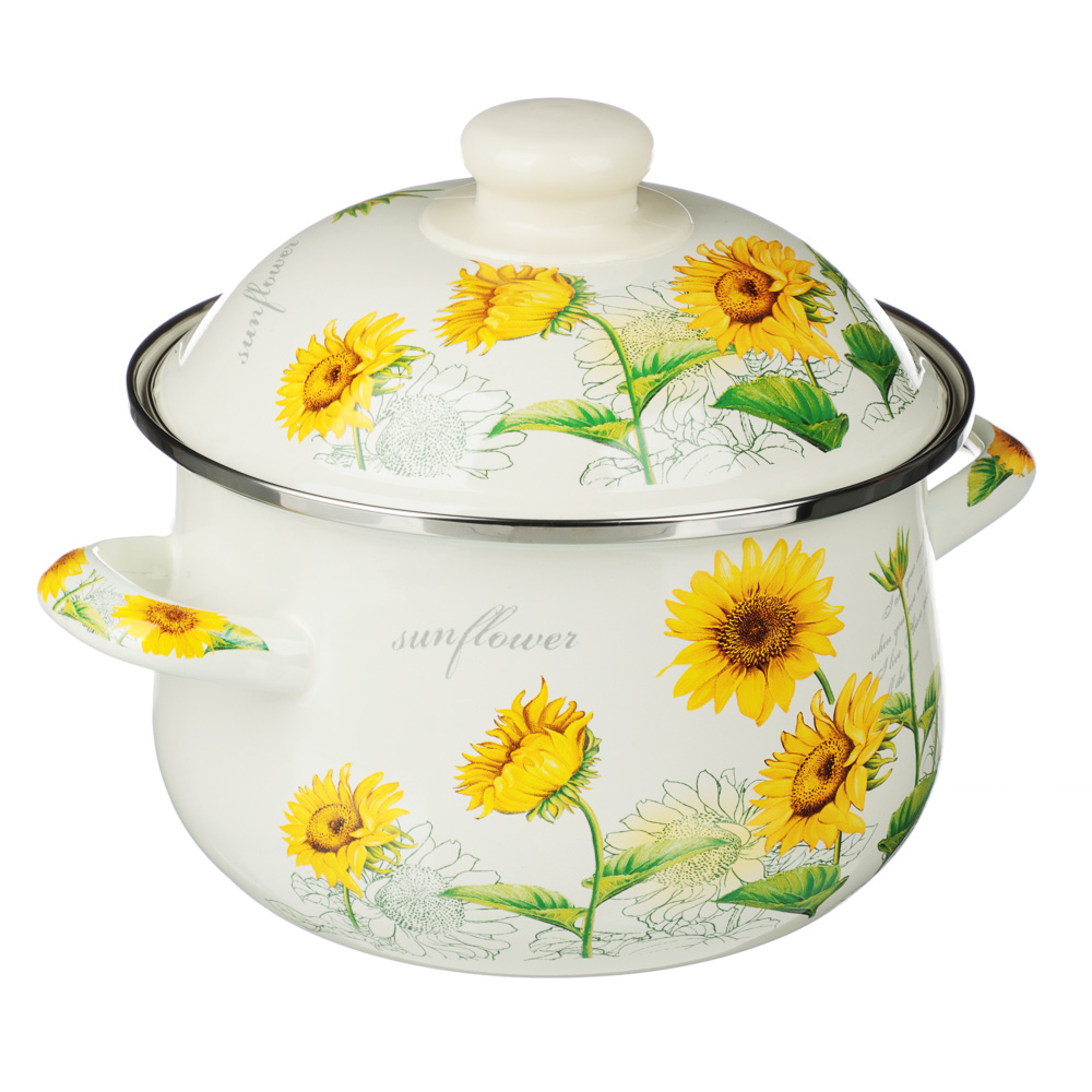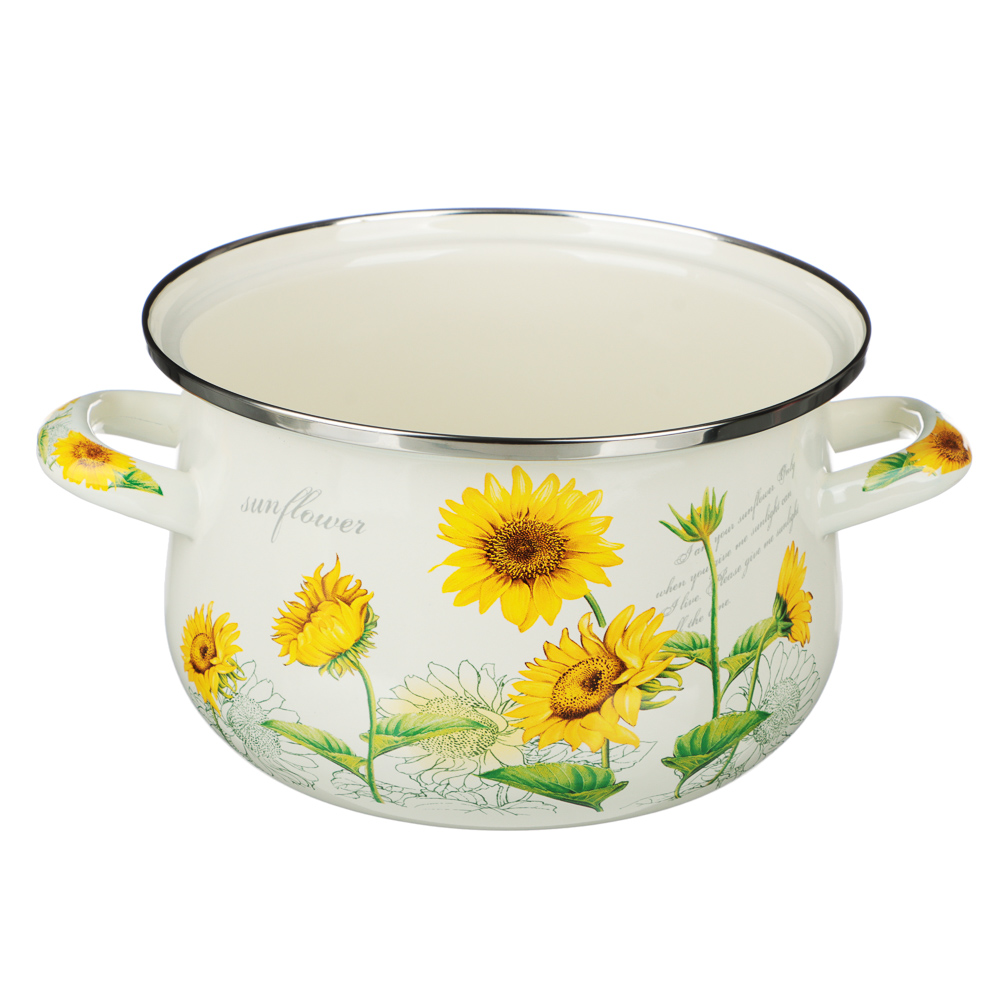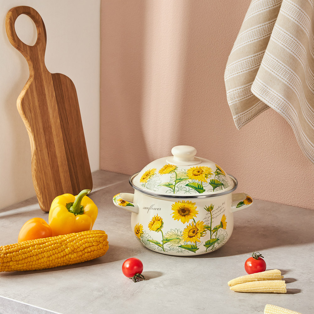 Нужна безопасная, качественная и красивая посуда для кухни? Эмалированная кастрюля VETTA «Подсолнухи» отвечает всем заявленным критериям. Идеально гладкая поверхность легко очищается от загрязнений, исключает размножение бактерий. В такой емкости можно хранить первые и вторые блюда. Приготовленный суп не пропитается запахом металла и не испортится.Причины купить эмалированные кастрюли VETTA:• варите на всех типах плит, включая индукцию;• объем — 2 литра, диаметр — 18 см;• можно ставить в духовой шкаф при температуре до 200°;• эмалированная посуда практична и долговечна: не подвержена коррозии, прочная, не деформируется со временем.
