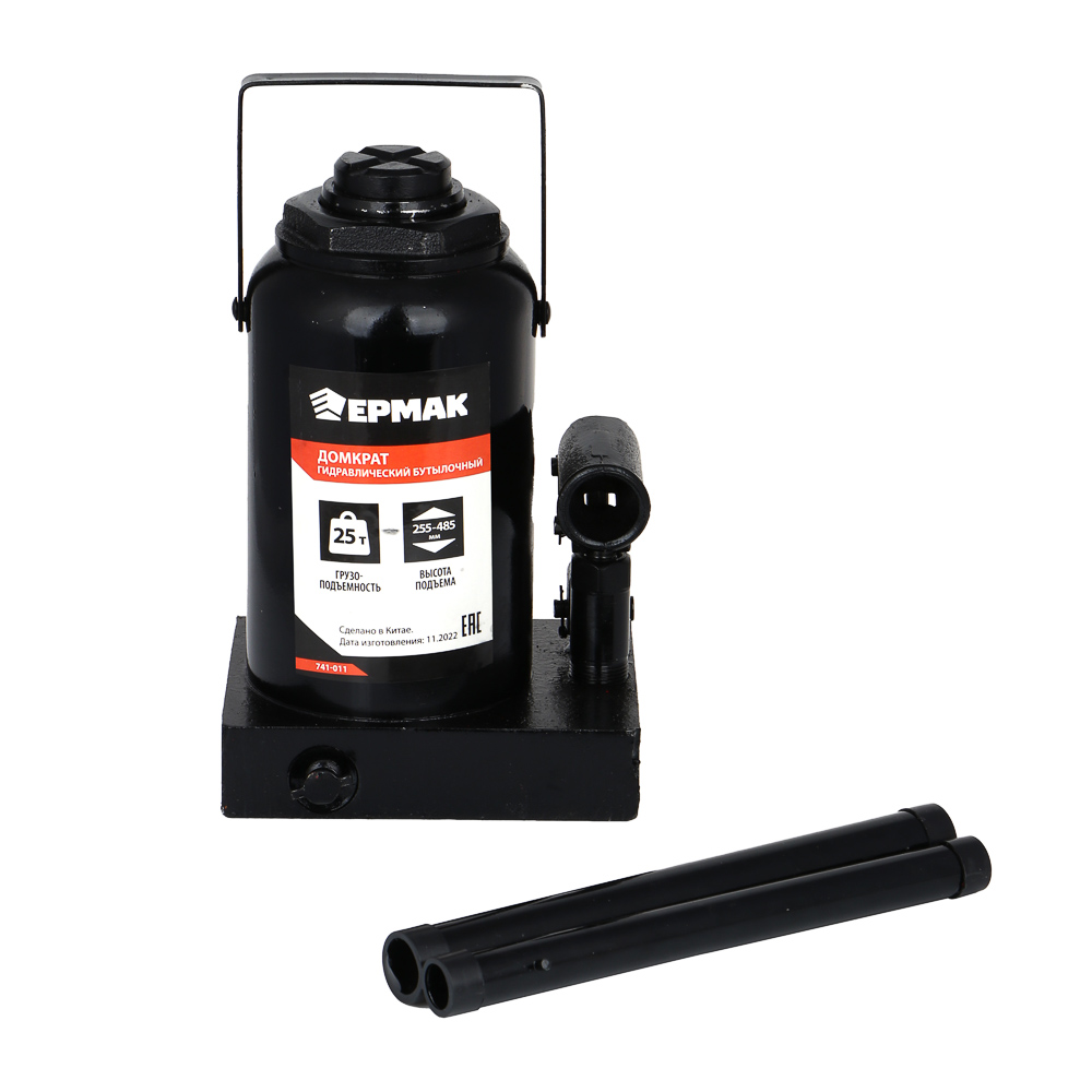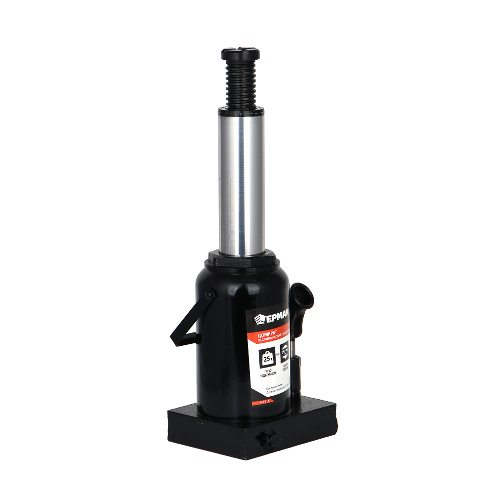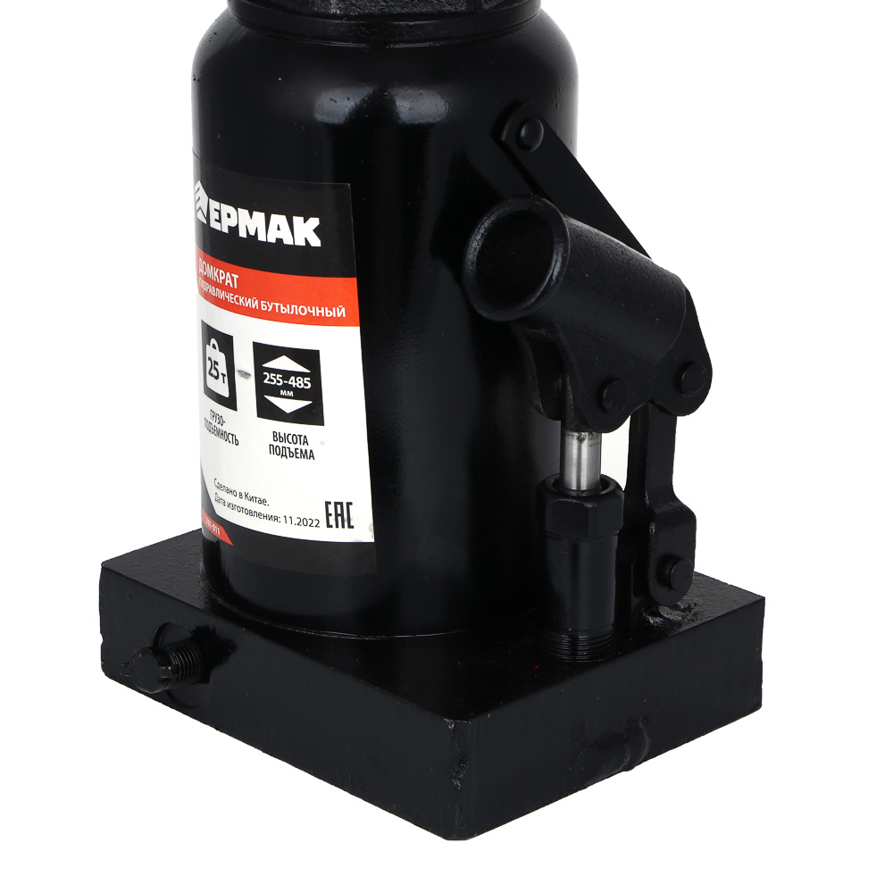 Домкрат гидравлический бутылочный ЕРМАК обладает грузоподъемностью 25 тонн. Минимальная высота подхвата составляет 25.5 см, максимальная - 48.5 см. Имеется клапан защиты от перегрузки.