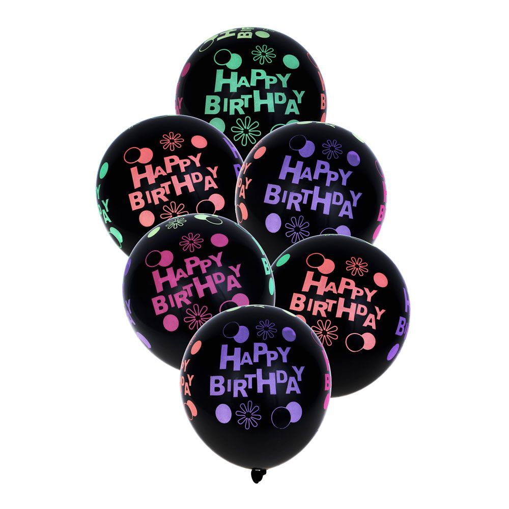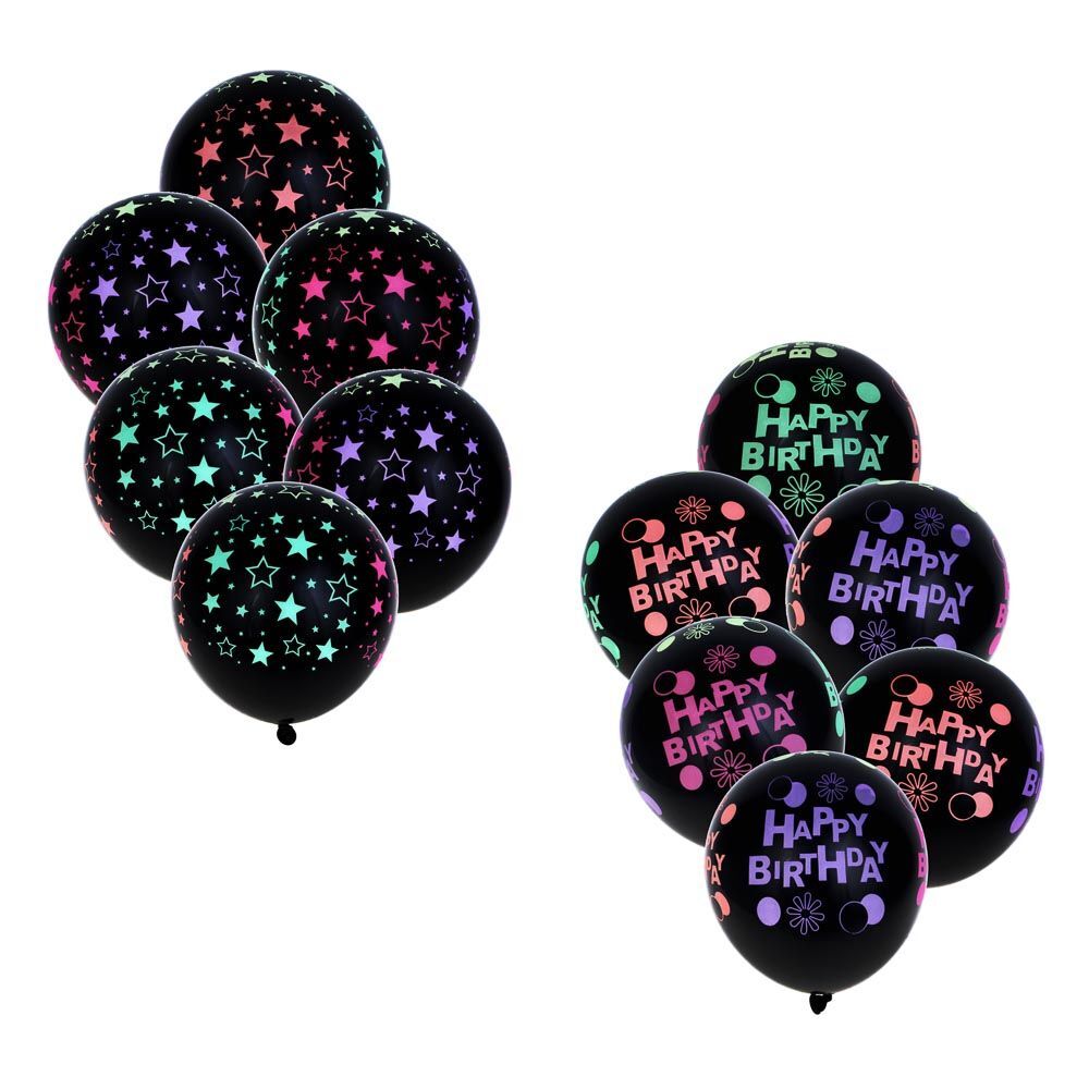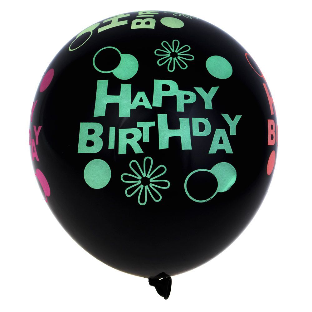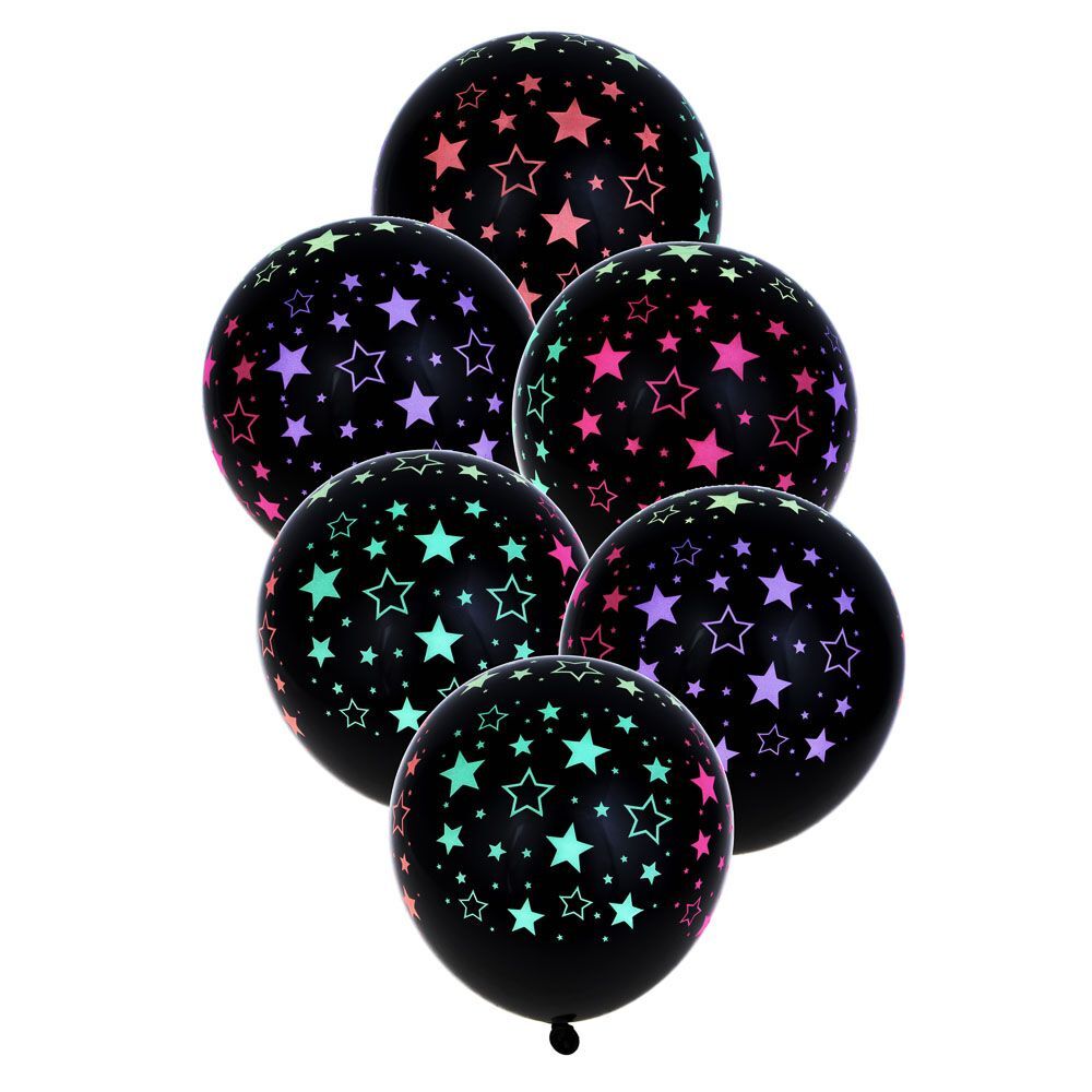 Новая тенденция в печати на шариках для воздуха и гелия - неоновой краской! Это очень классный вариант для тех, кто дома имеет неоновый свет или будет отмечать праздник в клубной обстановке. Данные шарики будут светиться ярким цветом в неоновых лучах. Шары из натурального латекса черного цвета с цветными рисунками. Внимание: просто в темноте не светятся! Набор включает 6 черных шаров размером 12 дюймов.
