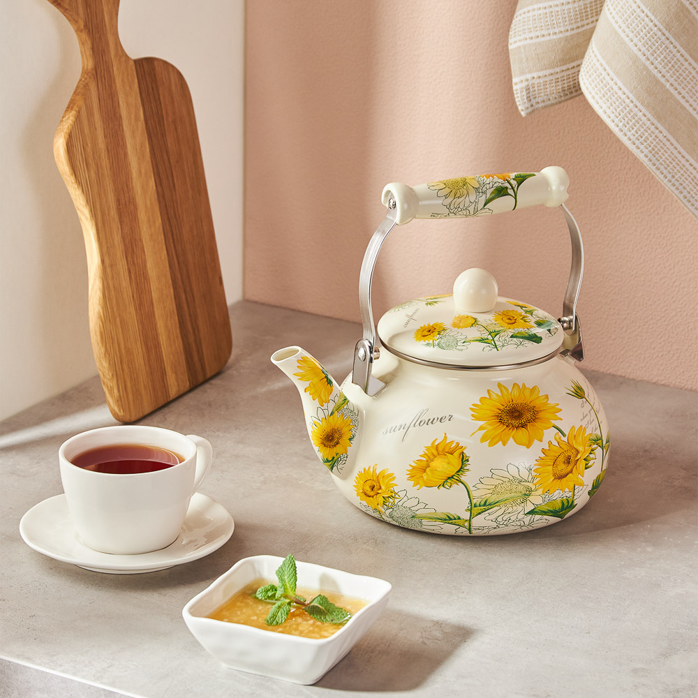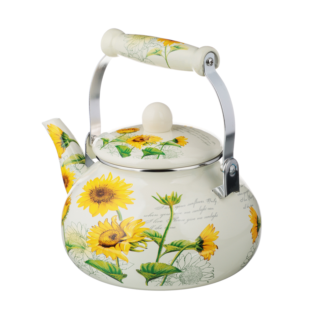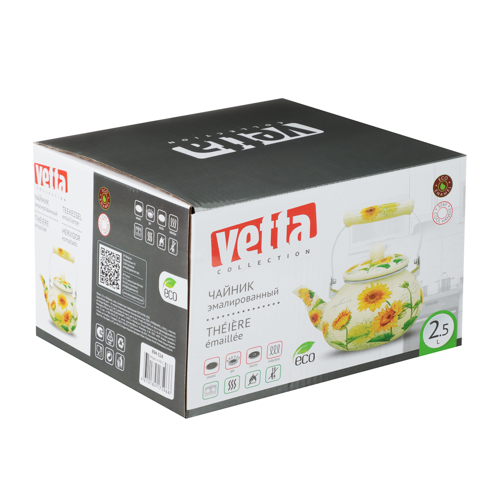 Нужна безопасная, качественная и красивая посуда для кухни? Эмалированный чайник Vetta «Подсолнухи» отвечает всем заявленным критериям. Идеально гладкая поверхность легко очищается от загрязнений, исключает размножение бактерий.Преимущества эмалированных чайников Vetta:• эмаль — гигиенический материал, исключающий размножение бактерий;• литраж — 2,5 литра — идеально для 3-4 человек;• подходит для всех типов плит, включая индукцию;• крышка с глубокой посадкой обеспечивает герметичность и быстрое закипание воды;• длинный удобный носик изогнутой формы предотвращает проливание жидкости;• надежная ручка не деформируется под воздействием высокой температуры.