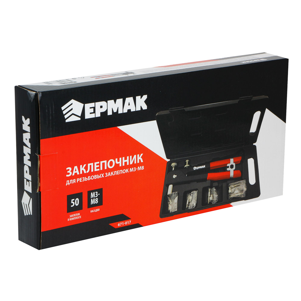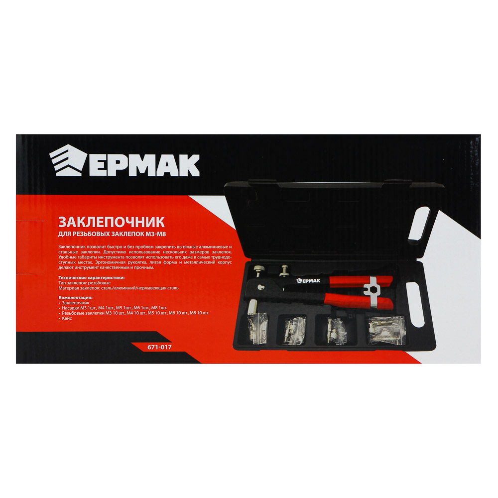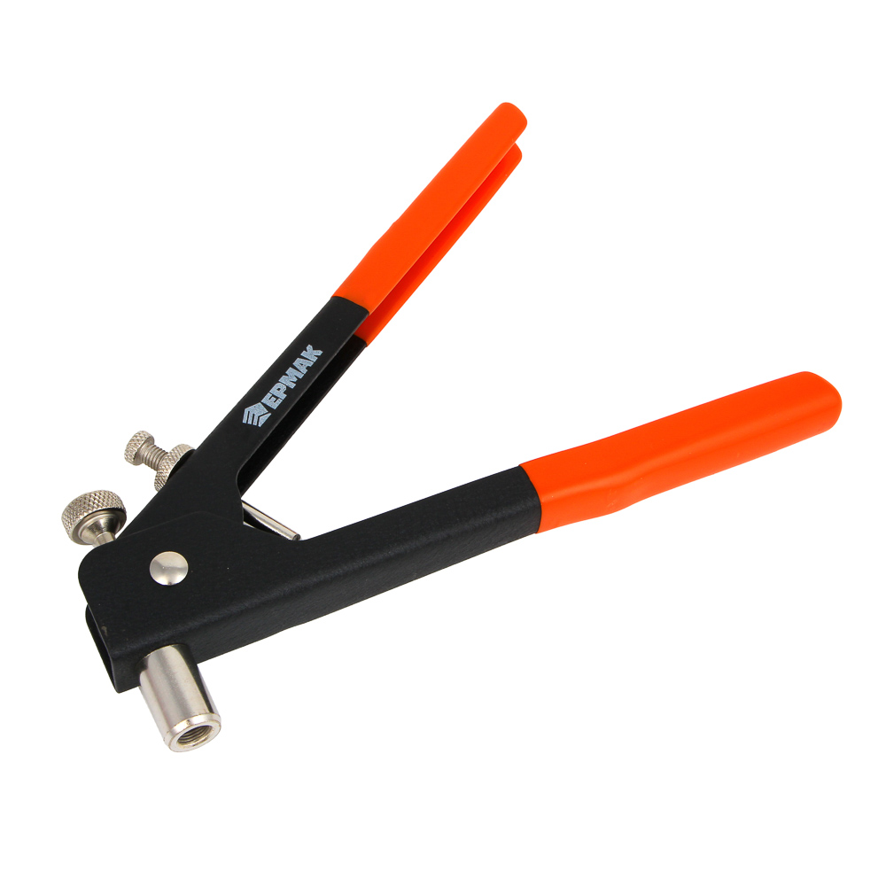Заклепочник для резьбовых заклепок ЕРМАК двуручный служит для быстрого и удобного скрепления между собой различных материалов при помощи заклепок с резьбой. • Заклепочник изготовлен из качественных материалов, поэтому отличается высокой прочностью и устойчивостью к износу.• Рукоятки не скользят в ладонях.• Инструмент подходит для стальных и алюминиевых заклепок.