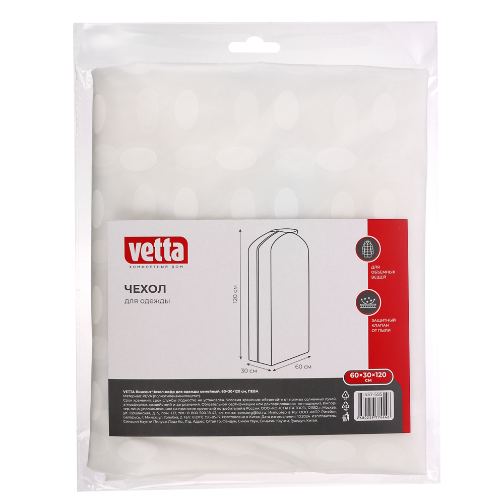 Чехол-кофр для одежды семейный VETTA "Винсент" предназначен для хранения верхней одежды – курток, пальто, плащей, а также деловых костюмов и платьев. Прекрасно защищает одежду от пыли и сминания. Замок-молния по всей длине чехла обеспечивает беспрепятственный доступ к гардеробу без необходимости снятия чехла с вешалки. Прозрачное окошко позволяет быстро найти нужную вещь.
