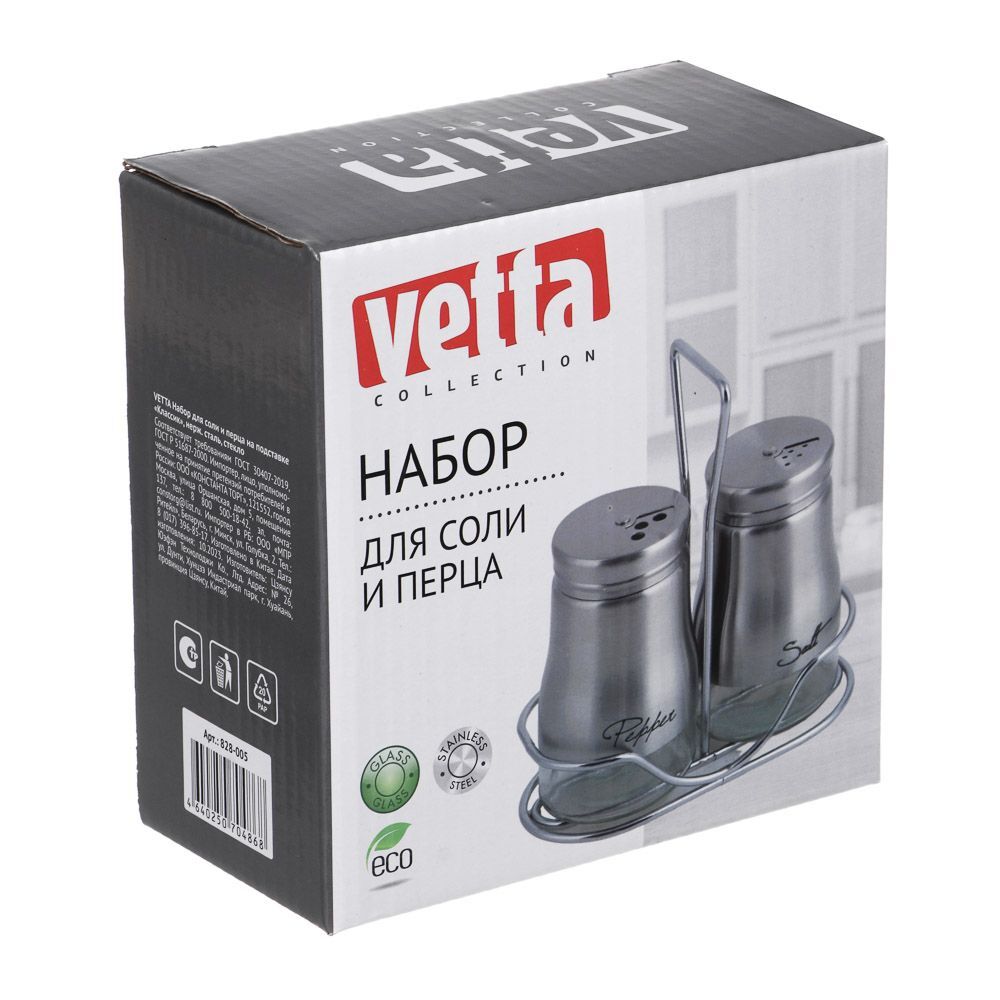 Набор VETTA состоит из двух солонок, выполненных из нержавеющей стали и стекла, а также подставки для них. Солонки имеют форму цилиндра с закругленными краями и крышкой, которая плотно закрывается для сохранения свежести соли. Набор станет не только функциональным элементом на вашей кухне, но и стильным аксессуаром, который украсит любой стол.