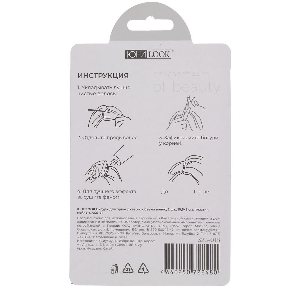 Зажимы для прикорневого объёма ЮНИLOOK являются прекрасной альтернативой горячим щипцам и плойкам. Они просты в применении, не травмируют волос, не образуют заломов и не требуют каких-либо дополнительных средств. Достаточно лишь закрепить их у корней и высушить феном, либо дать им высохнуть естественным путем. Для достижения долгосрочного эффекта можно применять различные укладочные средства – муссы, пенки, и т.д., либо использовать перманентные составы для долговременной укладки волос.