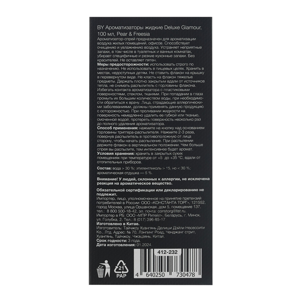 Создайте в своем доме атмосферу утонченной элегантности с помощью спрея для дома BY Deluxe Glamour, объемом 100 мл, в аромате Pear & Freesia. Этот изысканный аромат воплощает гармоничное сочетание свежести и чувственности. Сочные ноты груши и бергамота наполняют пространство бодрящим и освежающим ароматом, а сладкие аккорды сливы и роскошной красной розы придают аромату глубину и насыщенность. Нежные оттенки ландыша и магнолии добавляют композиции утонченную легкость, создавая неповторимую атмосферу. Завершающие ноты мускуса и пачули дарят аромату теплый и стойкий шлейф, который оставляет незабываемое впечатление. Идеально подходящий для мгновенного создания уютной и изысканной атмосферы, этот спрей станет вашим незаменимым помощником в мире ароматного наслаждения.