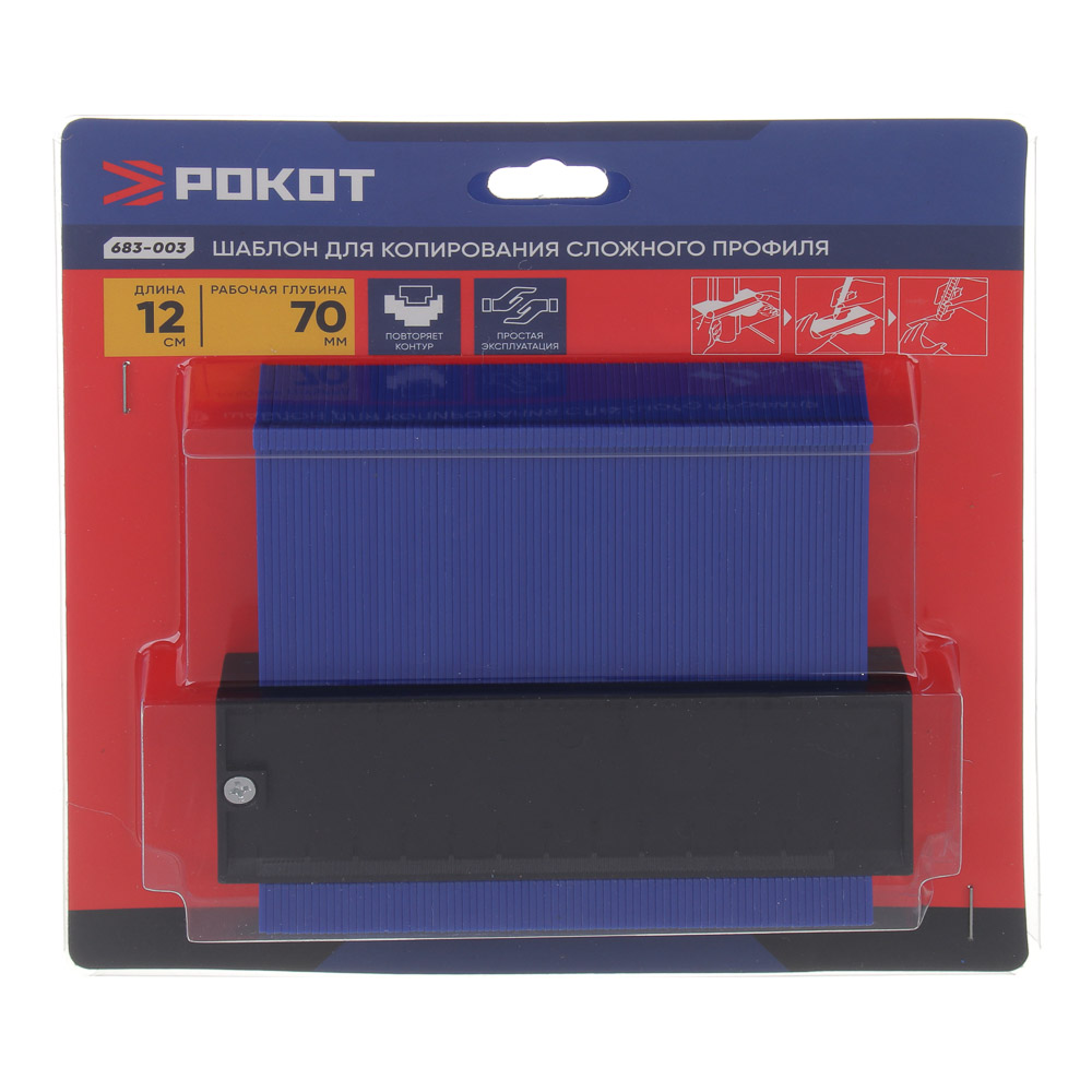 Пластиковый шаблон для копирования профиля РОКОТ предназначен для копирования и переноса контуров различных форм. Шаблон необходим для точной подрезки отделочных материалов (ламината, линолеума, кафельной плитки, гипсокартона и др.) при обходе труб водоснабжения, углов и других рельефных препятствий. Перенос контуров осуществляется при помощи выдвижных пластиковых пластин. Шаблон оснащен измерительной шкалой длиной 12 см.