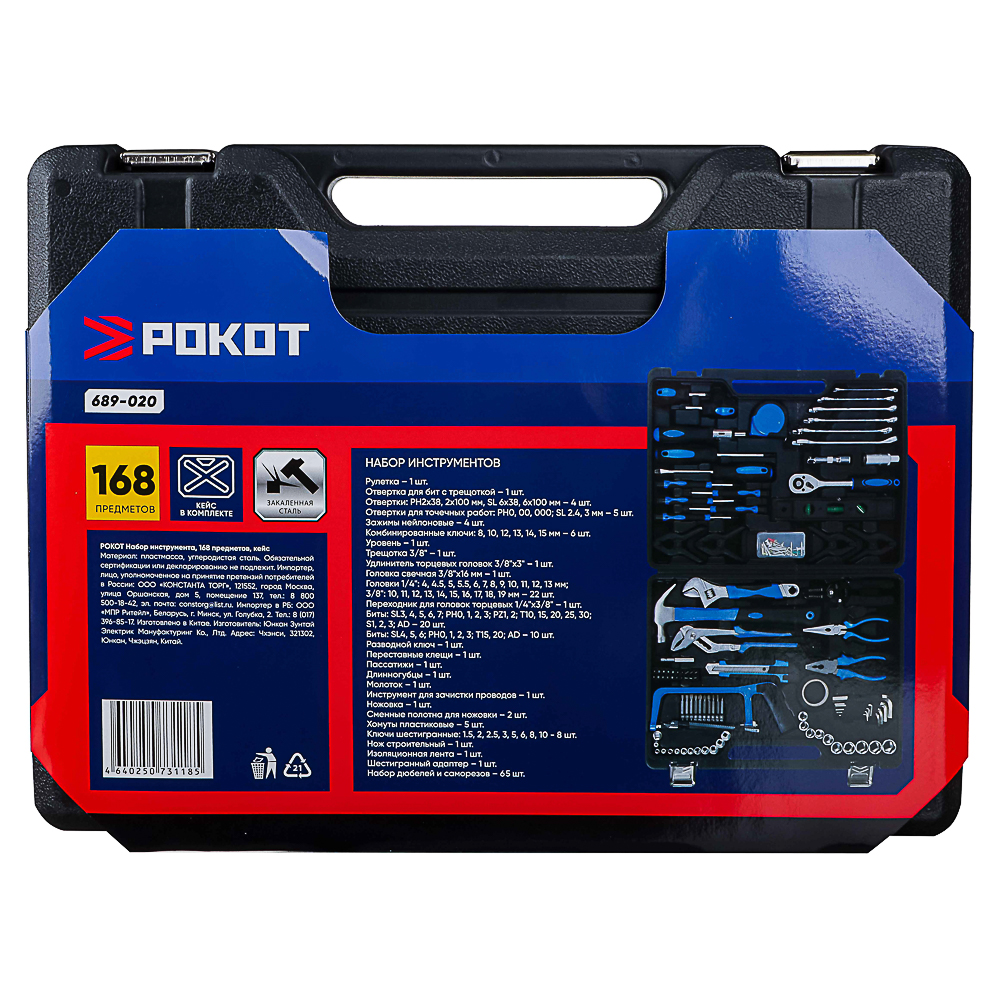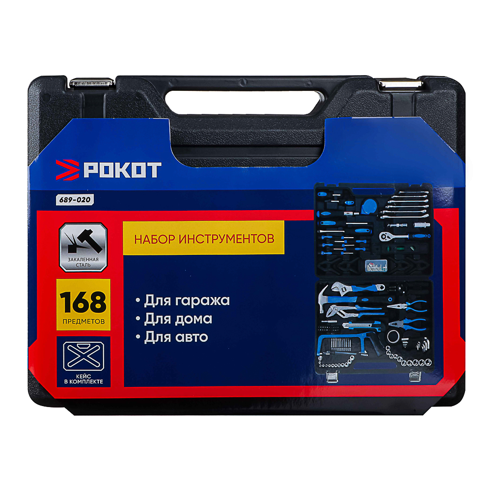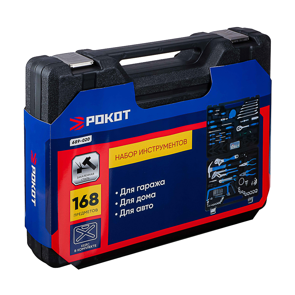 Набор инструмента РОКОТ из 168 предметов в жестком пластиковом кейсе – это качественные автоинструменты из закаленной стали, которые пригодятся не только в гараже, но и в доме для ремонта и монтажа электрических и сантехнических систем, сборки мебели. В составе набора: рулетка, отвертка для бит с трещоткой, отвертки PH2 и SL6, отвертки для точечных работ, нейлоновые зажимы, комбинированные ключи, уровень, трещотка, удлинитель, свечные головки, биты, переходники для торцевых головок, а также разводной ключ, переставные клещи, пассатижи, длинногубцы, молоток, инструмент для зачистки проводов, ножовка со сменными полотнами, пластиковые хомуты, шестигранные ключи, строительный нож, изолента, адаптер шестигранный и набор саморезов и дюбелей. Все предметы имеют качественное исполнение, надежные и прочные. Кейс выполняет функцию органайзера, облегчая поиск нужного инструмента, а также незаменим для хранения и транспортировки.