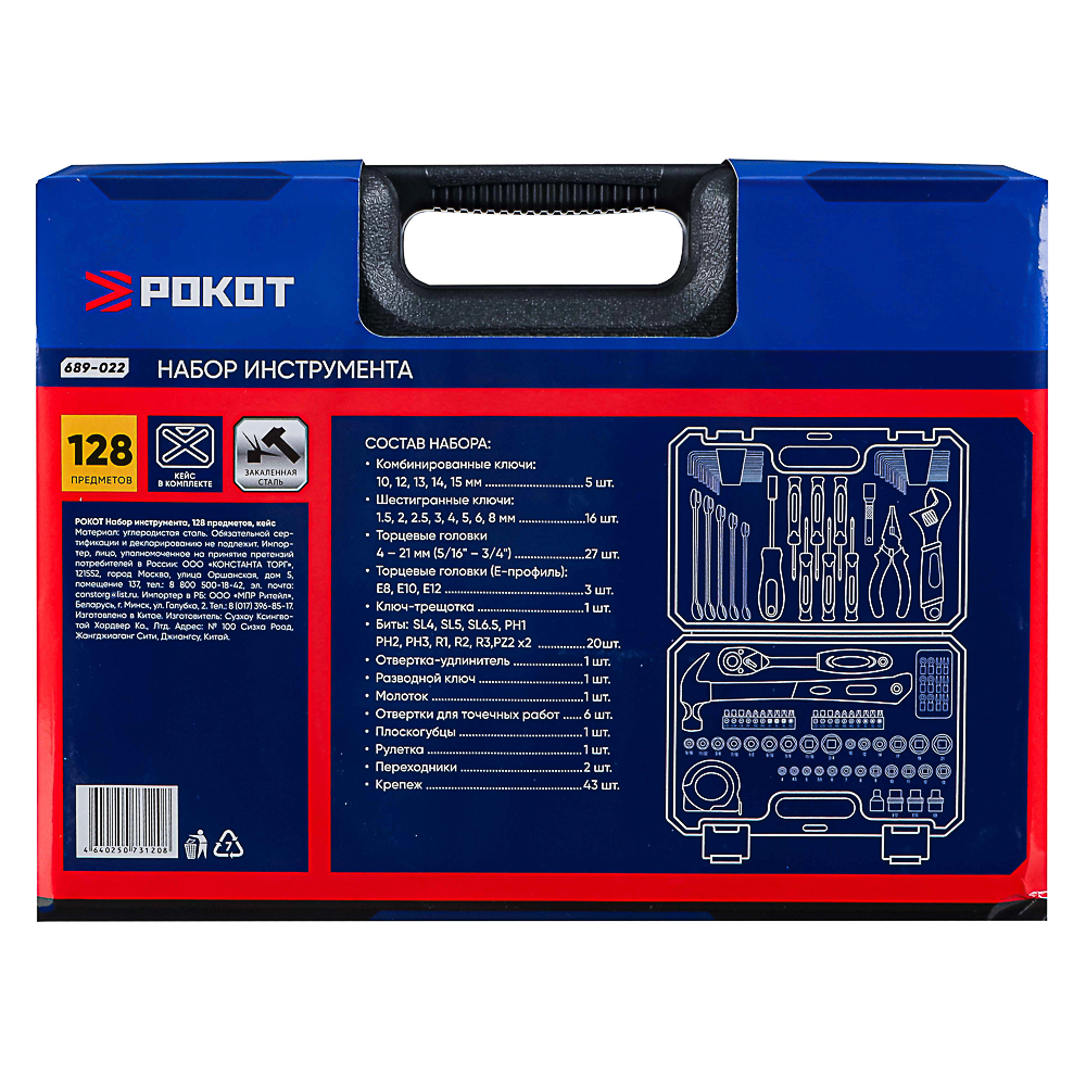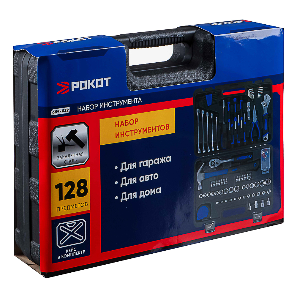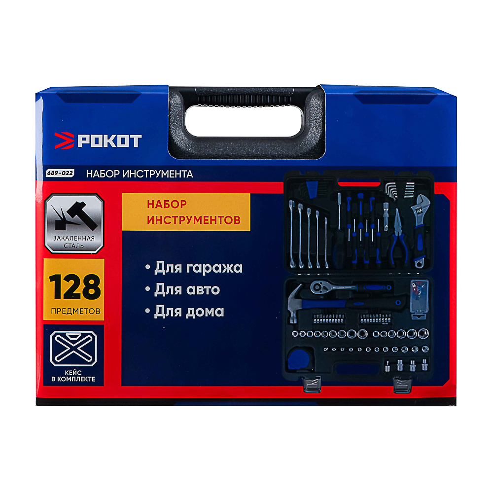 Набор инструмента РОКОТ из 128 предметов – это высококачественные инструменты из углеродистой стали для ремонта и монтажа. Могут использоваться для ремонта транспортных средств, а также для мелких работ по дому. В состав набора входят: 5 комбинированных ключей, 16 шестигранных ключей, 30 торцевых головок разных размеров и профилей, ключ-трещотка, биты, отвертка-удлинитель, разводной ключ, молоток, отвертки для точечных работ, плоскогубцы, рулетка, переходники, крепеж 43 шт. Каждый предмет в кейсе имеет свое место, что делает процесс использования максимально комфортным. Инструменты имеют большой запас прочности и износостойкости, поэтому прослужат долго.