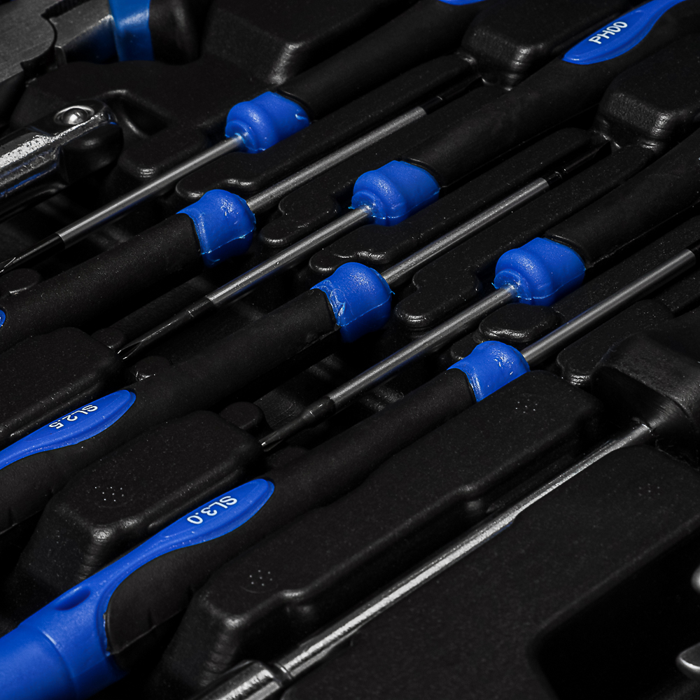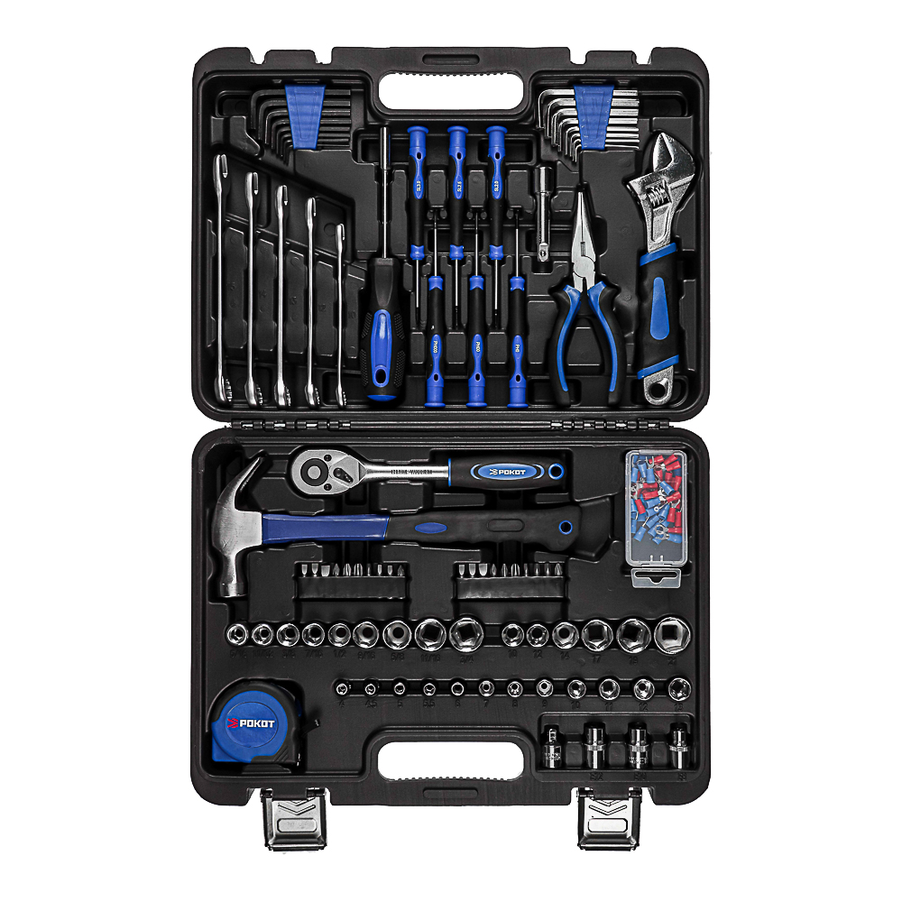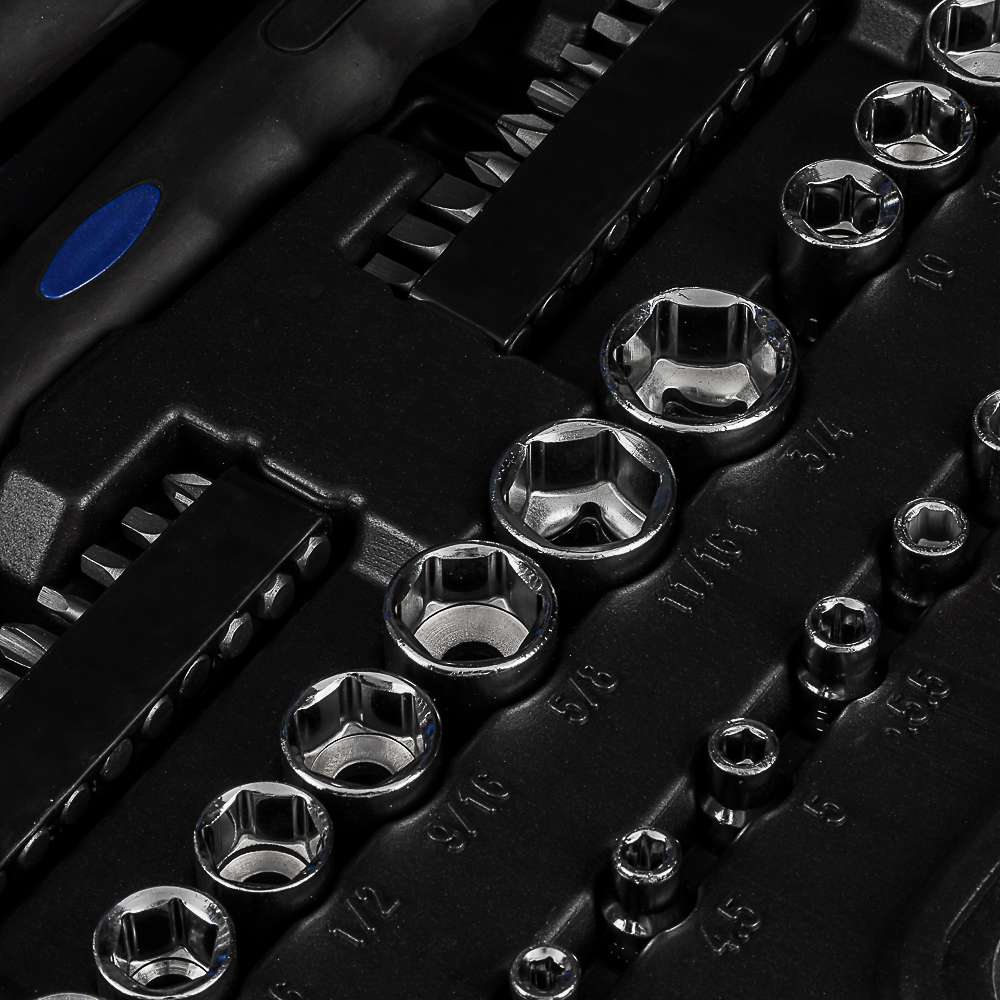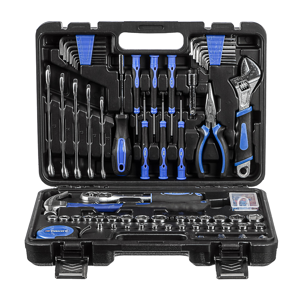 Набор инструмента РОКОТ из 128 предметов – это высококачественные инструменты из углеродистой стали для ремонта и монтажа. Могут использоваться для ремонта транспортных средств, а также для мелких работ по дому. В состав набора входят: 5 комбинированных ключей, 16 шестигранных ключей, 30 торцевых головок разных размеров и профилей, ключ-трещотка, биты, отвертка-удлинитель, разводной ключ, молоток, отвертки для точечных работ, плоскогубцы, рулетка, переходники, крепеж 43 шт. Каждый предмет в кейсе имеет свое место, что делает процесс использования максимально комфортным. Инструменты имеют большой запас прочности и износостойкости, поэтому прослужат долго.