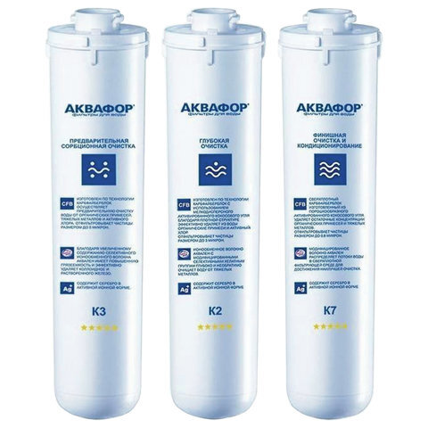 Комплект сменных модулей К3-K2-K7 надежно очищает воду от примесей, которые чаще всего встречаются в водопроводной воде. Воду можно использовать для приготовления детского питания, а также супов и напитков для всей семьи. Аквафор Кристалл К3–К2–К7 эффективно очищает воду, сохраняя ее минеральный состав. К3 — предварительная сорбционная очистка. • Осуществляет предварительную очистку воды от органических примесей, тяжелых металлов и активного хлора. • Отфильтровывает частицы размером от 5 микрон. • Имеет повышенную грязеемкость и эффективно удаляет коллоидное и растворенное железо. • Содержит серебро в активной ионной форме. К2 — глубокая сорбционная очистка. • Эффективно удаляет из воды органические примеси и активный хлор. • Отфильтровывает частицы размером от 3 микрон. • Ионообменное волокно AQUALEN™ с модифицированными селективными хелатными группами глубоко и необратимо очищает воду от тяжелых металлов. • Содержит серебро в активной ионной форме. К7 — финишная очистка и кондицио