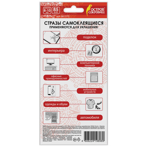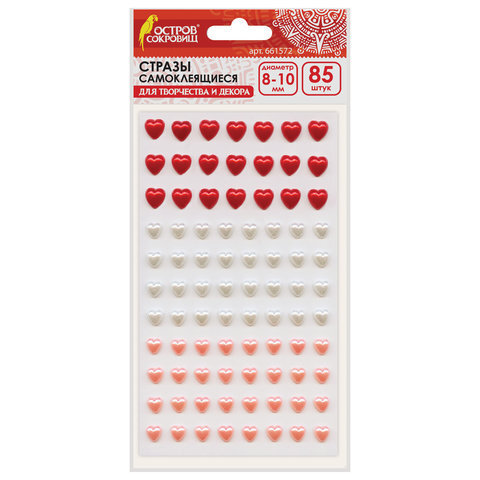 С помощью самоклеящихся страз ОСТРОВ СОКРОВИЩ можно декорировать поделки и аппликации, детали интерьера, одежду и гаджеты, реализовать самые смелые творческие идеи. Качественный клеевой слой обеспечит надежную фиксацию на любых поверхностях. Легко отделяются от подложки. Изготовлены из пластика на основе акрила. Выполнены в форме сердец в 3 завораживающих цветах. Предназначены для детей от 3 лет. Поставляются в пакете с европодвесом. В упаковке - 85 страз размером 8-10 мм. Общий вес - 100 г.