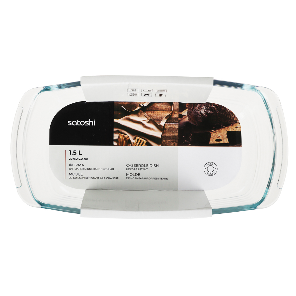 Форма для запекания жаропрочная прямоугольная, с ручками SATOSHI из стекла размером 27х14х7,2 см и объемом 1,5 л – универсальное решение для приготовления повседневных и праздничных блюд в духовке. Глубокая форма подходит для запекания мяса, овощей, рыбы, приготовления омлетов, запеканок и других блюд в соусе и в собственном соку. Толстое стекло не трескается, не впитывает запахи и не царапается. Обеспечивает равномерный нагрев, не допуская пригорание, поэтому блюда получаются полезными и вкусными.