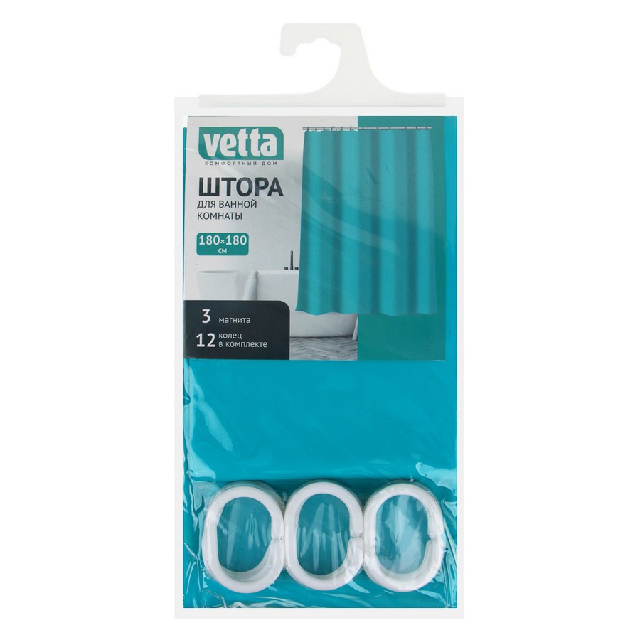 Шторка для ванной, ПЕВА, 180x180см, с магнитами, бирюзовая
