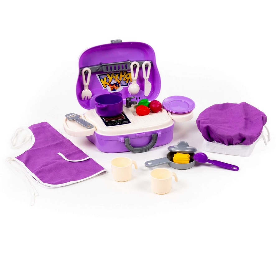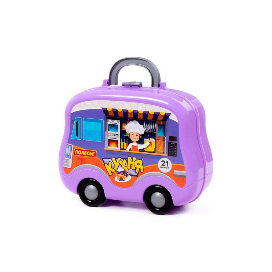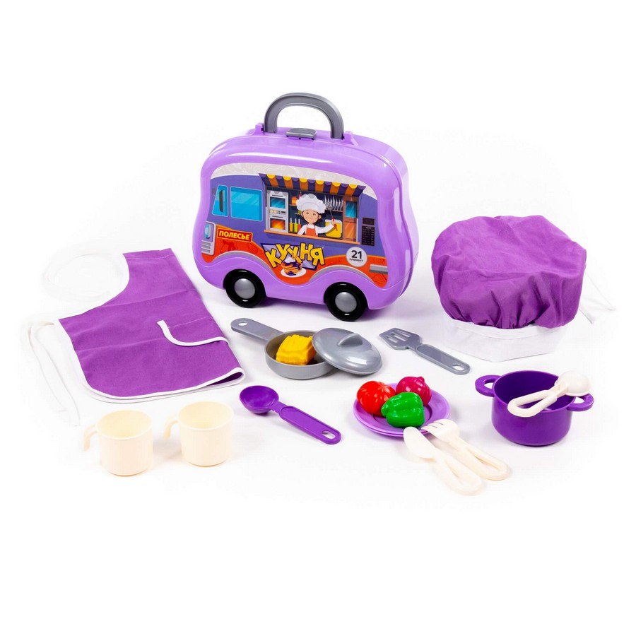 Размер в упаковке 266х98х217 мм С ярким набором детской посуды от компании «Полесье» у ребенка появится возможность придумать ещё больше интересных сюжетов для весёлых игр одному или в дружной компании. Все элементы набора (21 шт.) помещены в оригинальный чемоданчик на колесах. В комплект входит: фартук с чепчиком; варочная поверхность с мойкой; боковые полки (2 шт.); полка-держатель для столовых приборов; набор продуктов (картофель фри, лук, перец, помидор); книга для рецептов; набор наклеек; столовые приборы (вилка, нож, ложка, черпак, лопатка); кастрюля с крышкой; сковорода; тарелка (2 шт.); кружка (2 шт.).