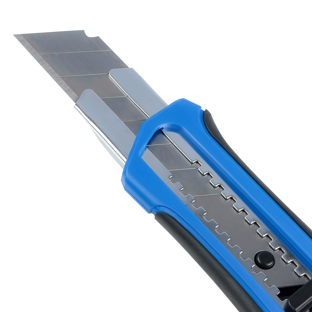 Сегментный нож HEADMAN шириной 25 мм с прямоугольным стоппером – незаменимый инструмент для отделочных и строительных работ. Идеально справляется с тканью, бумагой, картоном, проволокой и проводами, а также подходит для резки более плотных материалов: гипсокартона, пластика. Оснащен металлической направляющей для защиты корпуса. Лезвие состоит из 6 сегментов, которые легко обламываются после износа. Качественная заточка делает изделие долговечным и комфортным в работе.