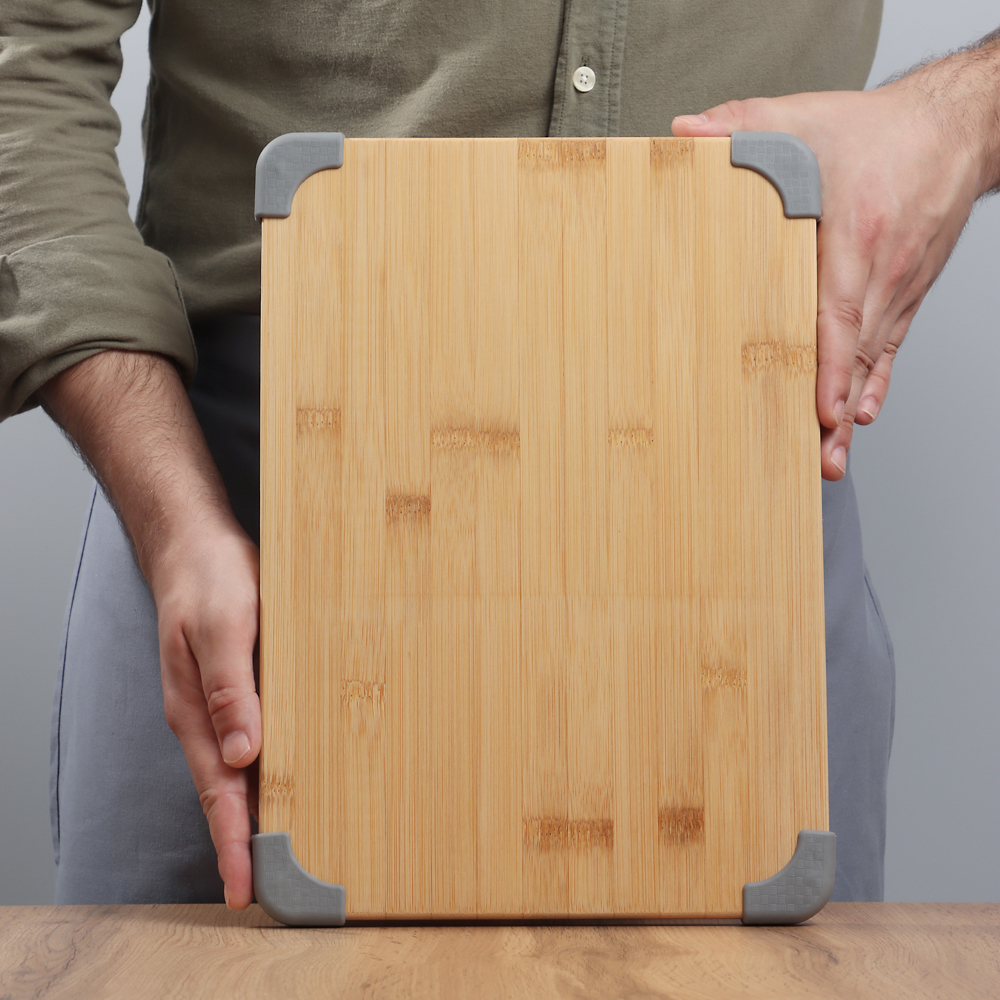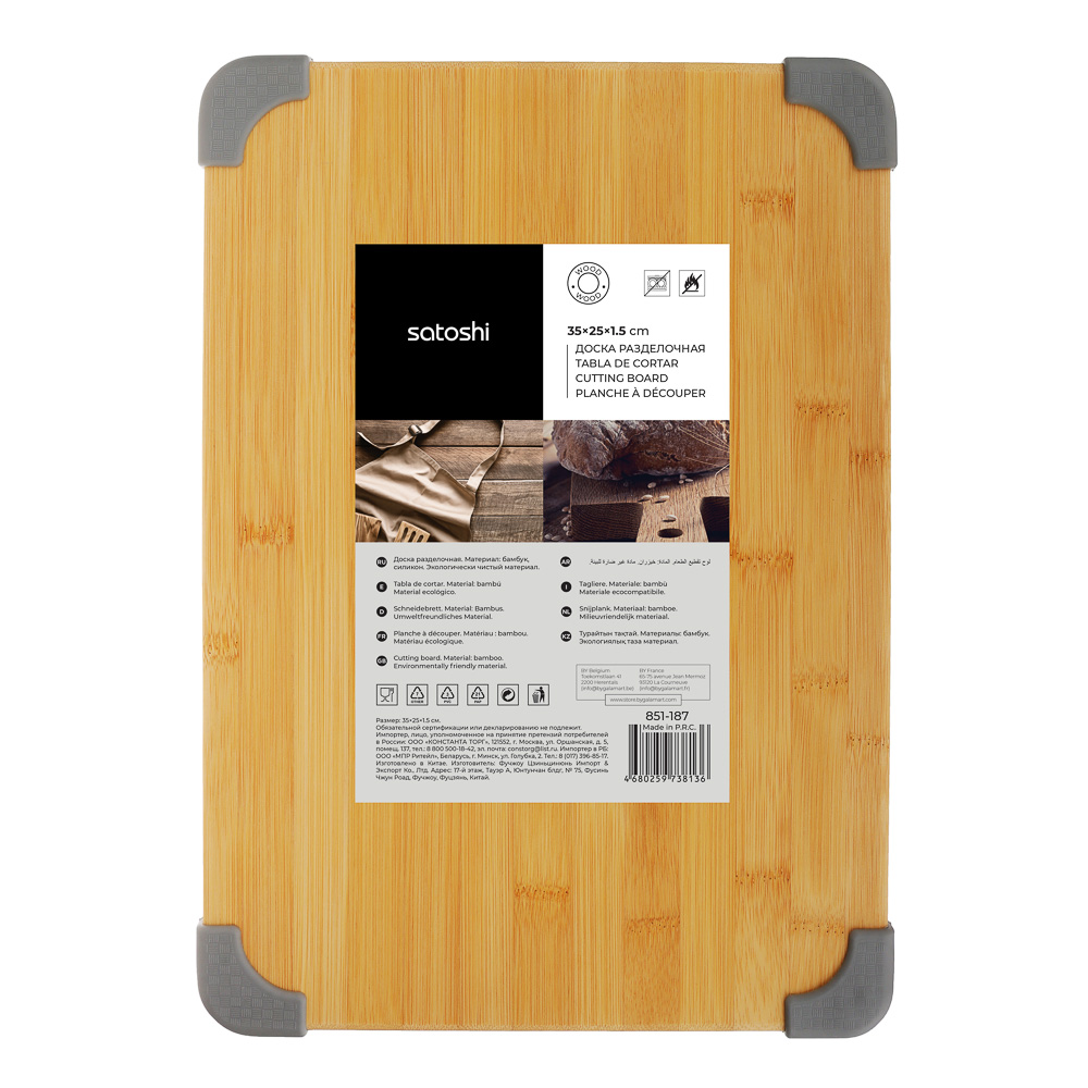 Разделочная доска является необходимым атрибутом любой кухни. Доски из бамбука фирмы Satoshi отличаются повышенной износостойкостью. Благодаря силиконовым уголкам доска будет устойчиво держаться на любой поверхности. После использования помыть в теплой воде и хорошо вытереть. Не помещайте доску в посудомоечную машину. Интересный дизайн украсит вашу кухню.