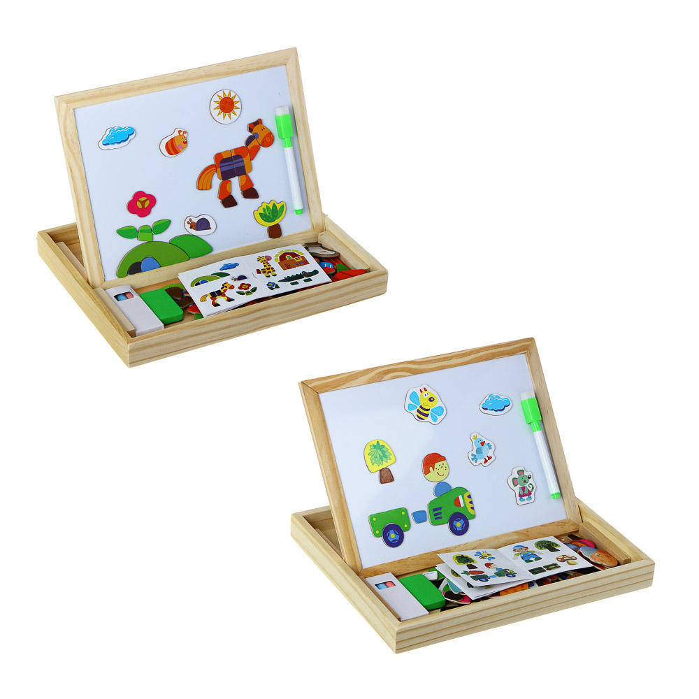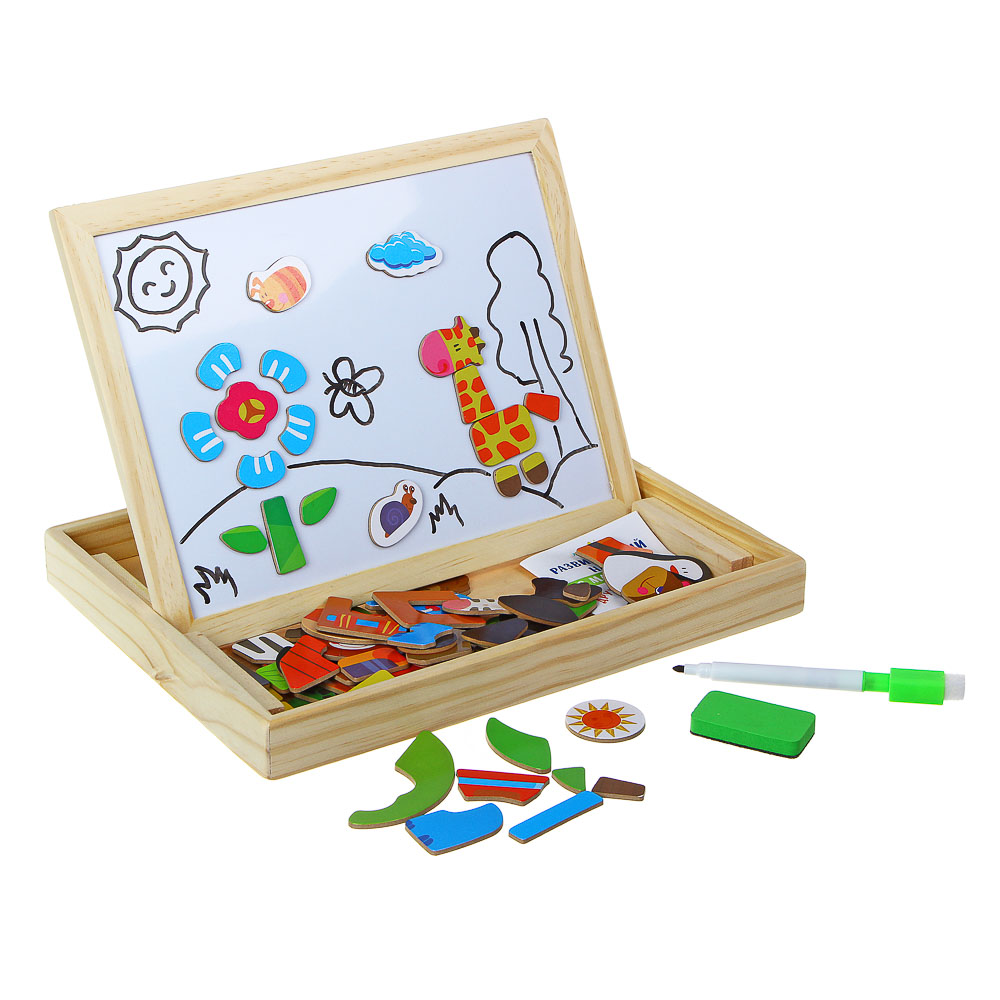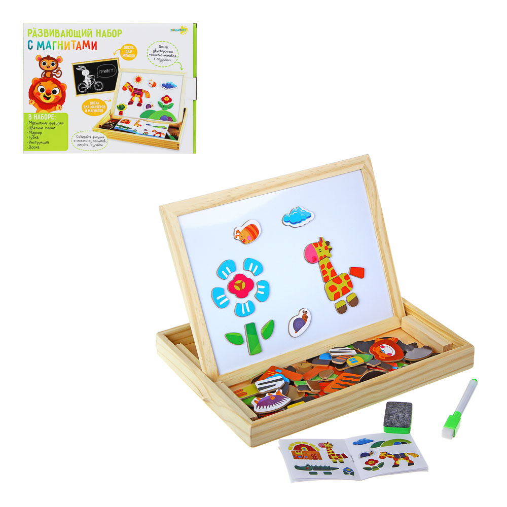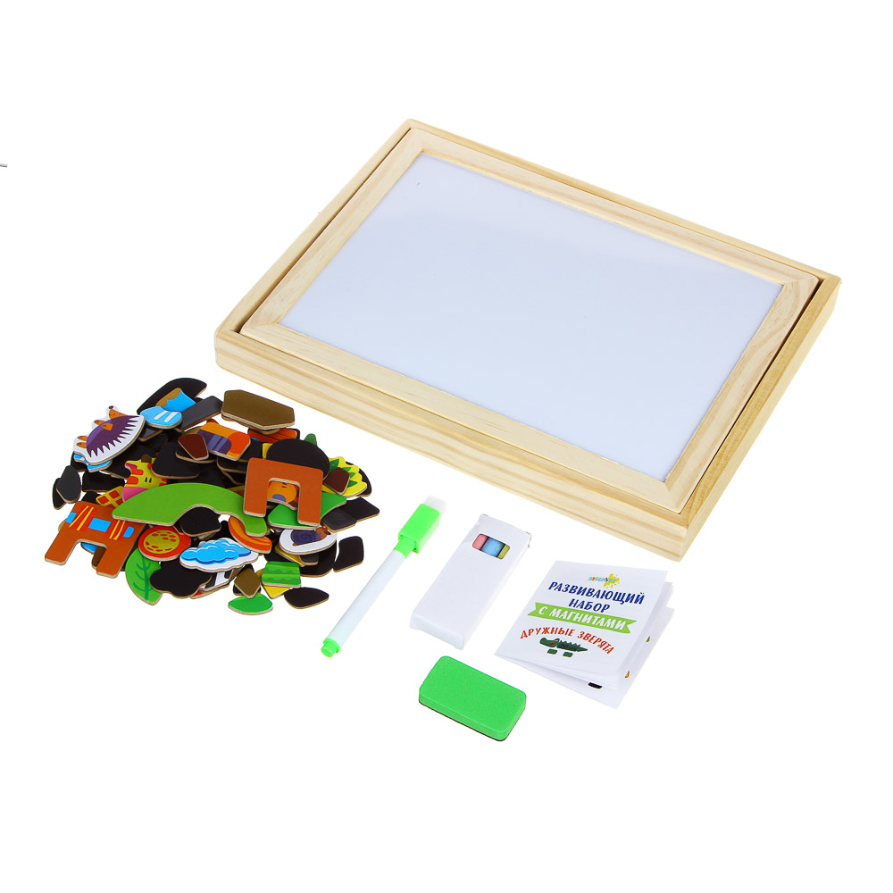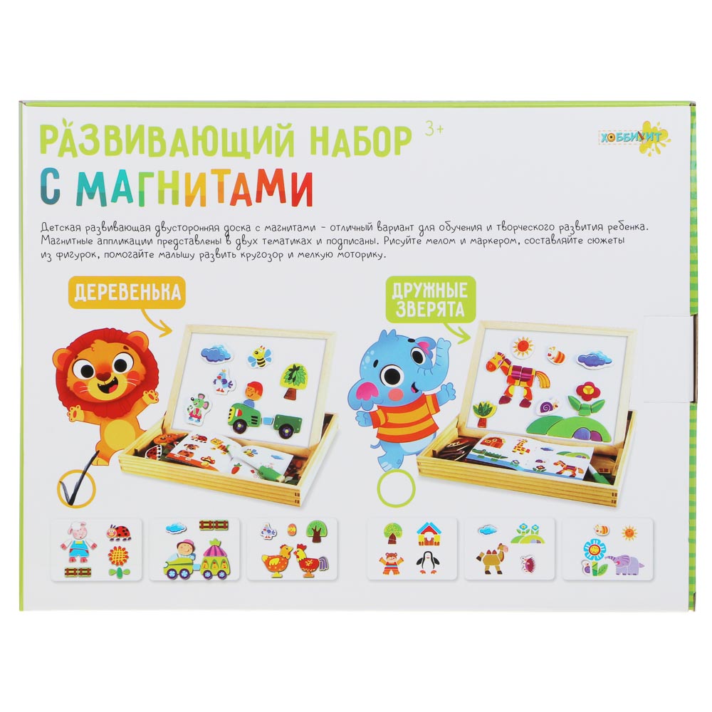 Развивающий набор от ХОББИХИТ представляет собой многофункциональную развивающую игрушку, которая долго не наскучит ребёнку. Двусторонняя магнитно-маркерная доска позволяет разнообразить досуг — рисовать мелками или составлять картинки из магнитов. На доске можно собирать фигуры, сюжеты, а также после дополнить при помощи маркера недостающие элементы для создания картины. Фантазии ребенка не будет предела с таким набором. Игра развивает у ребенка мышление, логику, воображение. Внутри: магниты, цветные мелки, маркер, губка, инструкция. В ассортименте 2 дизайна: "Деревенька" и "Дружные зверята".