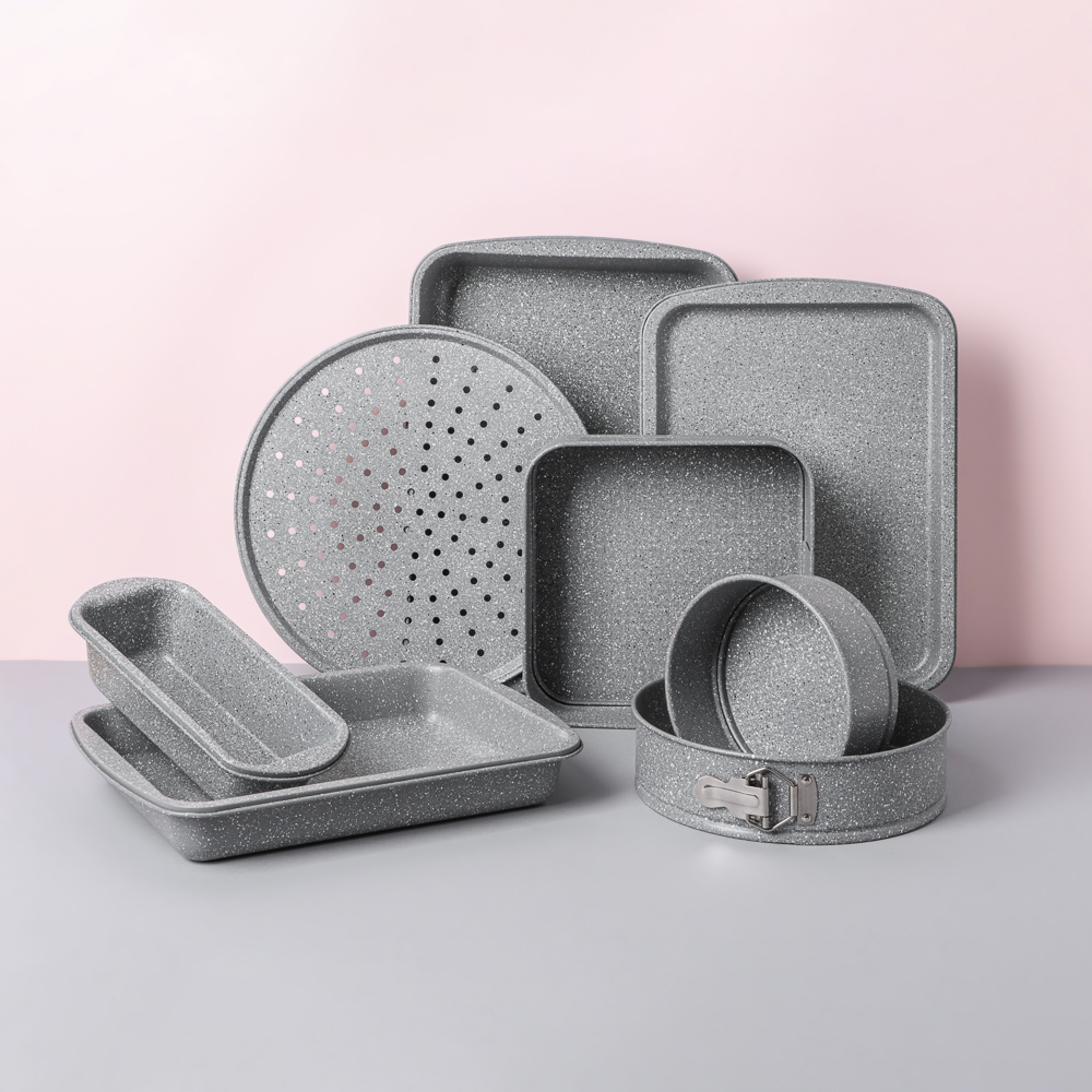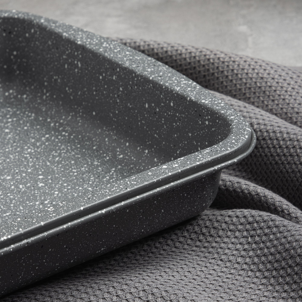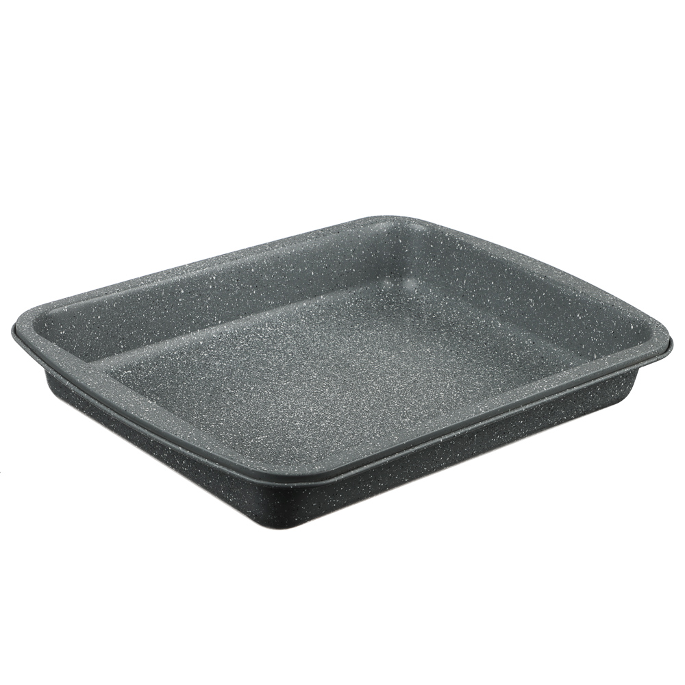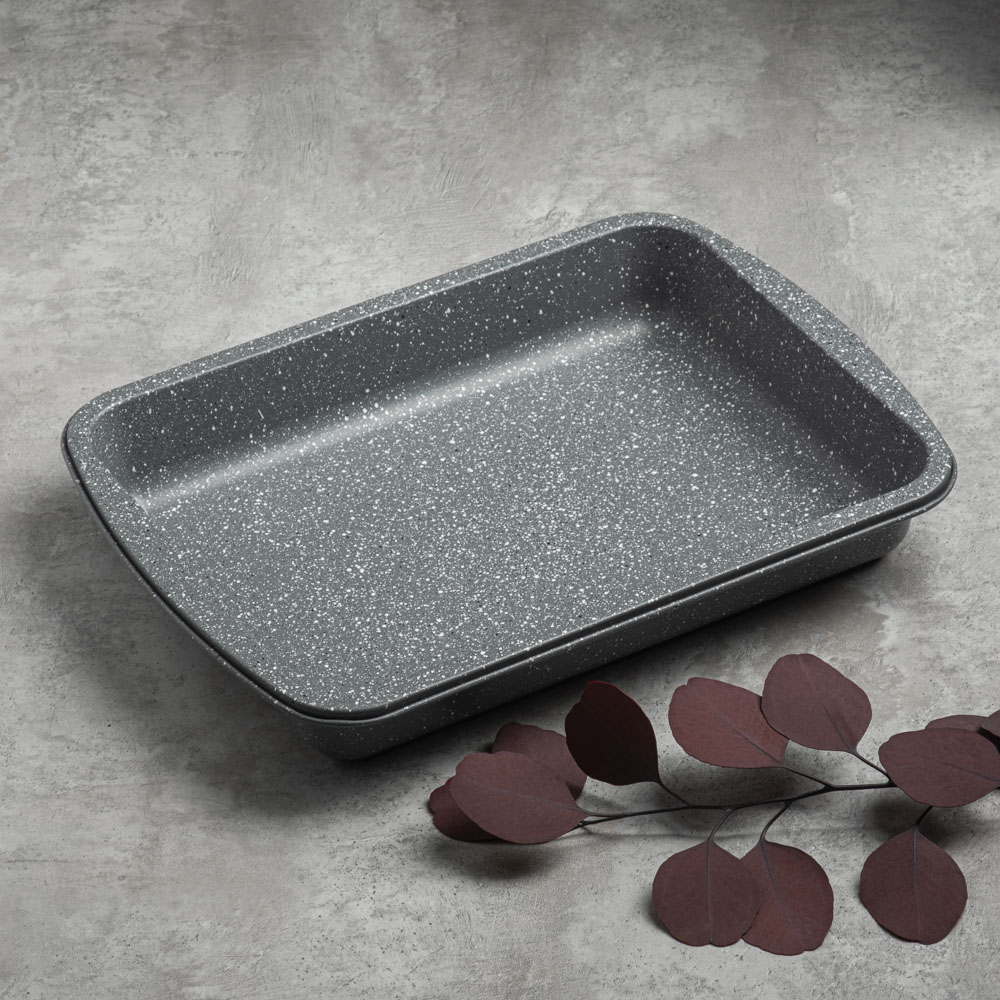 Серия посуды для духовки “Буко” от бренда Satoshi получила свое наименование в честь популярного итальянского блюда из томленой телятины. Для приготовления такого изысканного деликатеса требуется много времени и отличная посуда, которая не позволит мясу пригореть. Именно поэтому посуда этой коллекции изготовлена из толстой углеродистой стали и имеет уникальное антипригарное покрытие “мрамор”, к которому не прилипает пища, оно легко очищается и очень экологично. Цвет серии: серый мрамор с вкраплениями, смотрится сдержанно и изысканно, в такой посуде можно даже подавать блюдо к столу.В коллекции “Буко” Satoshi представлены несколько вариантов противней различного размера и формы, в том числе специальные противни для пиццы и хлеба.