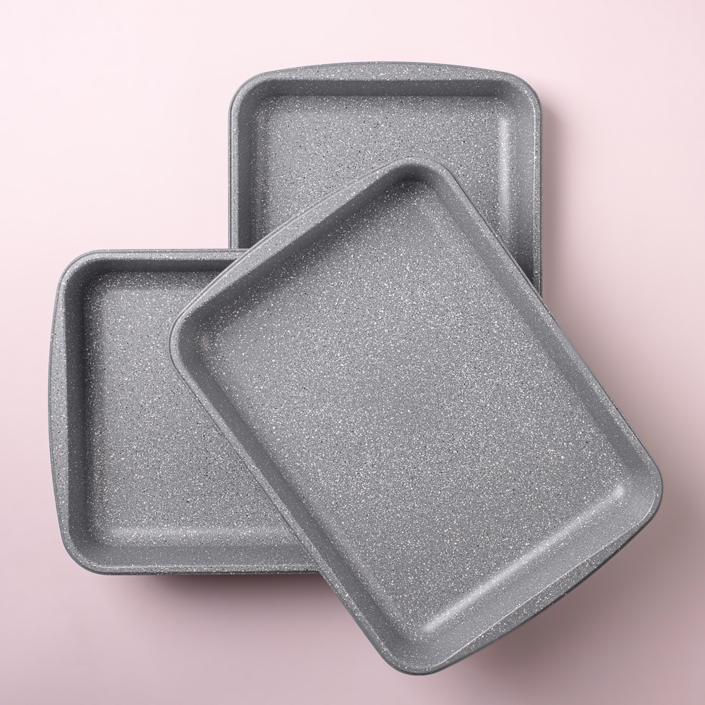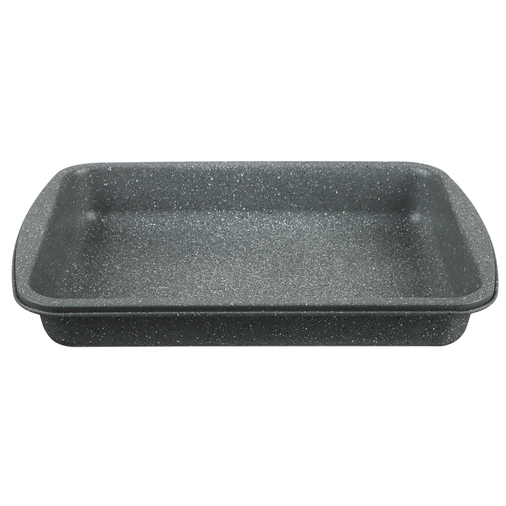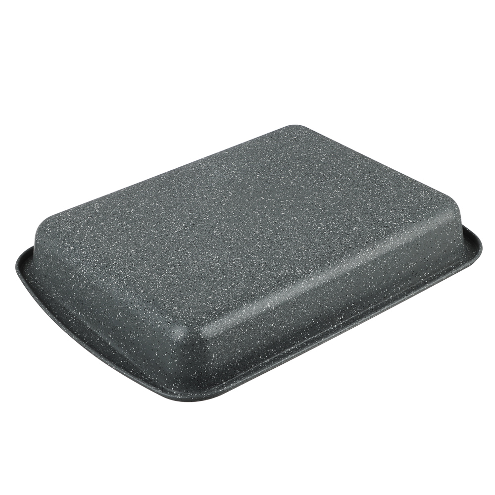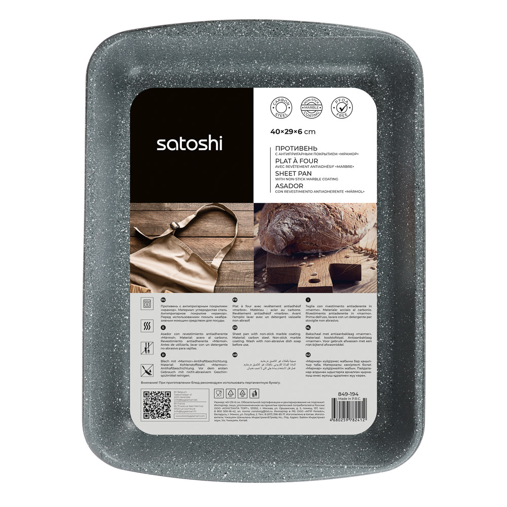 Серия посуды для духовки “Буко” от бренда Satoshi получила свое наименование в честь популярного итальянского блюда из томленой телятины. Для приготовления такого изысканного деликатеса требуется много времени и отличная посуда, которая не позволит мясу пригореть. Именно поэтому посуда этой коллекции изготовлена из толстой углеродистой стали и имеет уникальное антипригарное покрытие “мрамор”, к которому не прилипает пища, оно легко очищается и очень экологично. Цвет серии: серый мрамор с вкраплениями, смотрится сдержанно и изысканно, в такой посуде можно даже подавать блюдо к столу.В коллекции “Буко” Satoshi представлены несколько вариантов противней различного размера и формы, в том числе специальные противни для пиццы и хлеба.