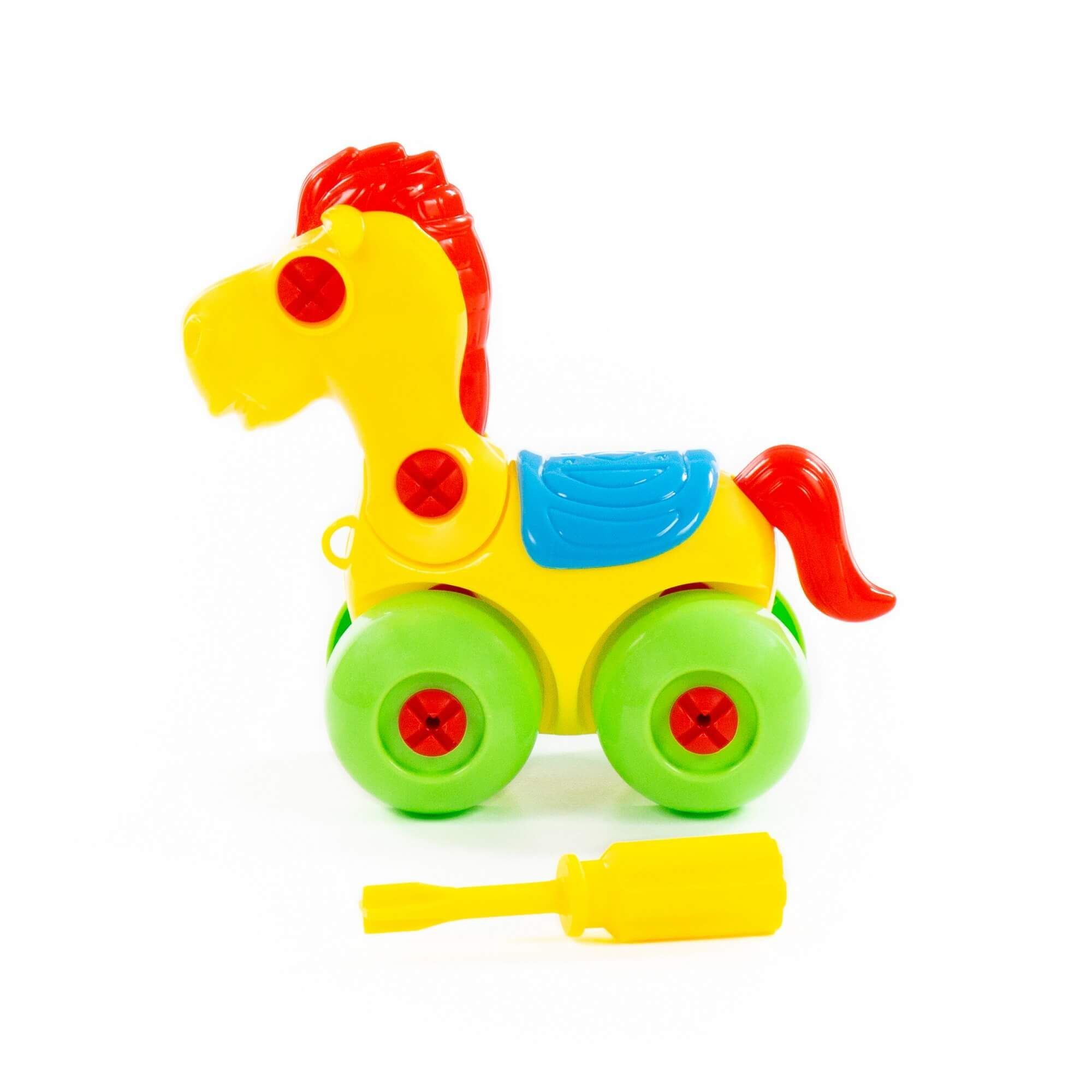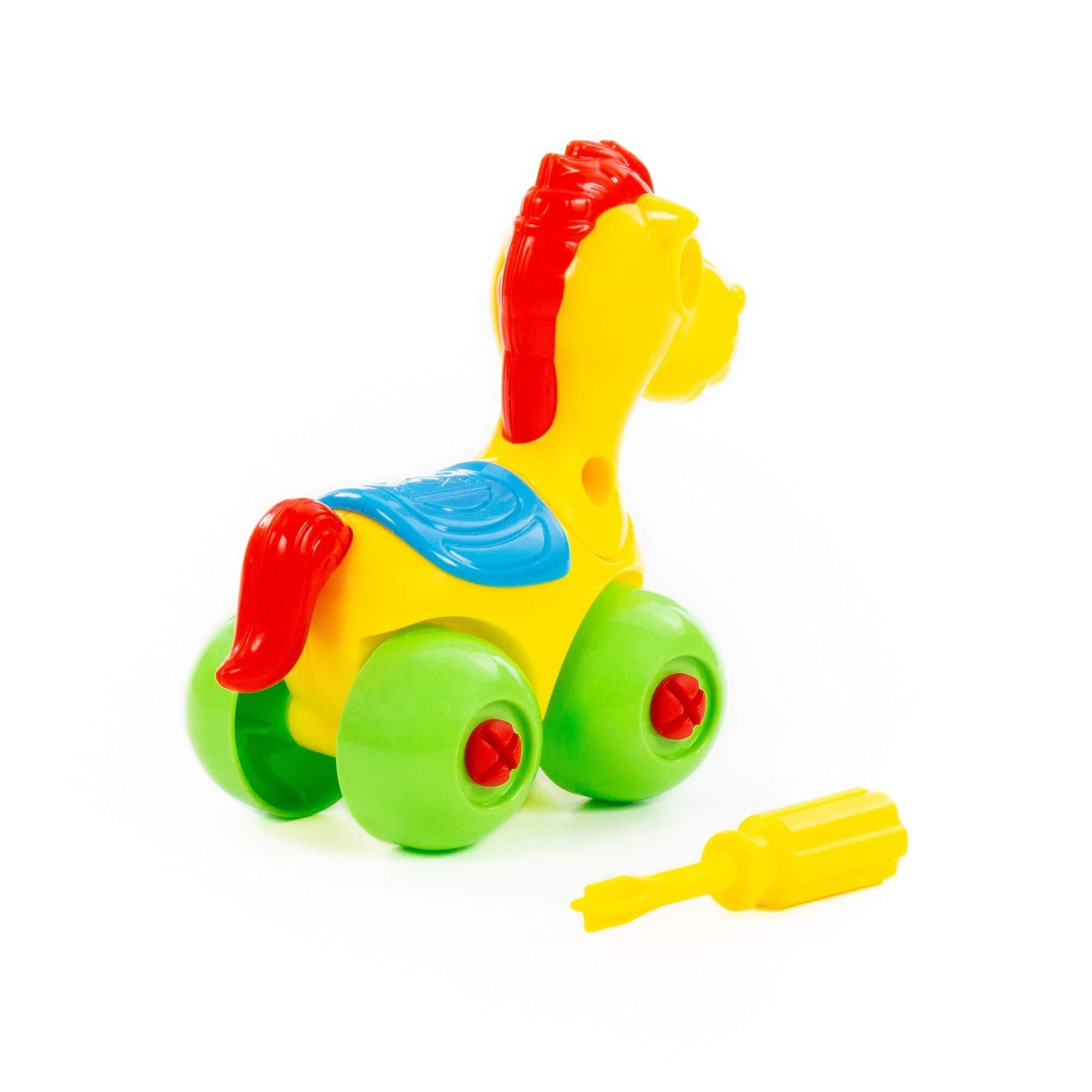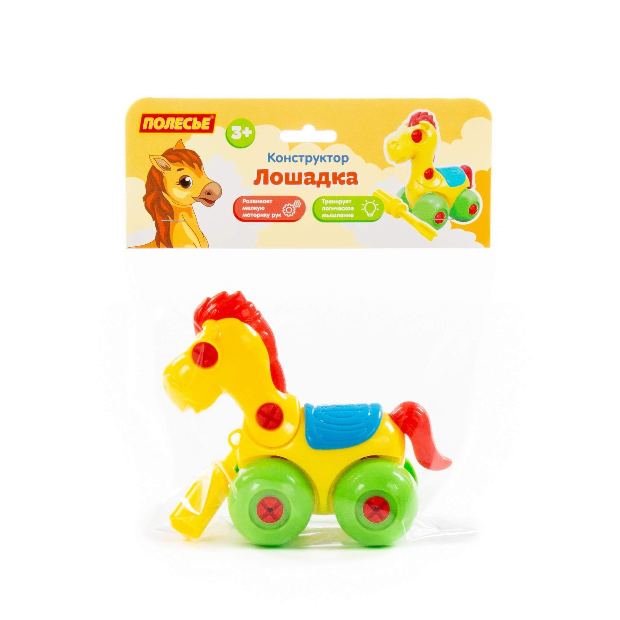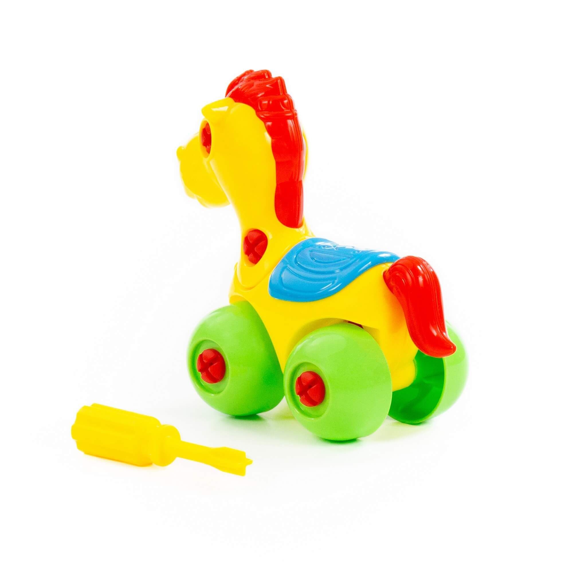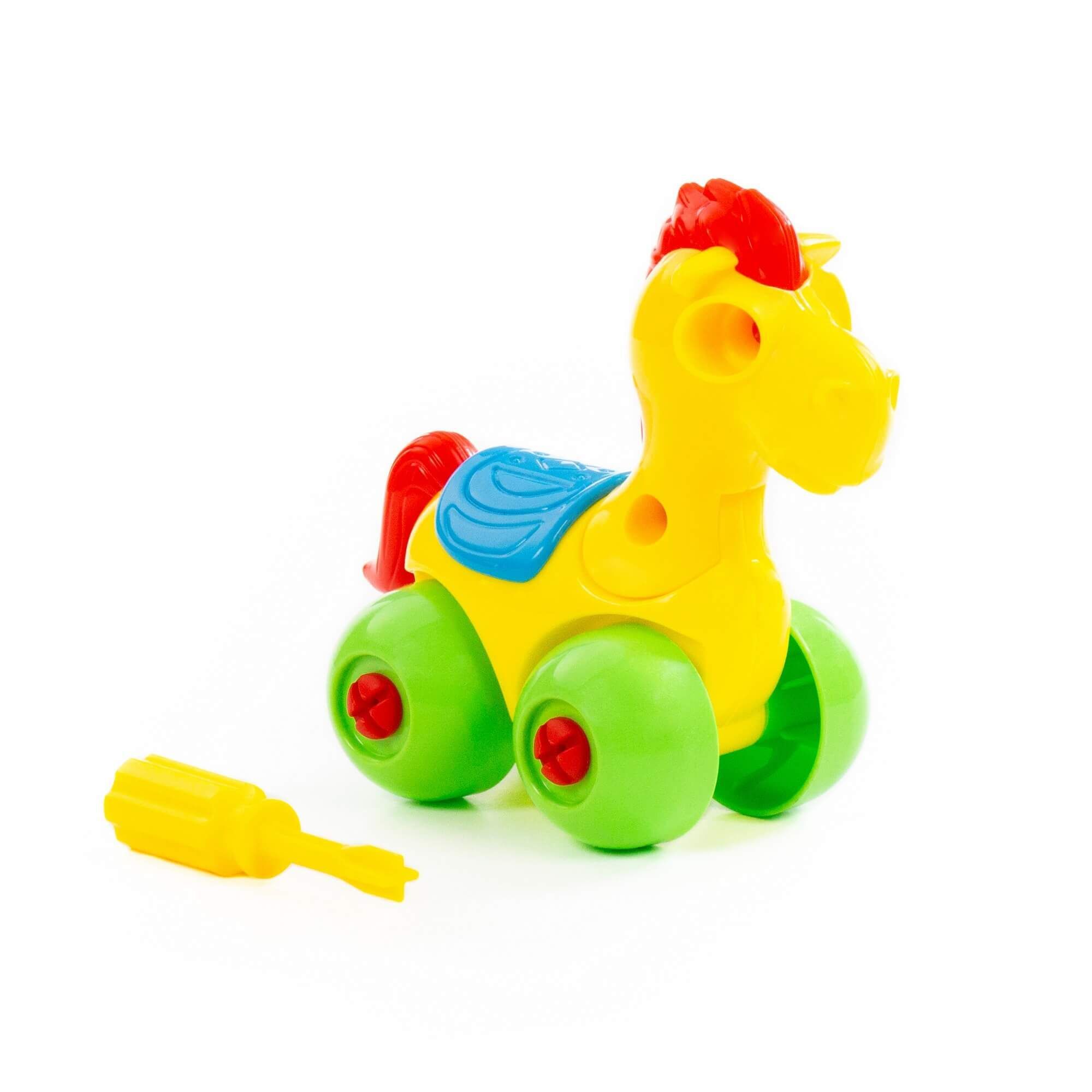 С помощью конструктора «Лошадка» ребёнок не просто знакомится с миром животных, а может многократно собирать и разбирать игрушку по элементам. Для этого в наборе предусмотрена специальная отвёртка. Игрушка на колёсах, поэтому ею можно играть как машинкой. Такой конструктор прекрасно подходит для воспитания малыша. С ним ребёнок изучает цвета и формы, у него развиваются усидчивость, логическое мышление, мелкая моторика рук и координация движений.