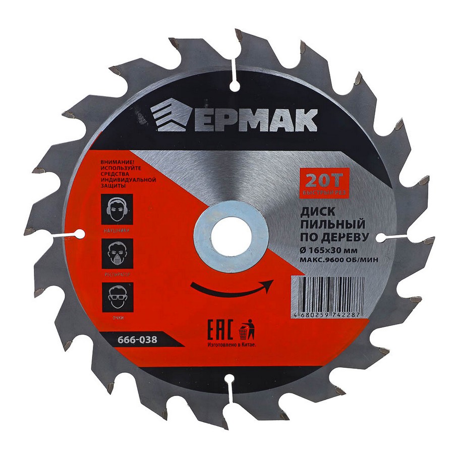 Диск пильный по дереву ЕРМАК 165х30-20-16 z20 применяется для быстрых и грубых пропилов продольного и поперечного типа. Устанавливается на циркулярную пилу. Предназначен для мягкой и твердой древесины, обшивочных необработанных досок, неламинированной ДСП, строительного бруса и строительной древесины с остатками краски. 20 острых зубьев обеспечивают быстрый рез и отлично держат заточку. Максимальная рабочая скорость вращения – 9600 оборотов в минуту.