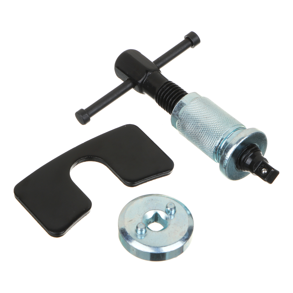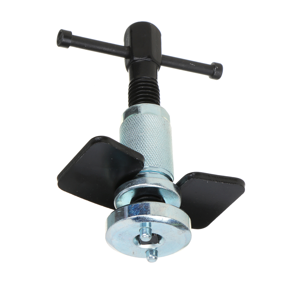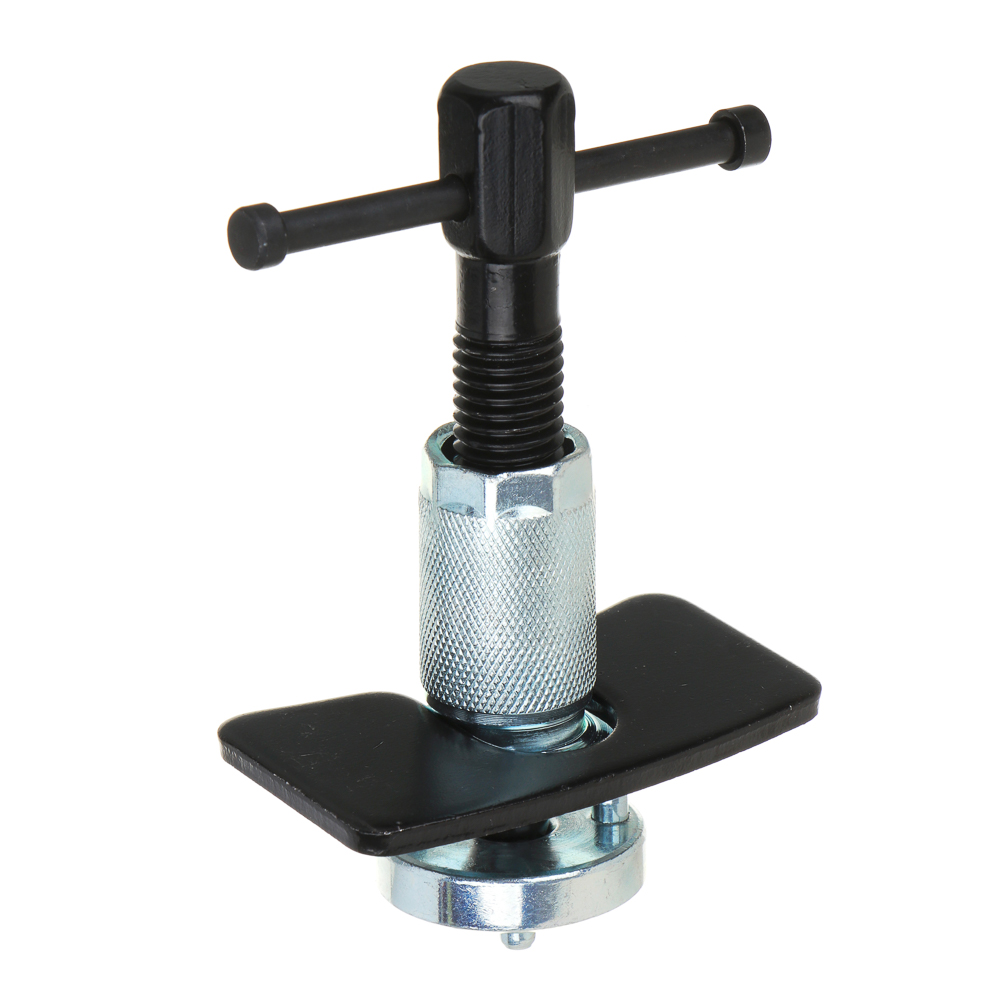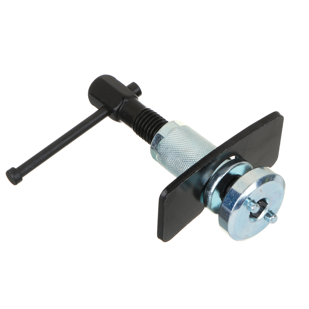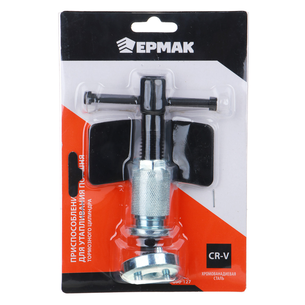 Приспособление от бренда Ермак для утапливания поршня тормозного цилиндра состоит из трех предметов: двух упоров и одного стержня. Упоры устанавливаются на тормозной цилиндр, а стержень вставляется в поршень. Затем, при помощи гаечного ключа, стержень двигается внутрь поршня, утапливая его. Это приспособление позволяет заменить тормозные колодки без необходимости снимать тормозные суппорты.