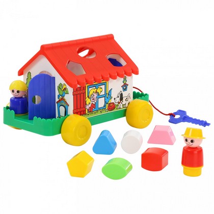 Развивающий домик для детей до 3-х лет. На крыше домика логическая задача - ребёнку нужно сопоставить фигурки (6 шт.) с отверстиями-пазлами. С двух сторон домика есть дверки, которые открываются, и можно достать из домика фигурки. Одна из дверок открывается ключом. Кроме того, в комплект входят 2 фигурки человечков, они устанавливаются в специальные углубления и позволяют ребёнку разыгрывать различные сюжеты. Домик можно катать благодаря наличию колёсиков и шнурка. Размер в упаковке 265х185х165 мм