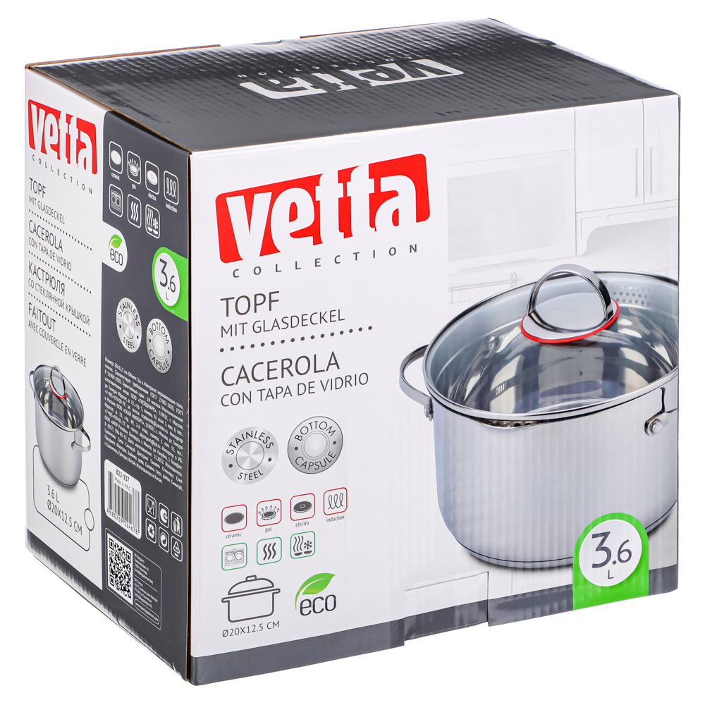 Все еще довольствуетесь приготовлением обедов в старых кастрюлях, где пища медленно варится и пригорает? Обратите внимание на линейку стильной посуды «Бирмингем». Это универсальная посуда из нержавеющей стали, созданная по последним технологиям. Кастрюли оснащены капсульным дном. Вода закипает быстрее. Ингредиенты не подгорают. Пища готовится равномерно и качественно. Подходит для длительного хранения в холодильнике. Размер 20х12,5 см, объем 3,6 л.6 причин купить кастрюлю из нержавеющей стали VETTA "Бирмингем":• многослойное капсульное дно — быстрее готовит, экономит энергию• крышка из жаропрочного стекла со сливом, плюс отверстие для отвода пара• можно ставить в холодильник • мерная шкала на внутренней стенке кастрюли• подходит для всех типов плит, включая индукционны