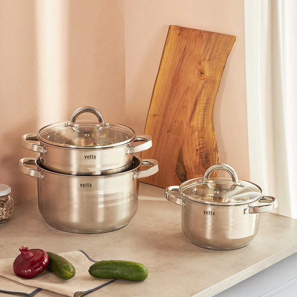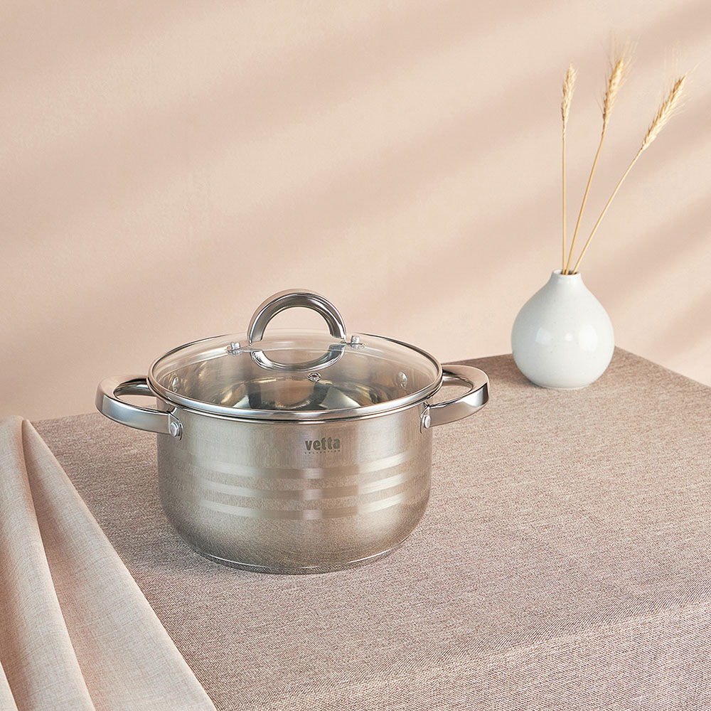 Кастрюля VETTA Фултон объемом 4 л и размером 22х12,5 см станет вашим надежным помощником на кухне. Изготовленная из нержавеющей стали, она устойчива к коррозии, долговечна и легко очищается. Капсульное дно с теплораспределительным слоем обеспечивает равномерный нагрев и позволяет использовать кастрюлю на всех типах плит, включая индукционные. Стеклянная крышка с регулируемым пароотводом помогает контролировать влажность внутри посуды, что особенно важно при приготовлении изысканных блюд. Прозрачная крышка также позволяет наблюдать за процессом готовки, сохраняя аромат блюд. Удобные ручки надежно закреплены, однако они нагреваются во время готовки — рекомендуется использовать прихватки для безопасности.Кастрюля легко моется вручную или в посудомоечной машине, что делает уход за ней максимально простым. Стильная, практичная и функциональная, посуда VETTA Фултон идеально подходит как для ежедневного использования, так и для особых кулинарных экспериментов!
