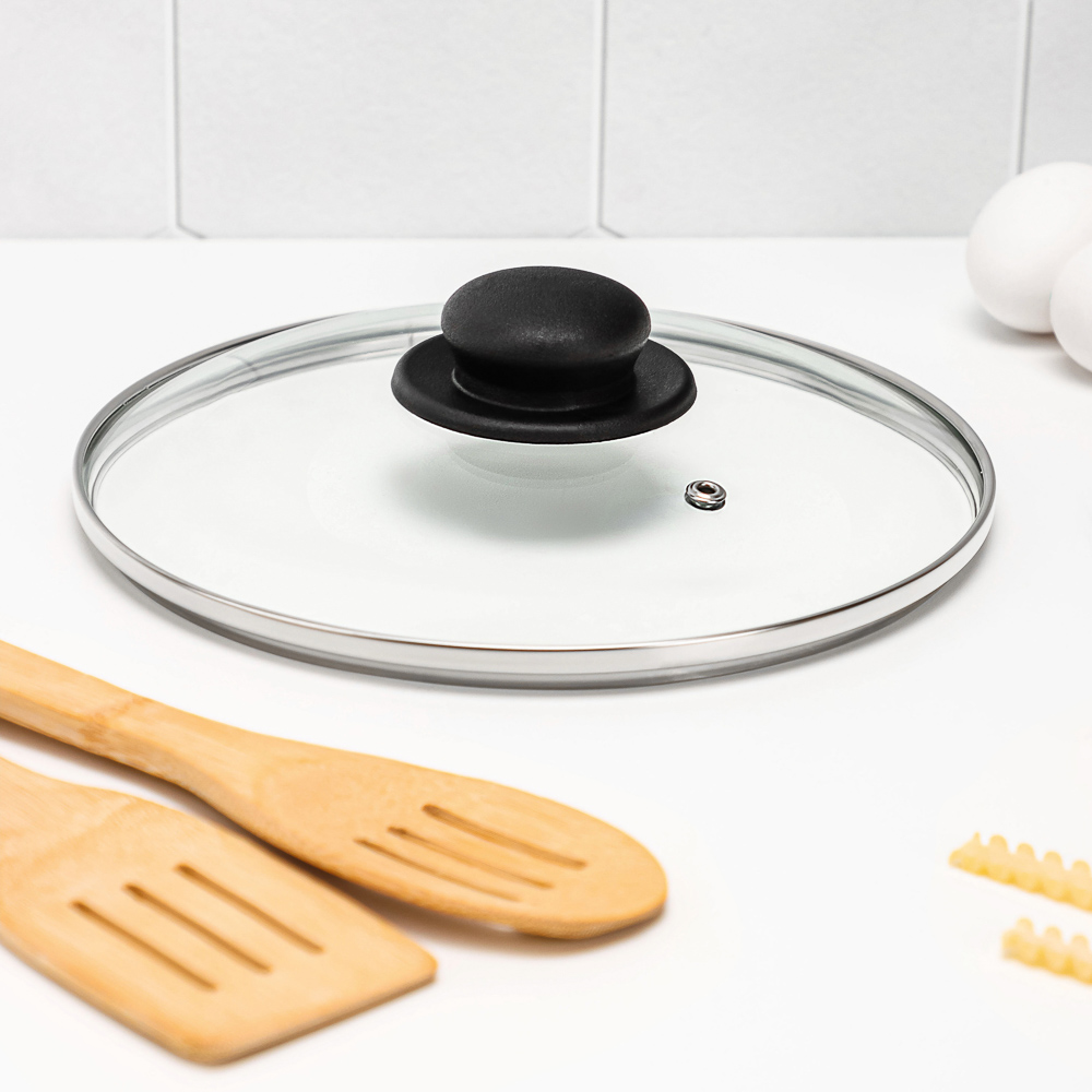 Жаропрочная крышка диаметром 22 см из термостойкого стекла с ободком из высококачественного металла и не нагревающейся ручкой подходит для кастрюль и сотейников. Металлический ободок препятствует образованию сколов, а ручка не скользит в руке и не нагревается во время приготовления. Прозрачная крышка позволяет полностью контролировать процесс приготовления без потери тепла. Крышка оснащена отверстием для выхода лишнего пара. Перед первым использованием крышки стеклянной: - Удалите имеющиеся стикеры и наклейки;- Вымойте в тепло