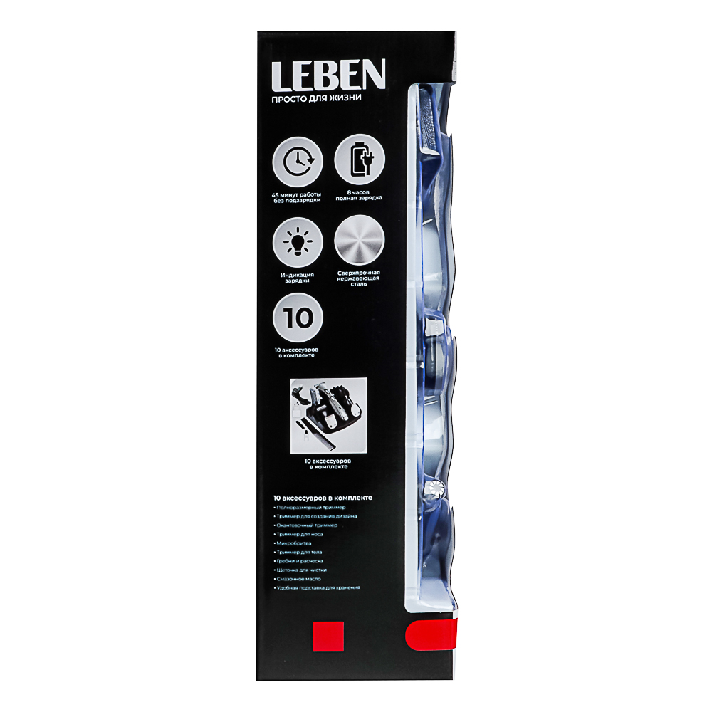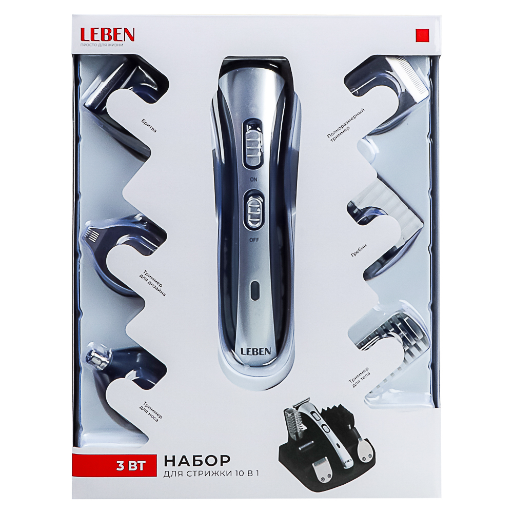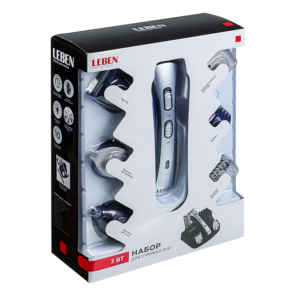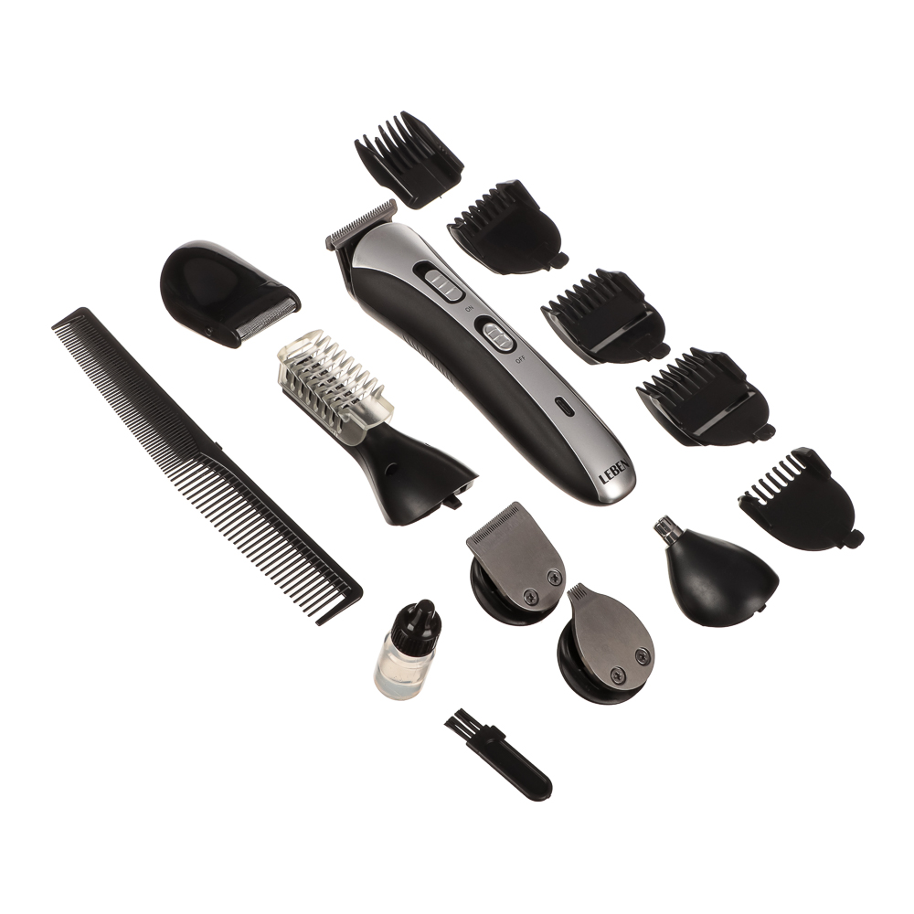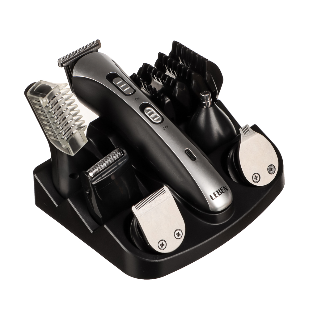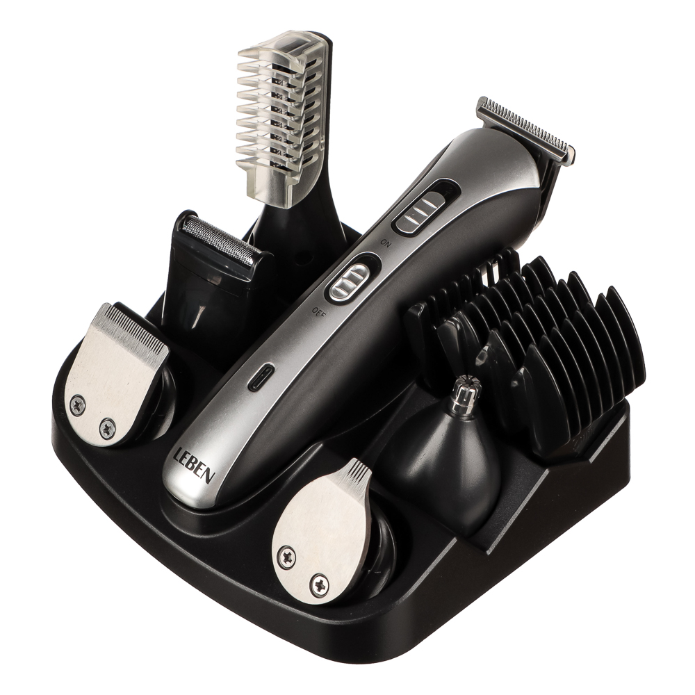 Максимальная точность для 100%-ного контроля вашего стиля. Универсальный набор для стайлинга ТМ Leben - это принадлежности для стрижки волос на лице и голове в одном комплекте. Благодаря потрясающим насадкам триммер способен с легкостью выполнять различные задачи и обеспечивать контроль над образом. Чтобы в любой момент подкорректировать свою стрижку, достаточно купить триммер от LEBEN.