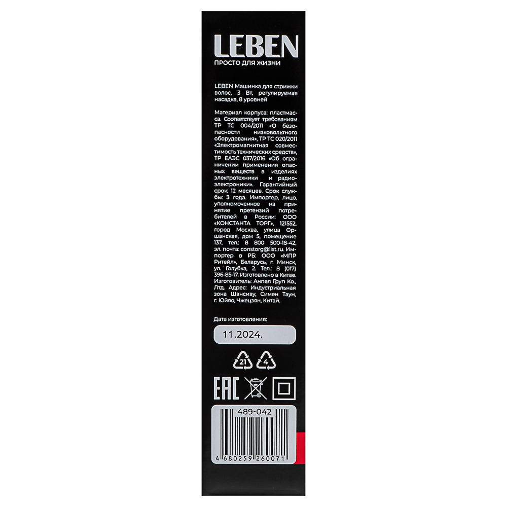 Машинка для стрижки волос LEBEN с аккумуляторным питанием. Лезвия выполнены из качественных материалов, что обеспечит комфорт во время стрижки. Длину стрижки можно варьировать с помощью смены насадок от 6 до 20 мм. Чтобы в любой момент подкорректировать свою стрижку, достаточно купить триммер от LEBEN.