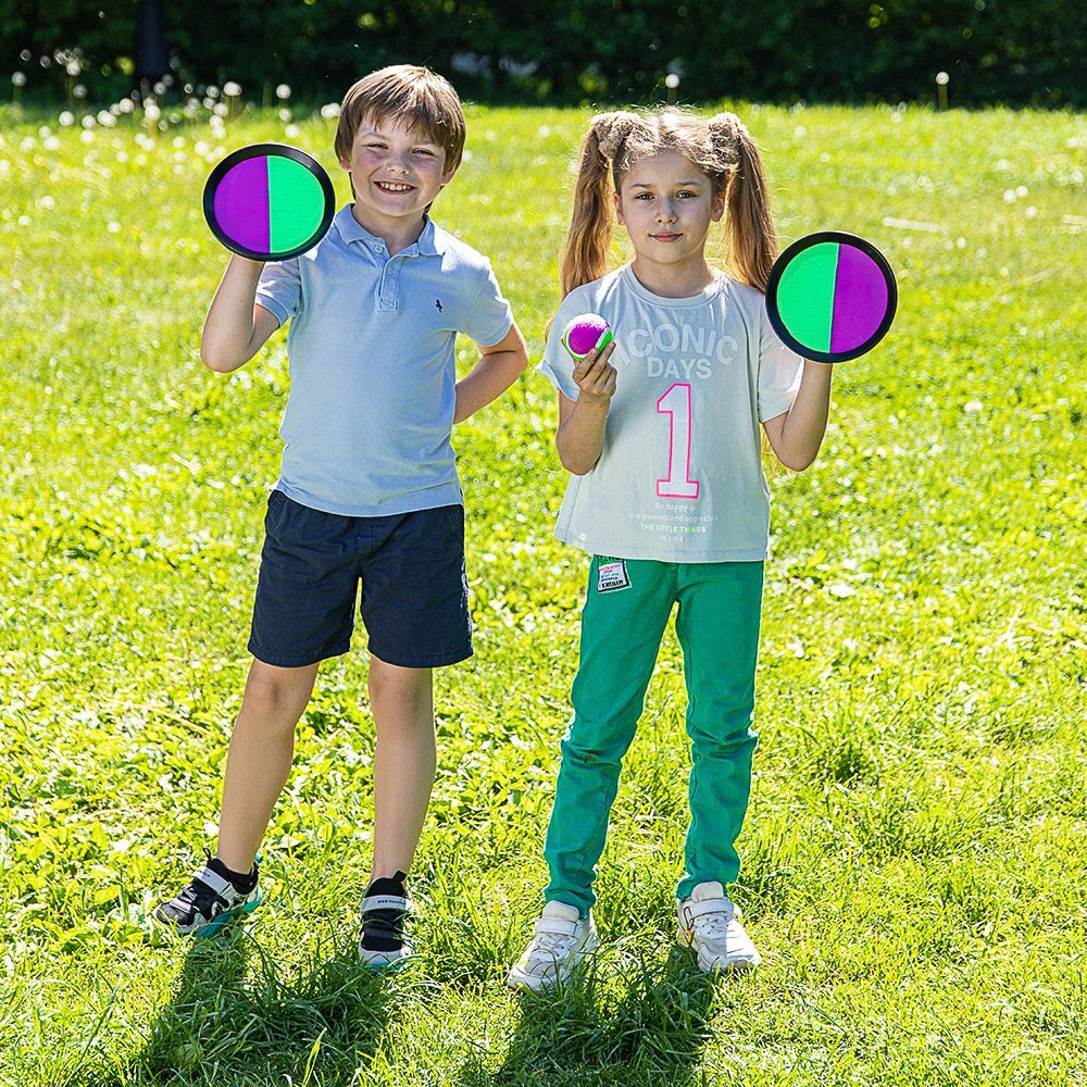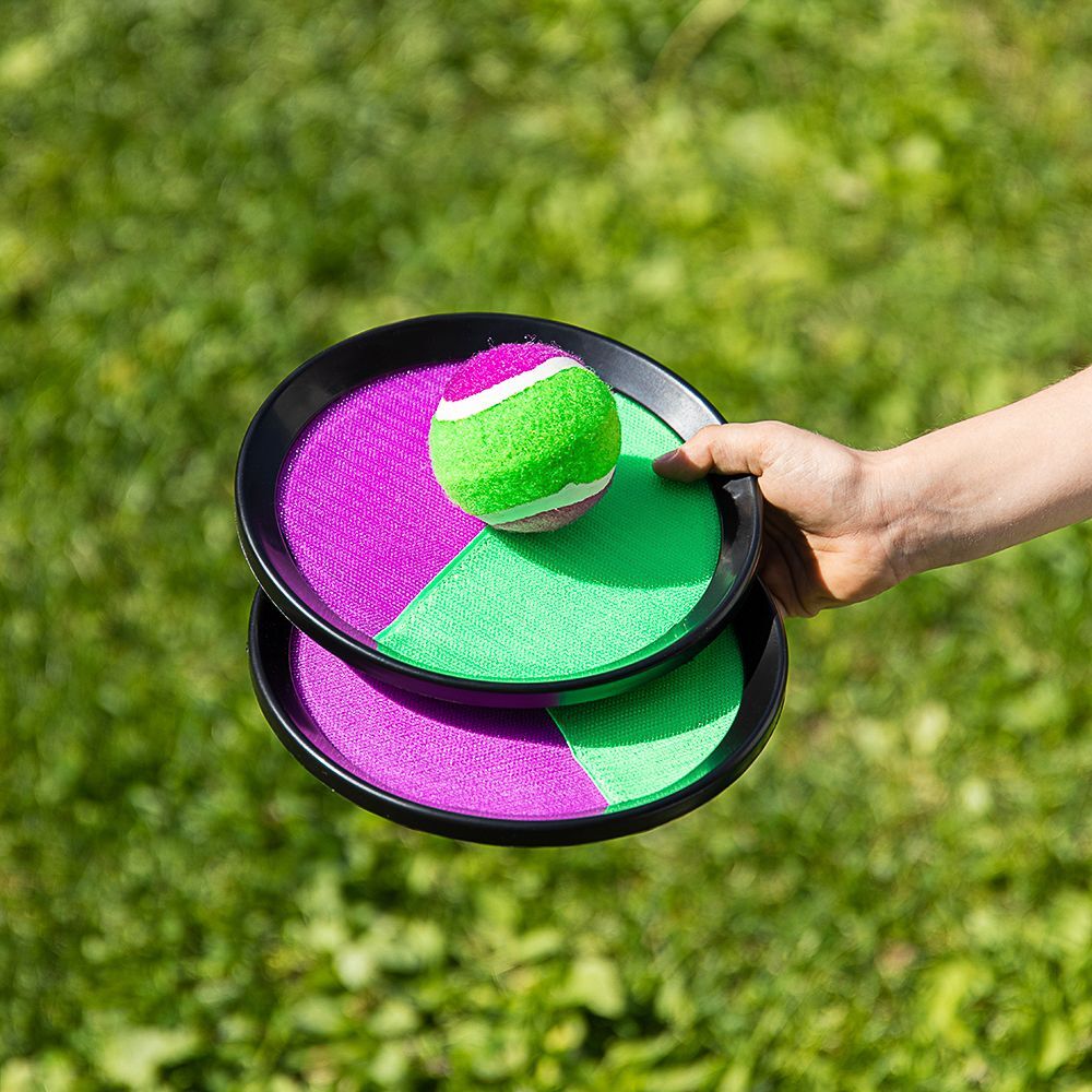 Детский набор “Поймай мяч” - это игра, в которой игроки бросают друг другу мяч и ловят его тарелками-липучками. В нее играют во дворе, на пляже или в парке. Мяч тканевый - мягкий и безопасный. Тарелки из пластика - легкие, прочные. Купите детям для веселых игр на воздухе!