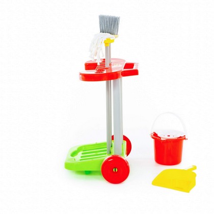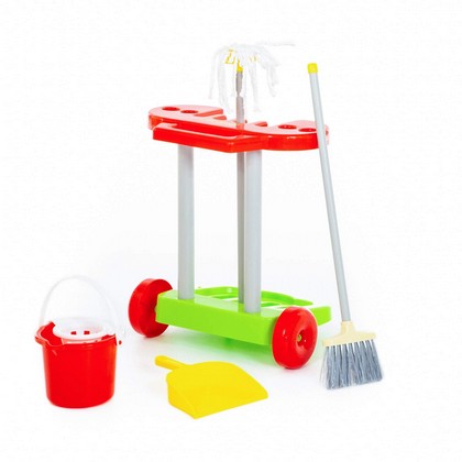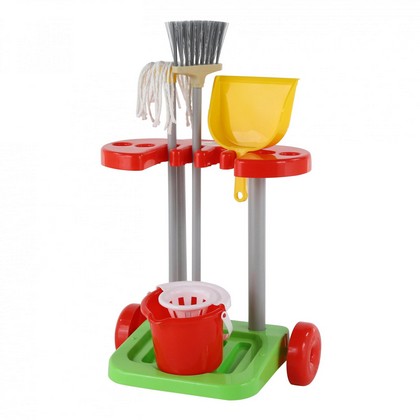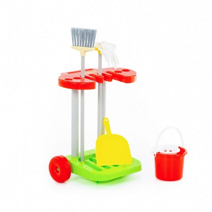 В наборе тележка на колесах с ручкой, в которую ставятся ведерко, швабра, совок и метелка. Высота тележки Помощница больше чем у Чистюли: 55 см Размер упаковки 335 ? 270 ? 560 мм