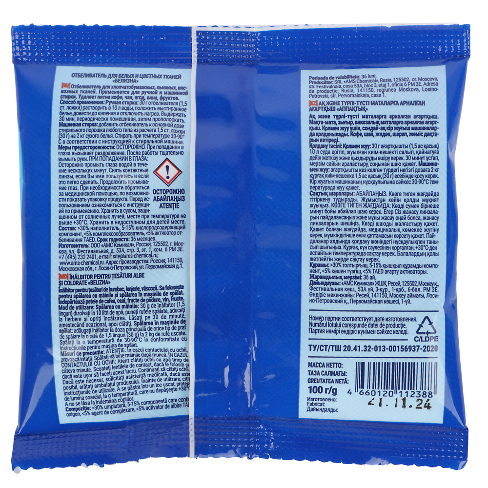 Белизна "Золушка" — это популярный отбеливатель на основе гипохлорита натрия, который используется для отбеливания белья, дезинфекции и удаления сложных загрязнений. Упаковка 100 г (порошок) удобна для использования в домашних условиях. Подходит для отбеливания хлопковых и льняных тканей, дезинфекции поверхностей, устранения плесени и неприятных запахов.Для отбеливания: растворите необходимое количество порошка в воде (согласно инструкции на упаковке), замочите белье на некоторое время, затем постирайте.Для дезинфекции: используйте раствор для обработки поверхностей.Меры предосторожности:Избегайте контакта с кожей и глазами.Используйте в хорошо проветриваемом помещении.