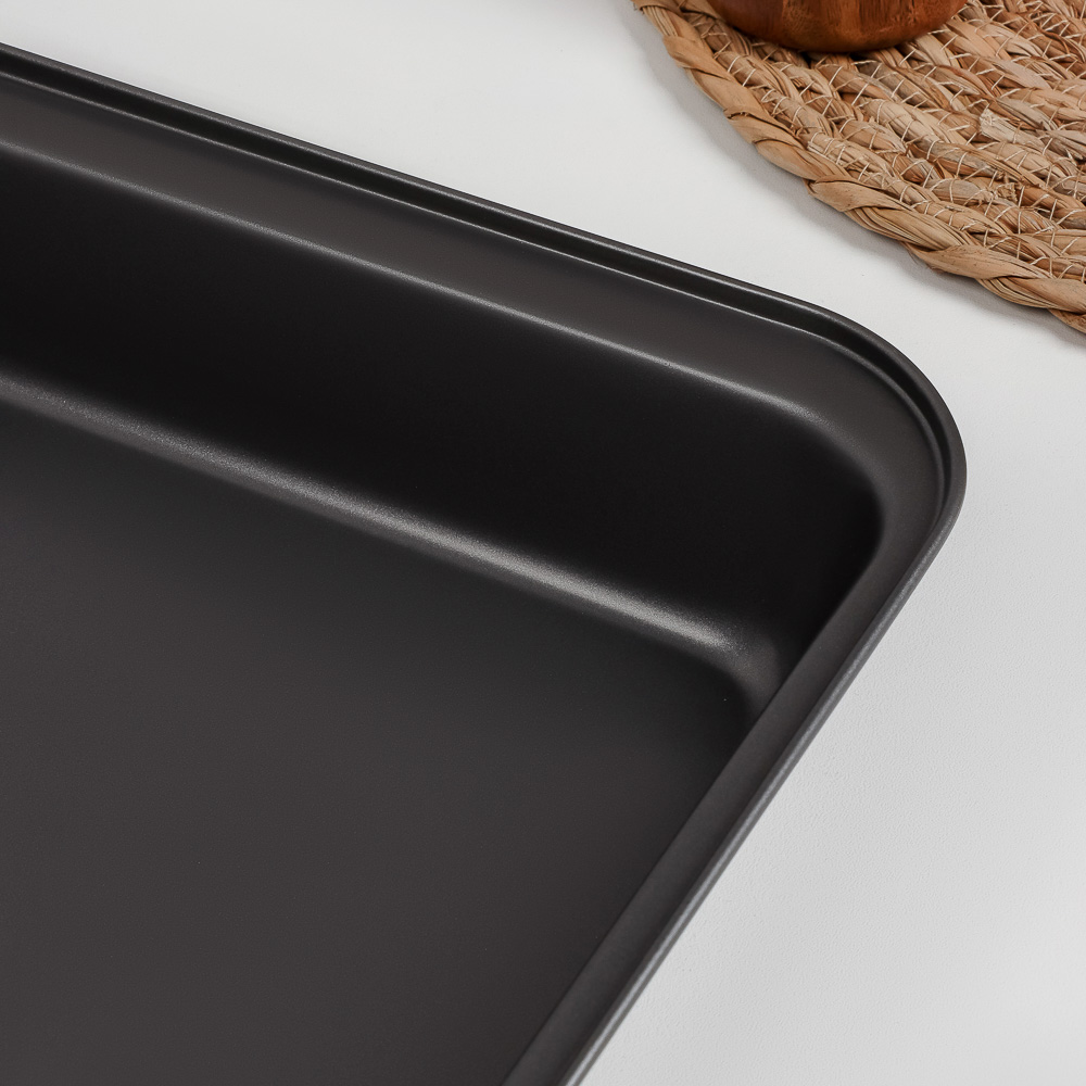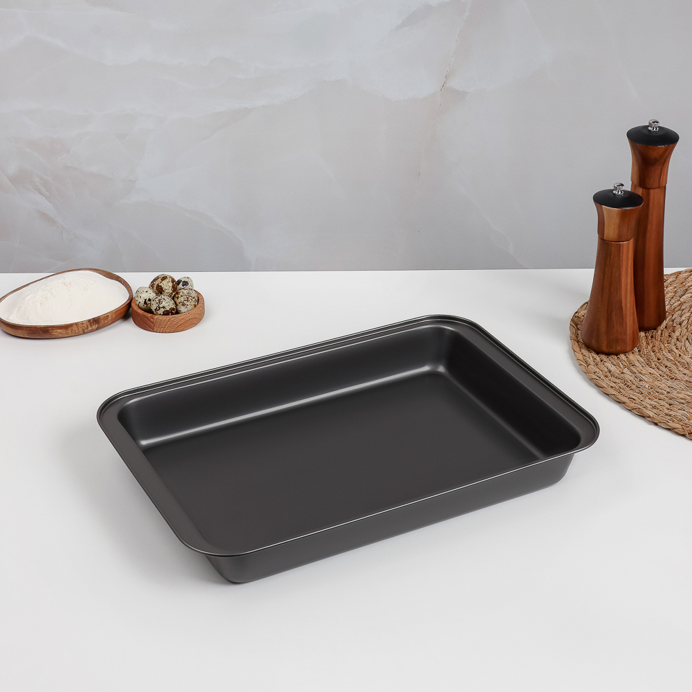 Глубокий противень размером 42x29x5 см, выполненный из углеродистой стали, станет незаменимым помощником для приготовления различных блюд. Благодаря антипригарному покрытию, пища не прилипает к поверхности, что позволяет легко извлекать готовые блюда и упрощает процесс очистки. Черный цвет придаёт противню элегантный и современный вид, который украсит любую кухню. Оптимальный размер и глубокая конструкция делают этот противень идеальным для запекания мяса, рыбы, овощей, а также для приготовления запеканок и других многослойных блюд. Углеродистая сталь обеспечивает равномерное распределение тепла, что гарантирует отличные результаты при каждом использовании.Этот глубокий противень с антипригарным покрытием создан для вашего удобства и комфорта. Надежный и долговечный, он станет важным элементом вашего кухонного арсенала, помогая вам готовить вкусные и аппетитные блюда с легкостью.