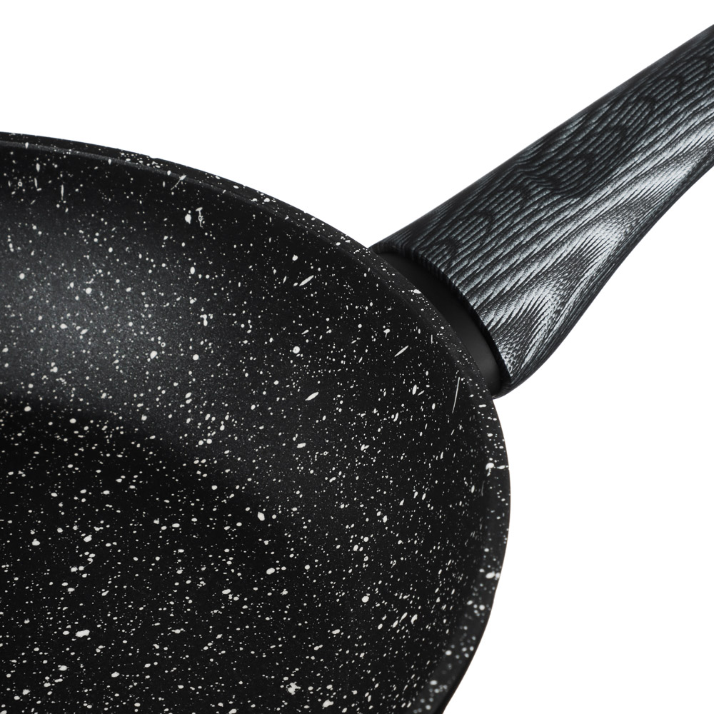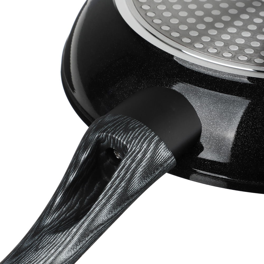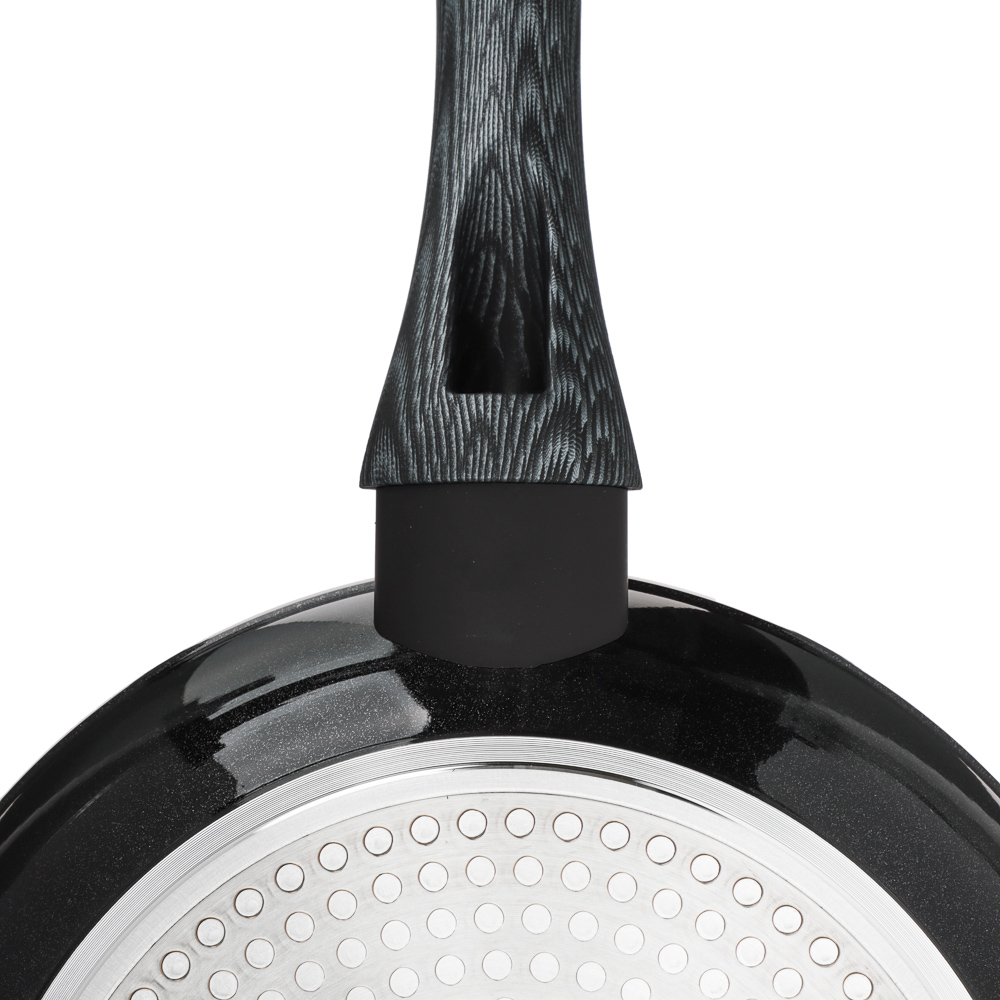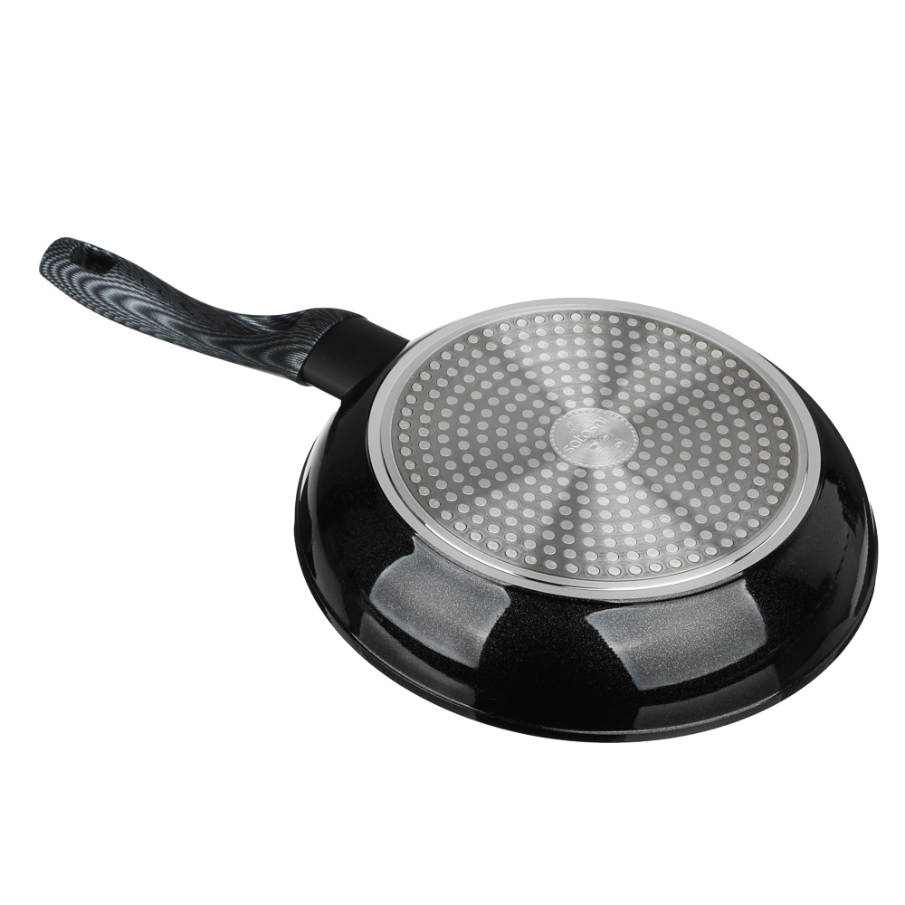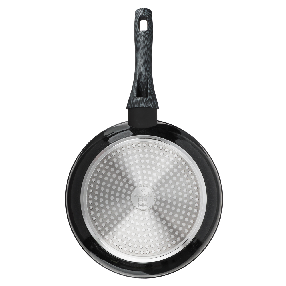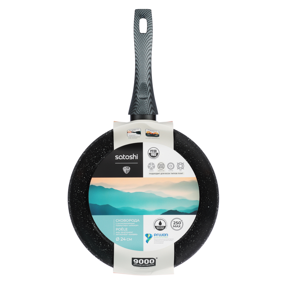 Сковорода TM SATOSHI серия "Карбон" д.24 см выполнена из литого алюминия, что обеспечивает качественную равномерную прожарку продуктов. Рабочая поверхность сковороды защищена прочным антипригарным покрытием под мрамор, а снаружи нанесено термостойкое покрытие черного цвета. Отличительная особенность серии "Карбон" - это оригинальный графичный дизайн ручки черно-серого цвета. Сама ручка изготовлена из бакелита с силиконовым напылением, не нагревается и не скользит. Сковорода подходит для использования на всех видах плит, в том числе и индукционной плиты, а также для мытья в посудомоечной машине.
