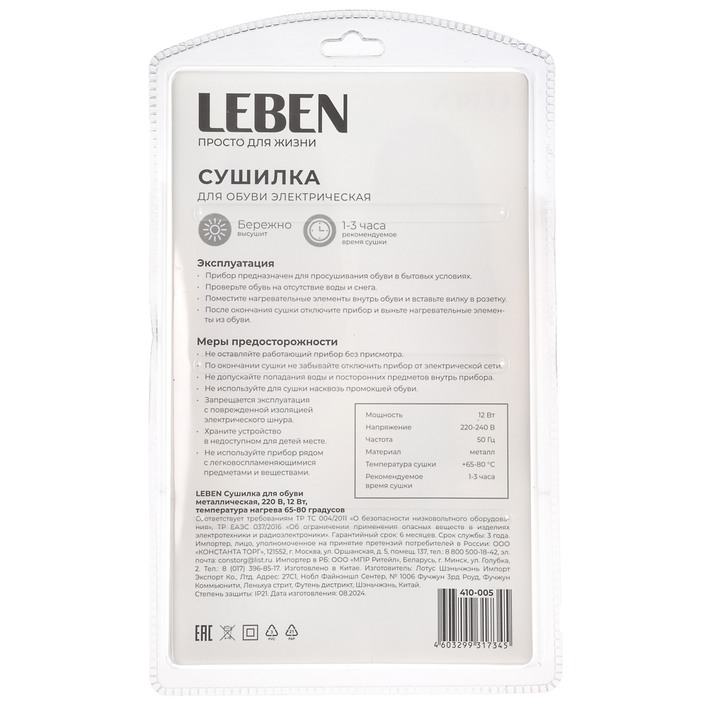 Простая в применении, надежная и очень удобная сушилка для обуви LEBEN. Сушилка для обуви позволяет сушить обувь эффективно и безопасно за короткое время, изготавливается из негорючего материала, а все нагревательные элементы качественно изолированы.