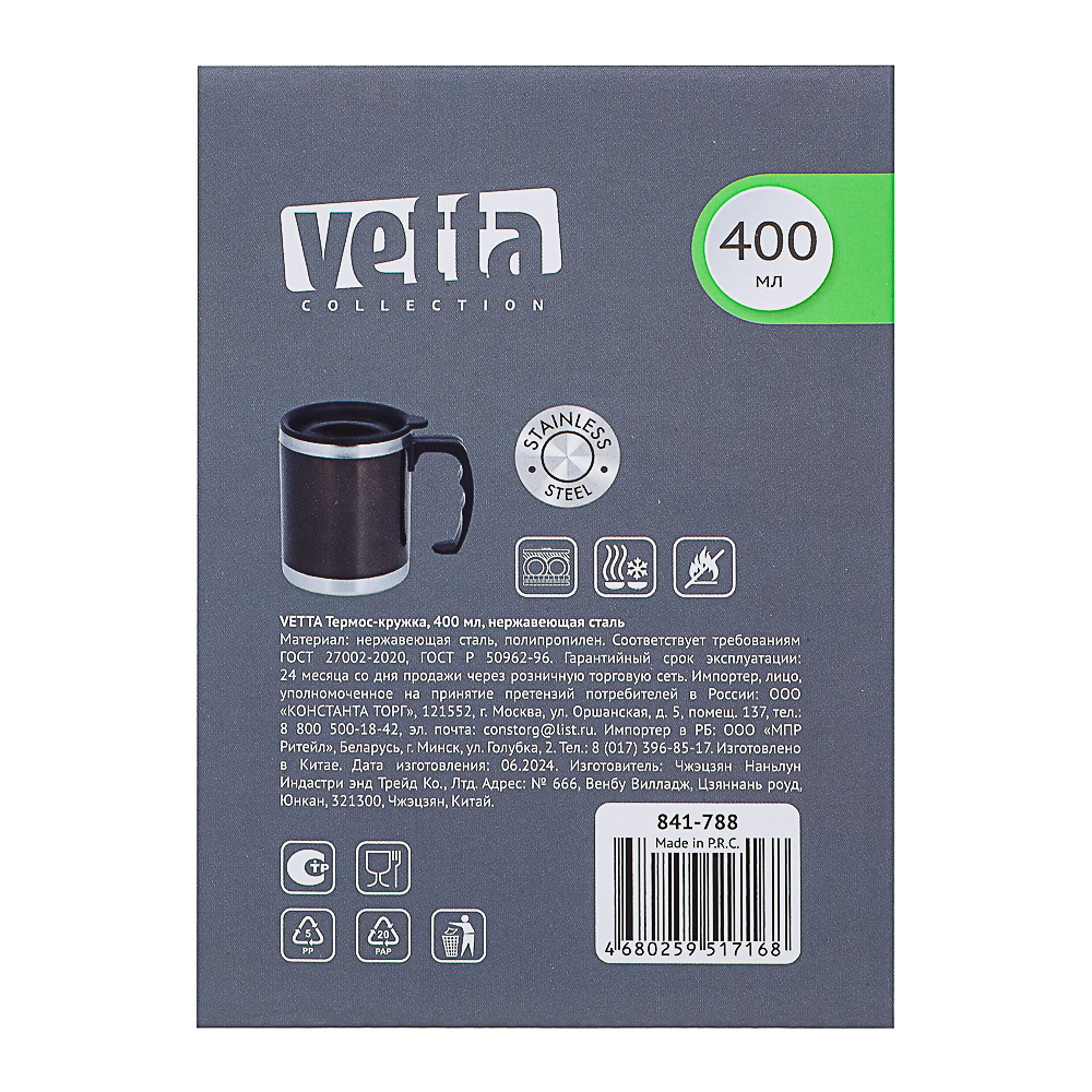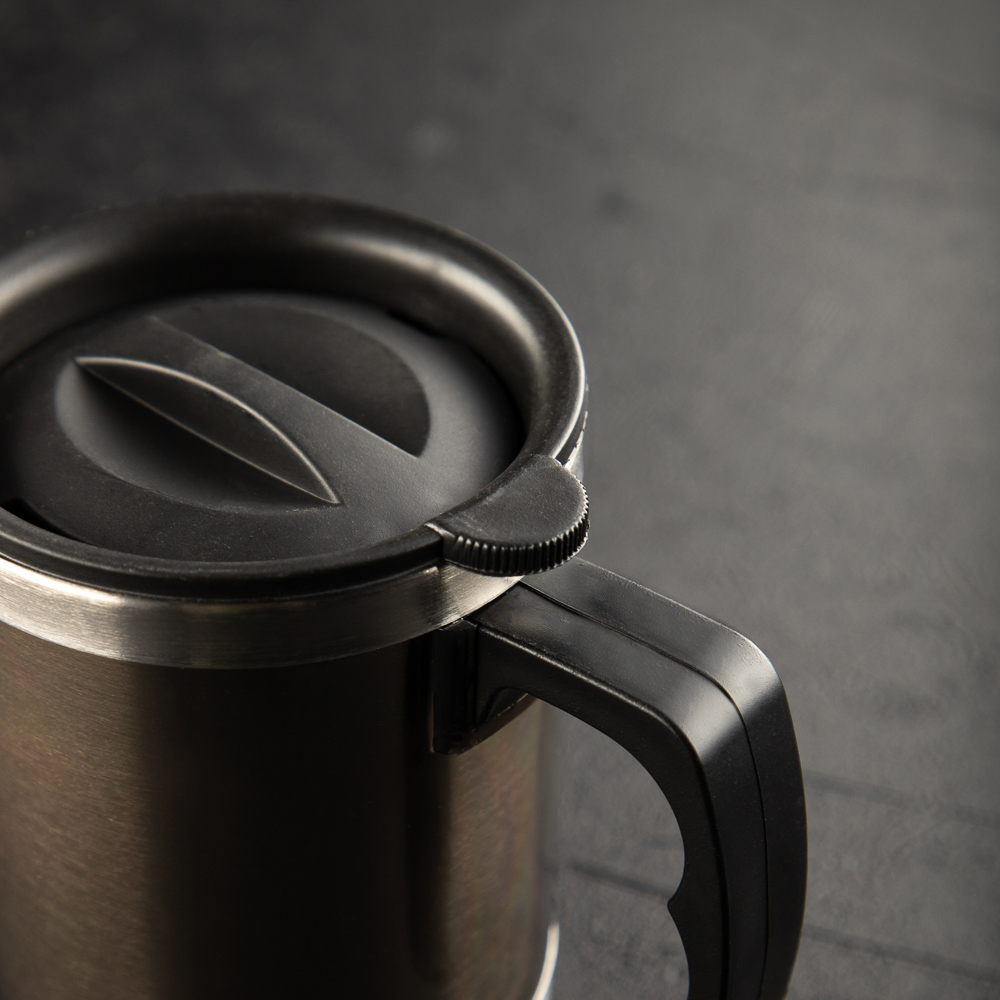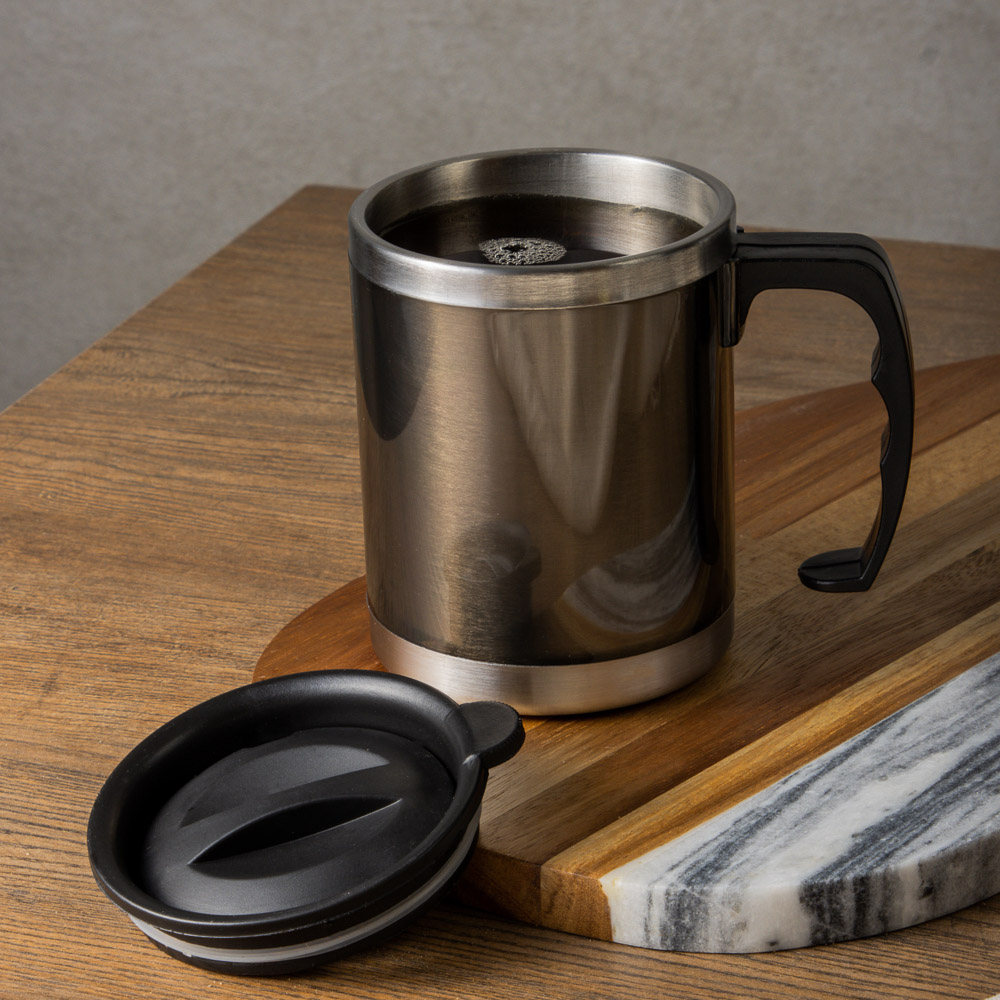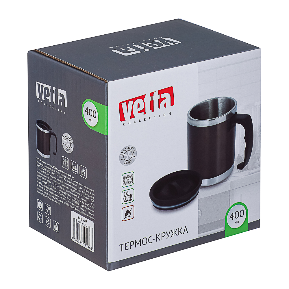 Кружка-термос объемом 400 мл сохраняет напитки теплыми дольше обычного. Изделие выполнено из нержавеющей стали, обладающей гигиеничностью, отличными теплоизоляционными свойствами и повышенной устойчивостью к механическим повреждениям. Надежная крышка исключает проливание жидкости. Такой аксессуар удобно использовать на отдыхе, работе и в автомобиле.