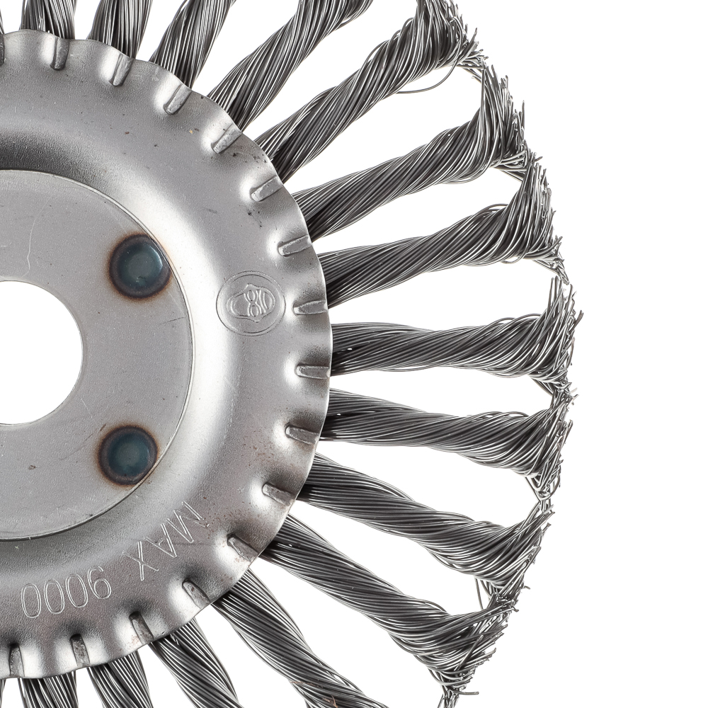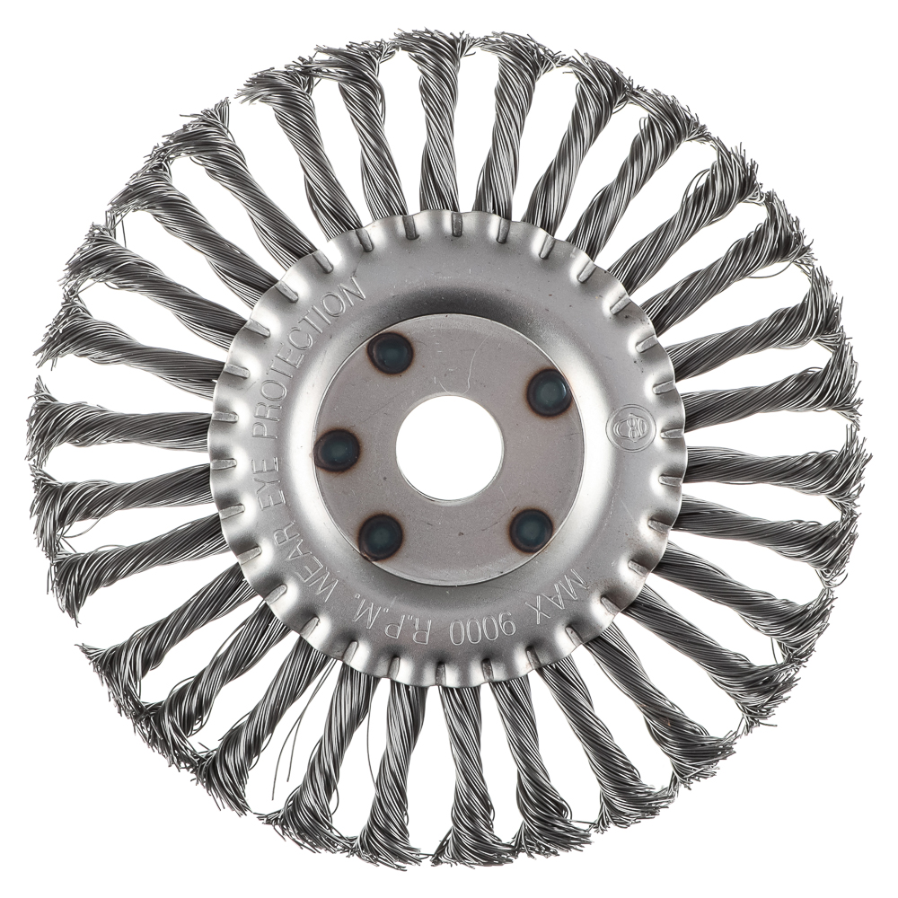Изготовлена из стальной крученой проволоки. Такая щетка имеет высокую износостойкость и применяется при грубых зачистных работах по металлическим поверхностям, удалении окалины, ржавчины и заусенцев, сглаживании сварных швов.