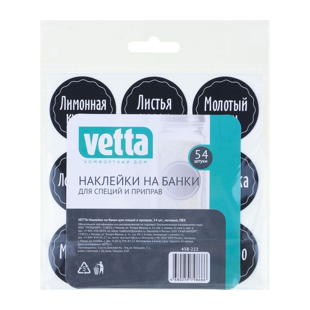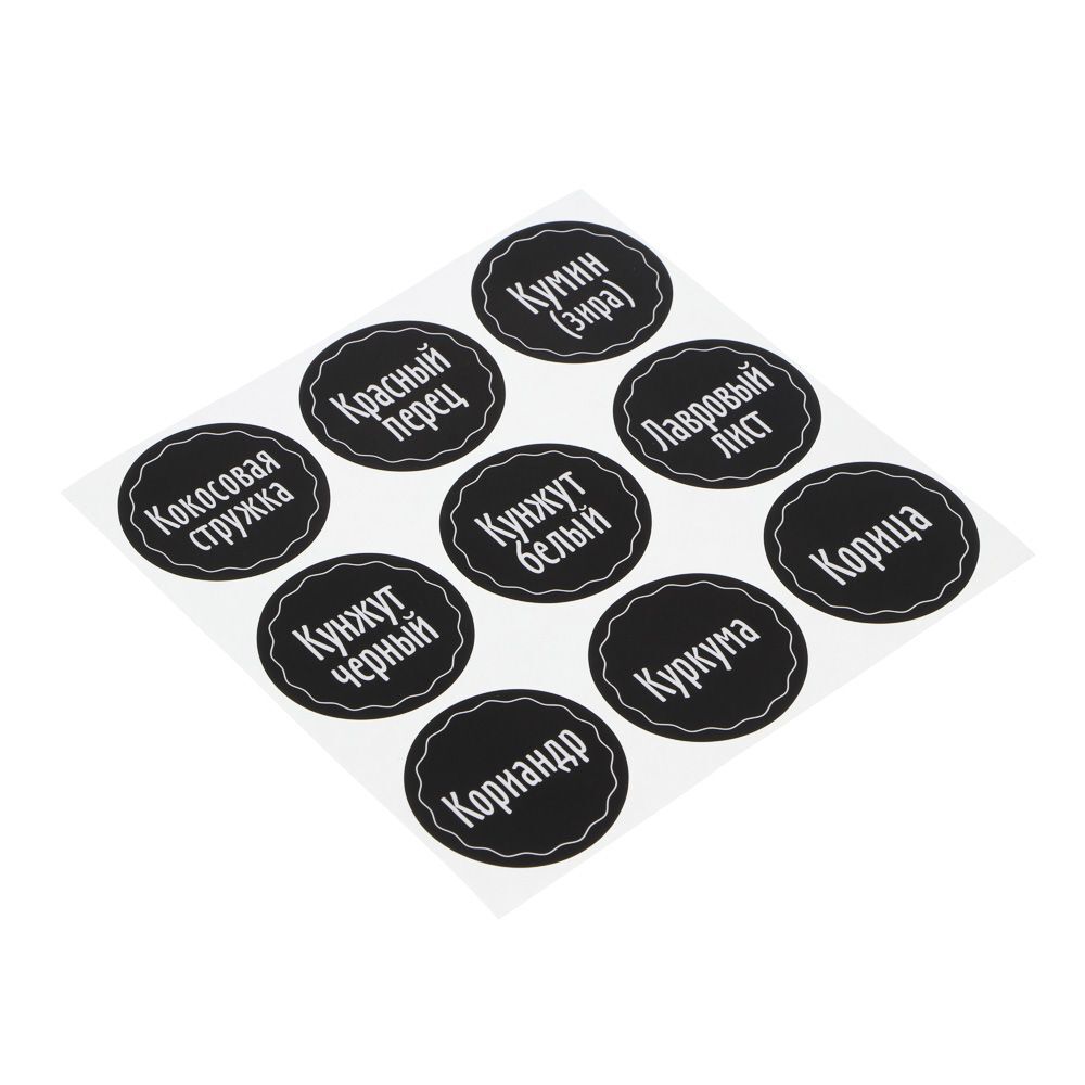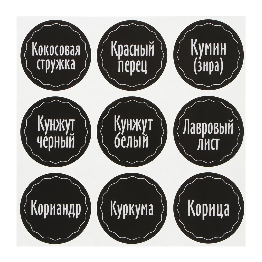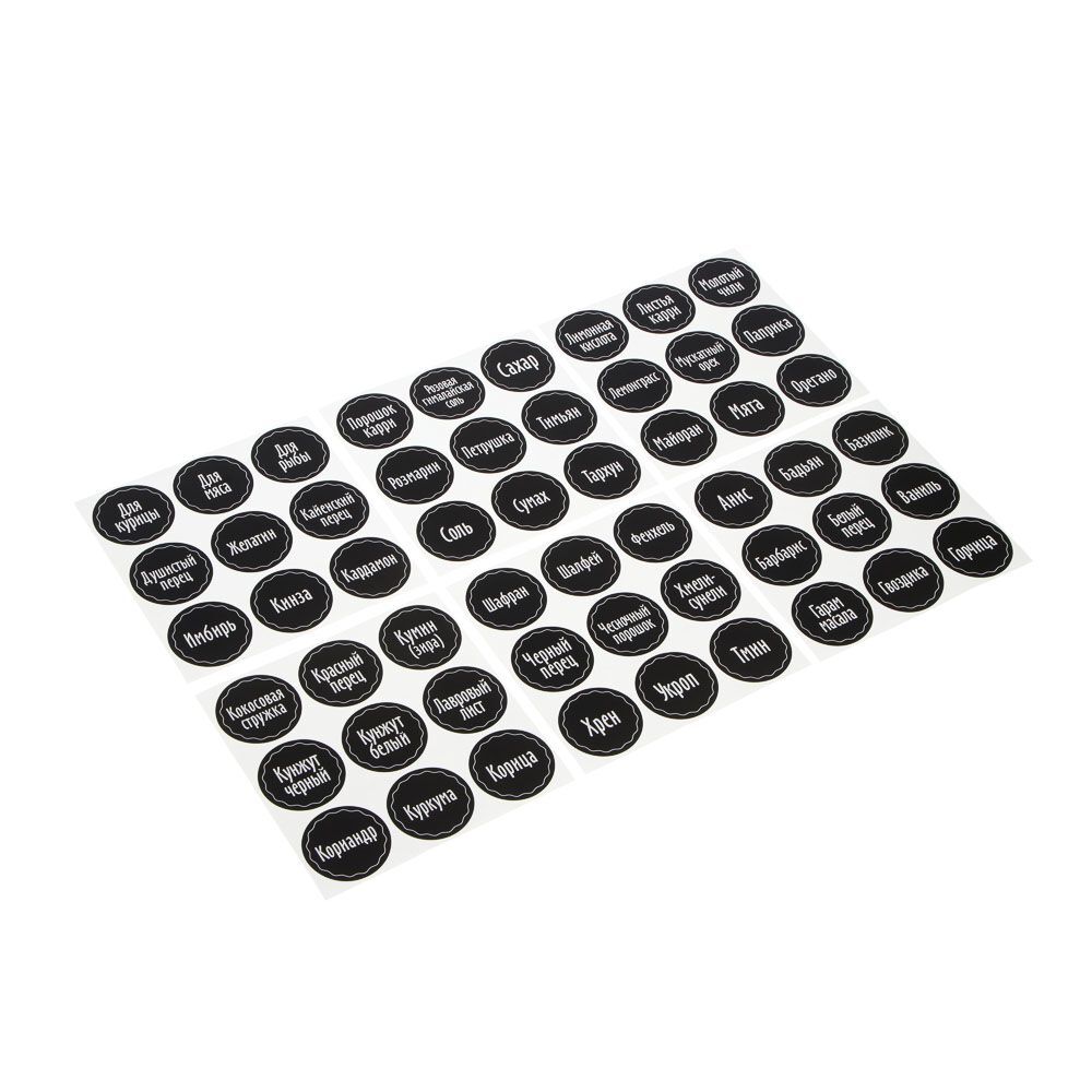 Наклейки на банки для специй и приправ VETTA – настоящая находка для хозяек. Коллекция матовых черных наклеек с белыми хорошо просматриваемыми надписями поможет упорядочить приправы и специи и оформить емкости для хранения в едином стиле, что позволит быстро находить нужный продукт, а также сделает интересный интерьерный акцент при открытом хранении баночек с пряностями на полке или за прозрачным стеклом. 54 наклейки содержат все основные виды трав, пряностей, специй, приправ, включая соль и сах