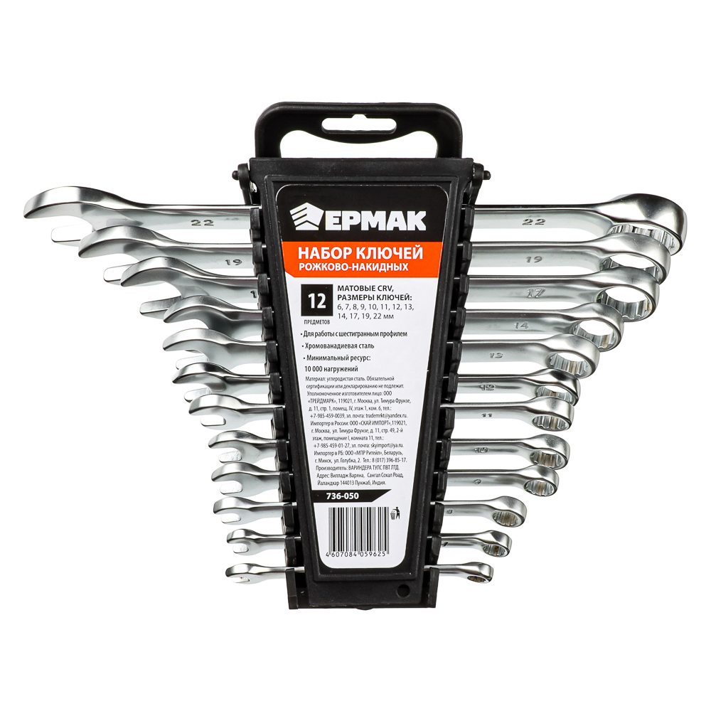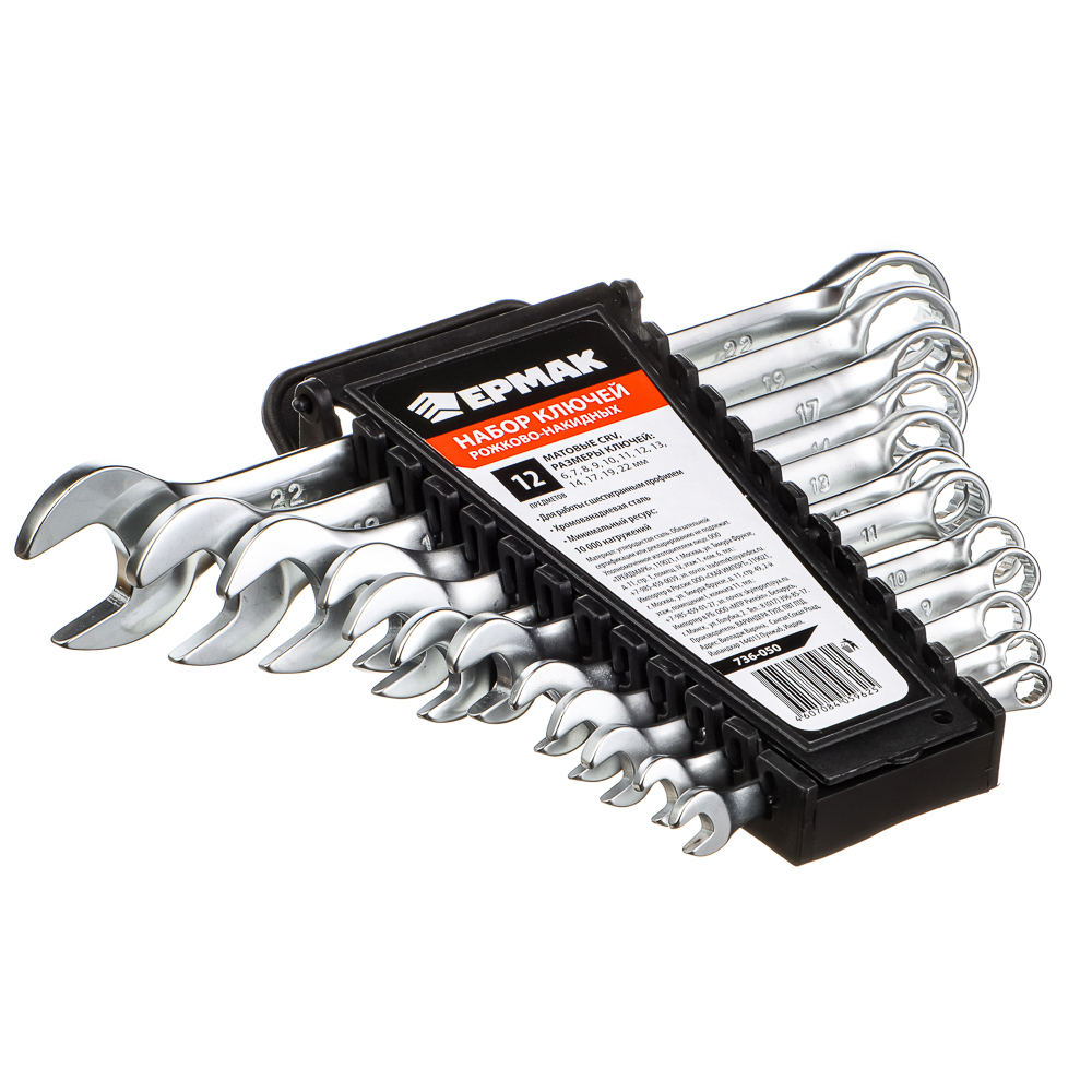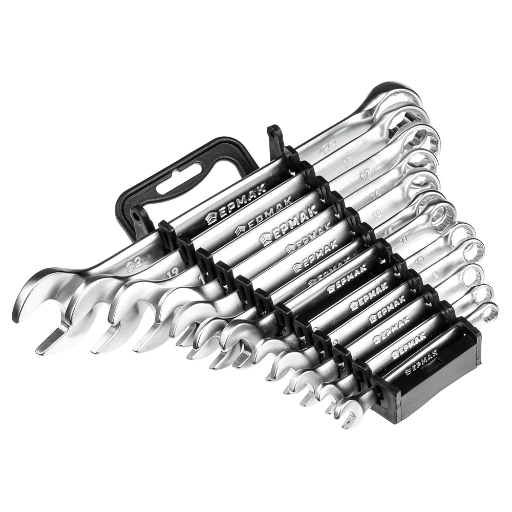 ЕРМАК Набор ключей рожково-накидных, 12 предм., 6-22мм, матовые CRV, пластик холдер