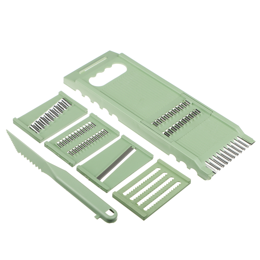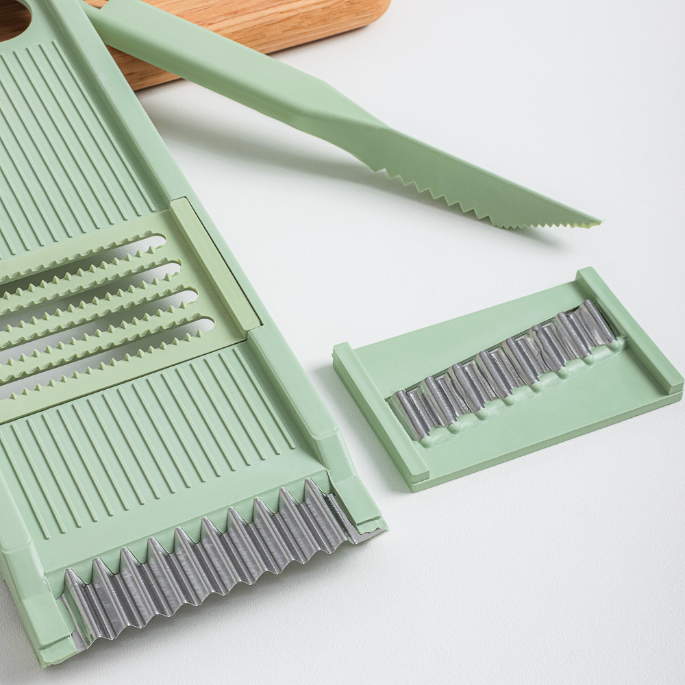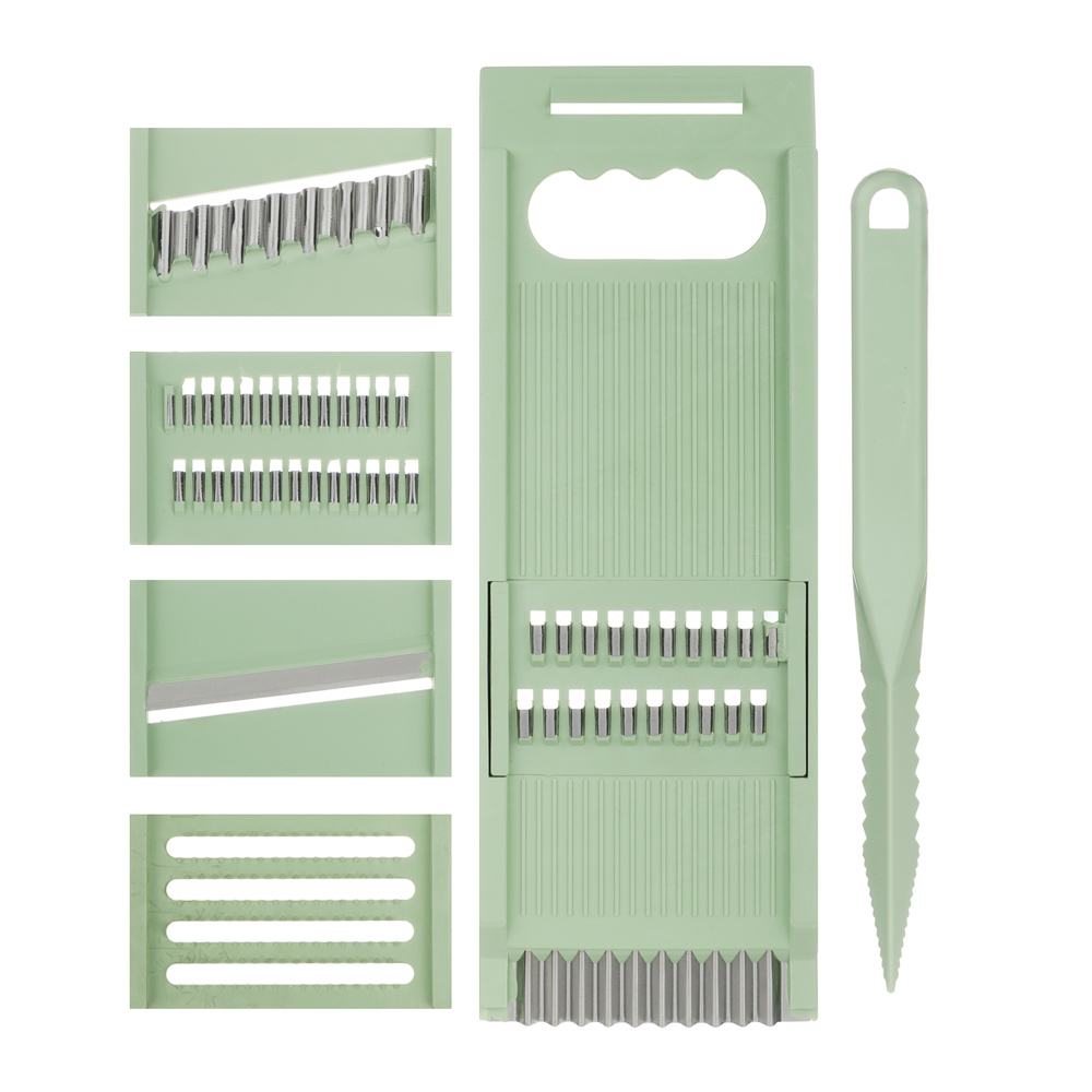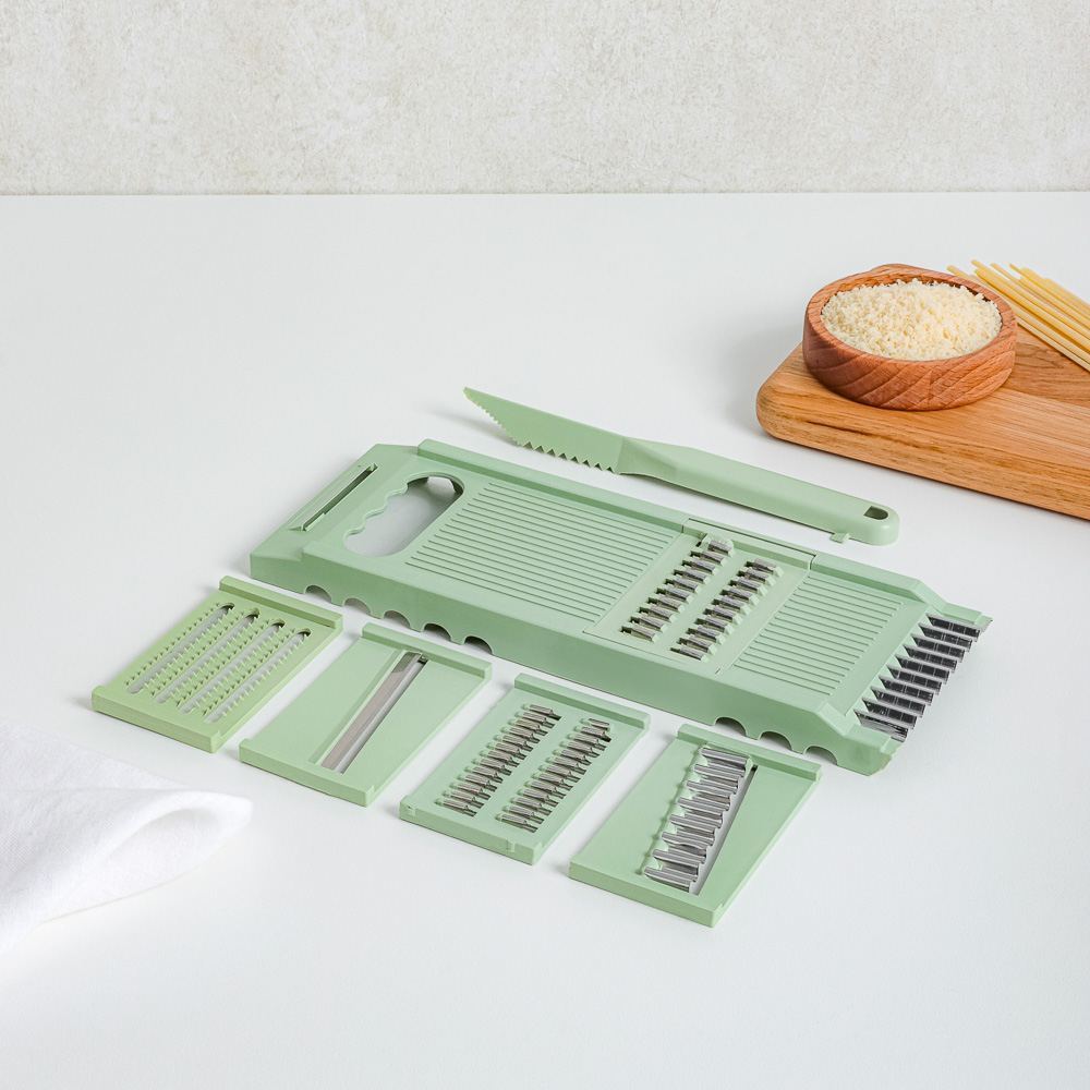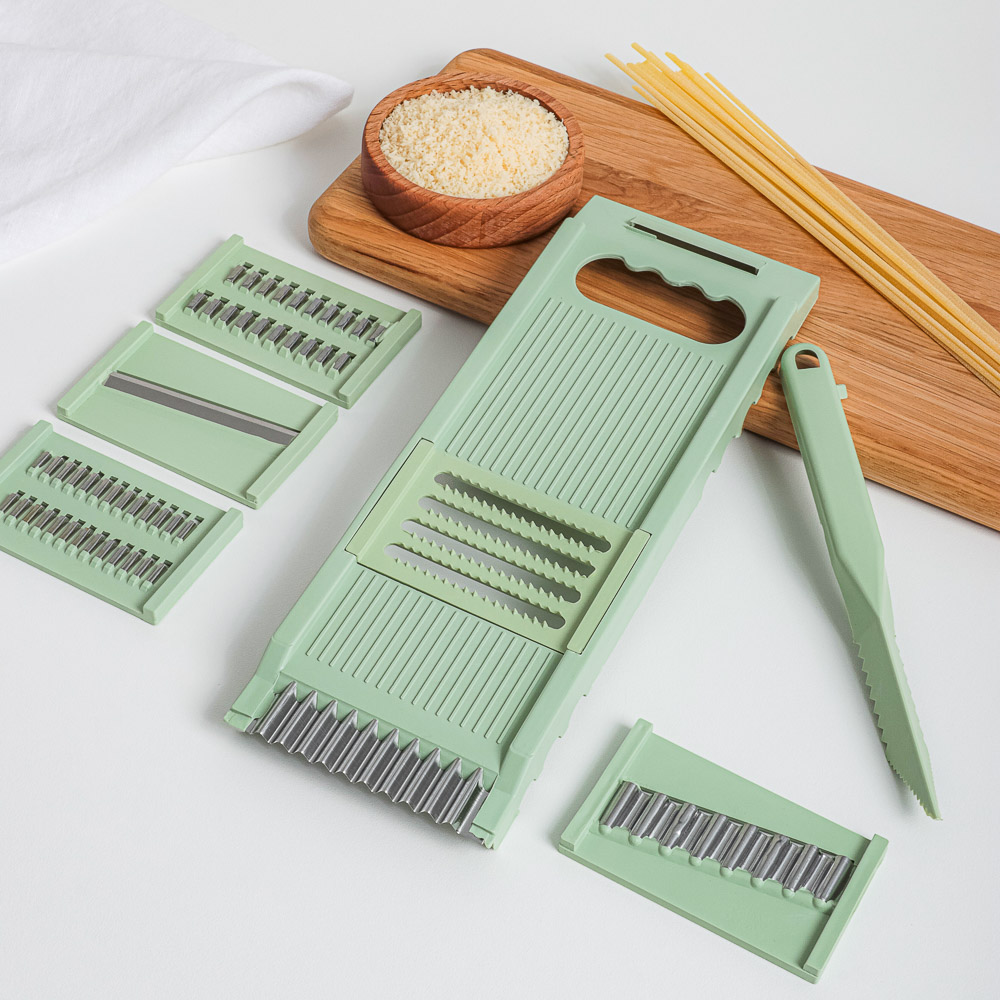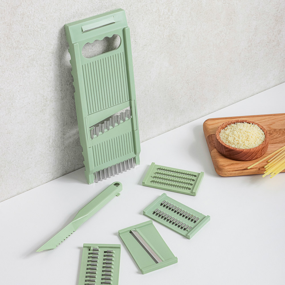 Надоело нарезать овощи ножом? Представляем многофункциональную терку из 7 предметов, которая выведет вашу кулинарную жизнь на новый уровень. Теперь вы сможете легко шинковать капусту для борща и салатов, а также делать морковь по-корейски. Овощи нарезаются быстро и ровно, а главное — безопасно.7 причин купить многофункциональную терку:• острые лезвия из нержавеющей стали• 5 вставок для разных видов работ + нож для карвинга• в нижней части выемка для фиксации терки на миске• в верхней части углубление для пальцев• 2 насадки для измельчения моркови • насадка для приготовления картофельной соломки фри• нож для карвинга позволяет делать украшения из фруктов и овощей.