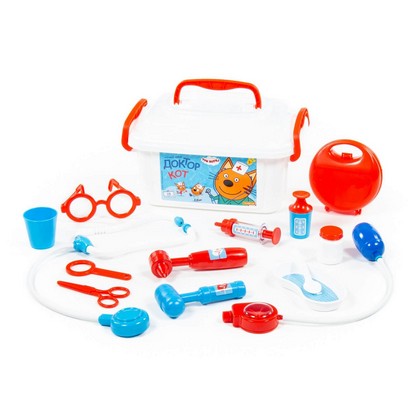 В состав набора «Три кота» «Доктор» входят: ножницы - 1 шт., очки - 1 шт., лупа - 1 шт., шприц - 1 шт., лоток для инструментов - 1 шт., ложечка - 1 шт., стетоскоп (для прослушивания сердца и лёгких) - 1 шт., тонометр (для измерения давления) - 1 шт., отоскоп (инструмент лор-врача) - 1 шт., молоточек - 1 шт., мерный стаканчик с крышкой - 1 шт., стаканчик - 1 шт., баночка -1 шт., медицинский чемоданчик - 1 шт. Размер в упаковке 285х195х155 мм