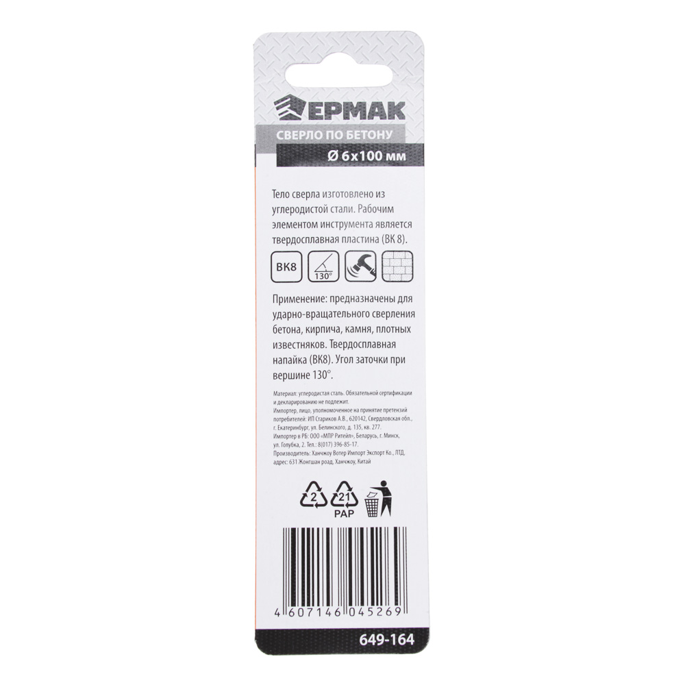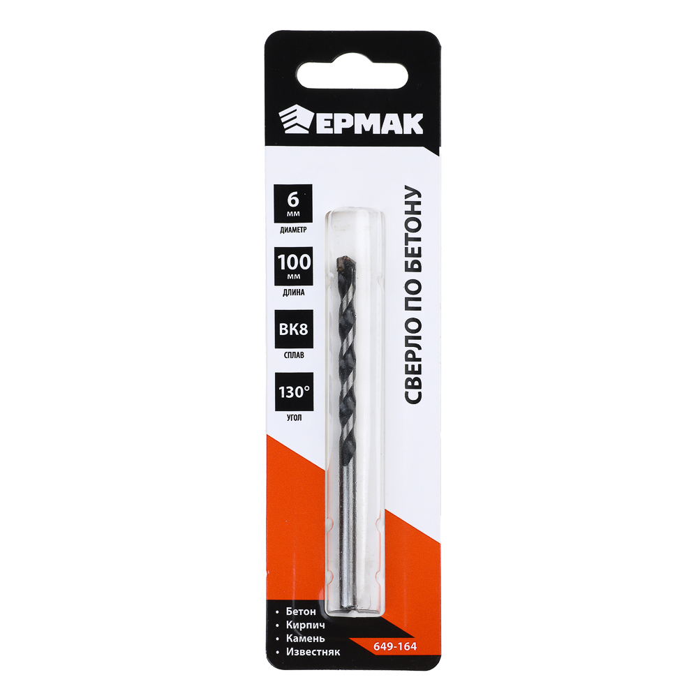 Сверло по бетону ЕРМАК 6х100 мм выполнено из высокопрочной износостойкой углеродистой стали. Рабочий элемент представляет собой твердосплавную пластину из сплава BK8. Используется для ударно-вращательного сверления твердых материалов: бетона, камня, кирпича, плотного известняка. Угол заточки при вершине – 130 градусов. Имеет длительный ресурс службы. Совместимо с дрелями и перфораторами с соответствующим посадочным диаметром.