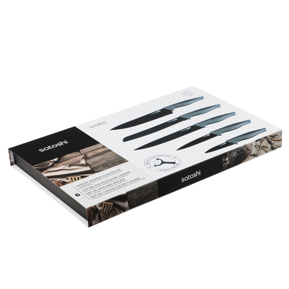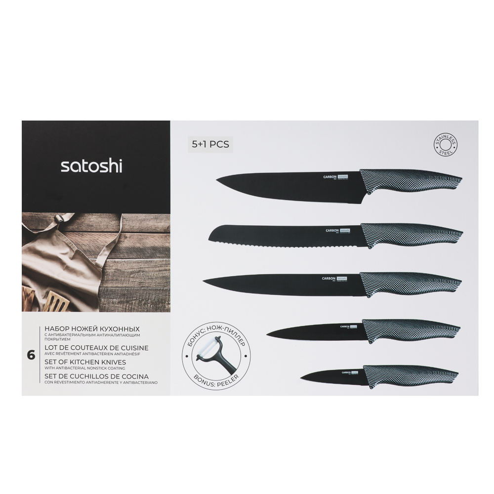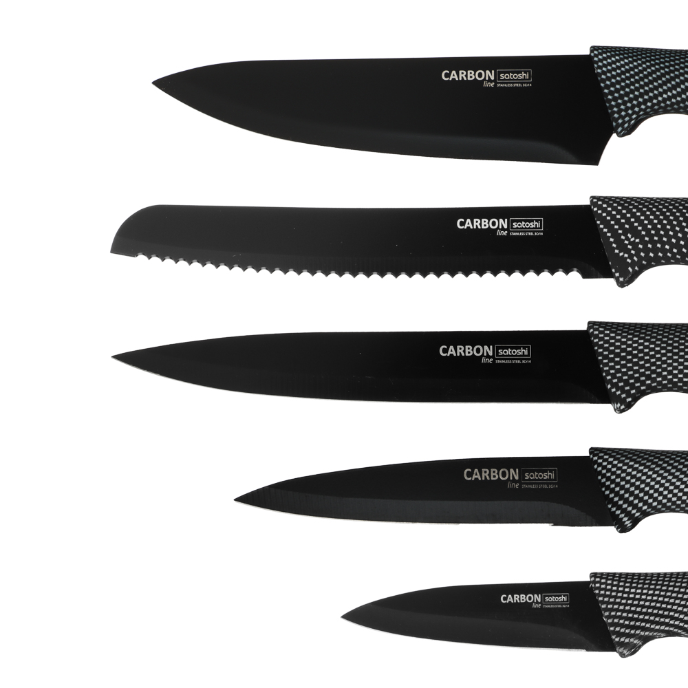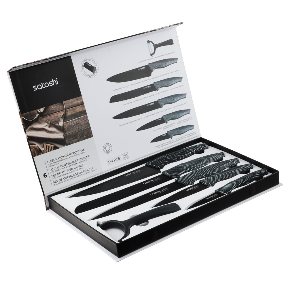Комплект из 5 ножей и овощечистки SATOSHI Карбон поможет выполнять различные задачи на кухне по разделке, нарезке и шинковке продуктов. Нож-шеф с длиной клинка 20 см удобен для быстрой нарезки овощей, зелени и фруктов. Универсальные ножи 20 и 12,7 см справятся с чисткой овощей и разделкой мяса и рыбы. Маленький нож 9 см удобен для вскрытия упаковок, мелких нарезок и чистки продуктов от кожуры. Хлебный нож 20 см позволит нарезать хлебобулочные изделия на идеальные ломтики без образования крошек. Горизонтальная овощечистка позволяет быстро очистить овощи, а следовательно – ускорить процесс готовки. Лезвия из нержавеющей стали имеют острую заводскую заточку, не подвержены коррозии, а также имеют антибактериальное покрытие. Рукоятки изделий приятно ложатся в руку и не выскальзывают. Набор ножей SATOSHI Карбон – прекрасный подарок для хозяйки, который станет украшением современной кухни.