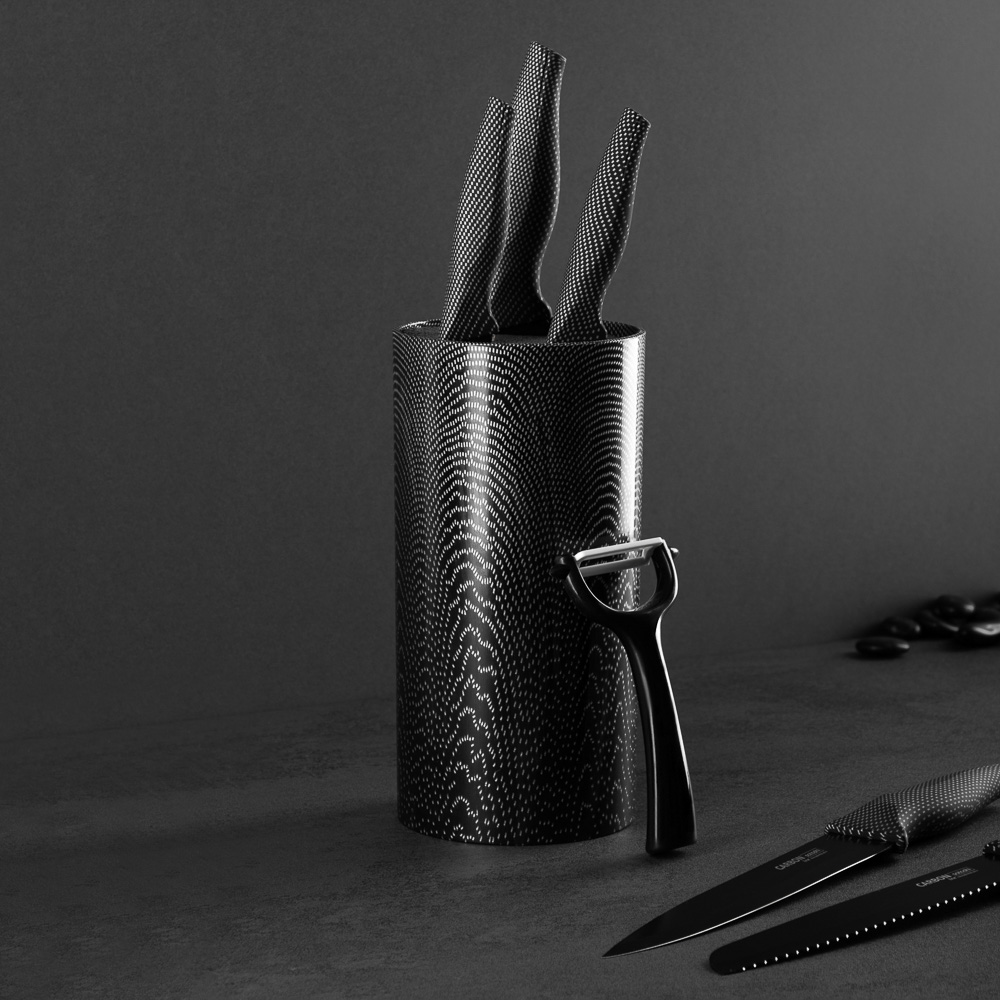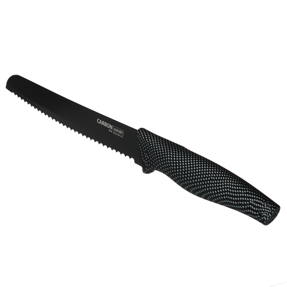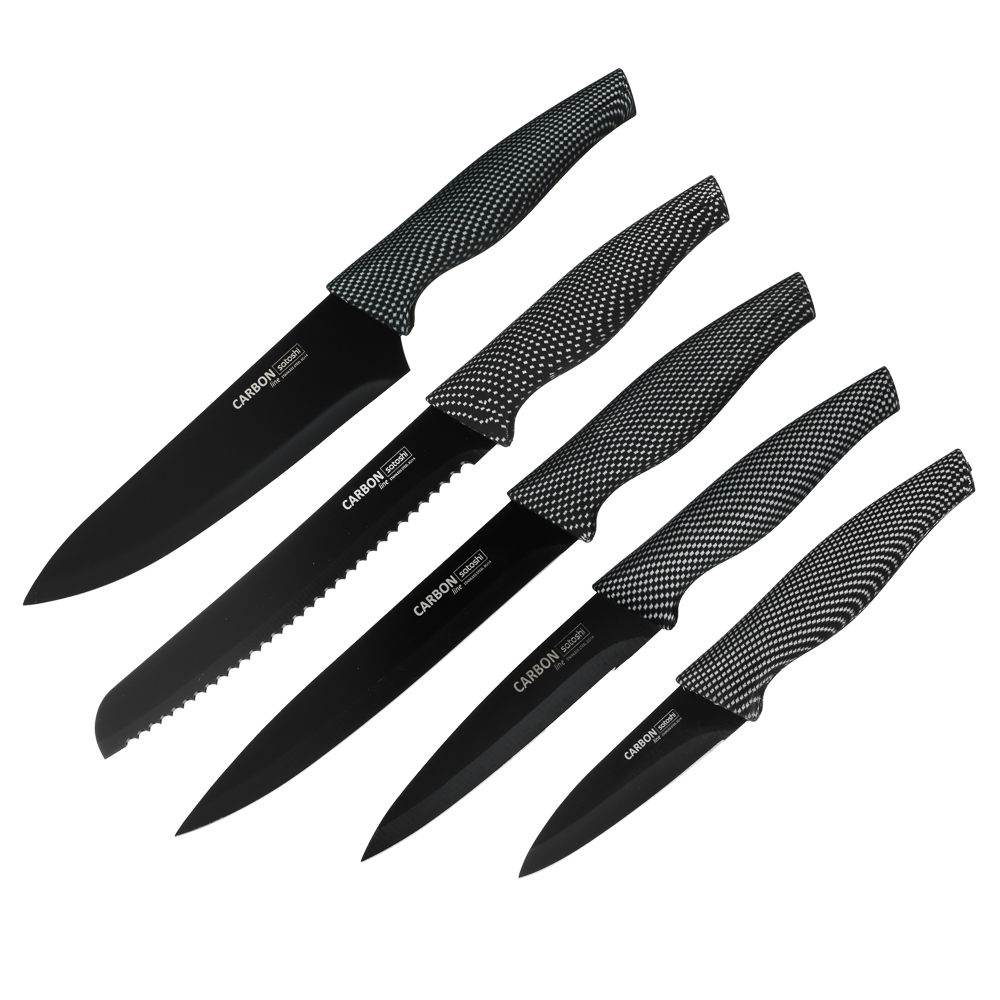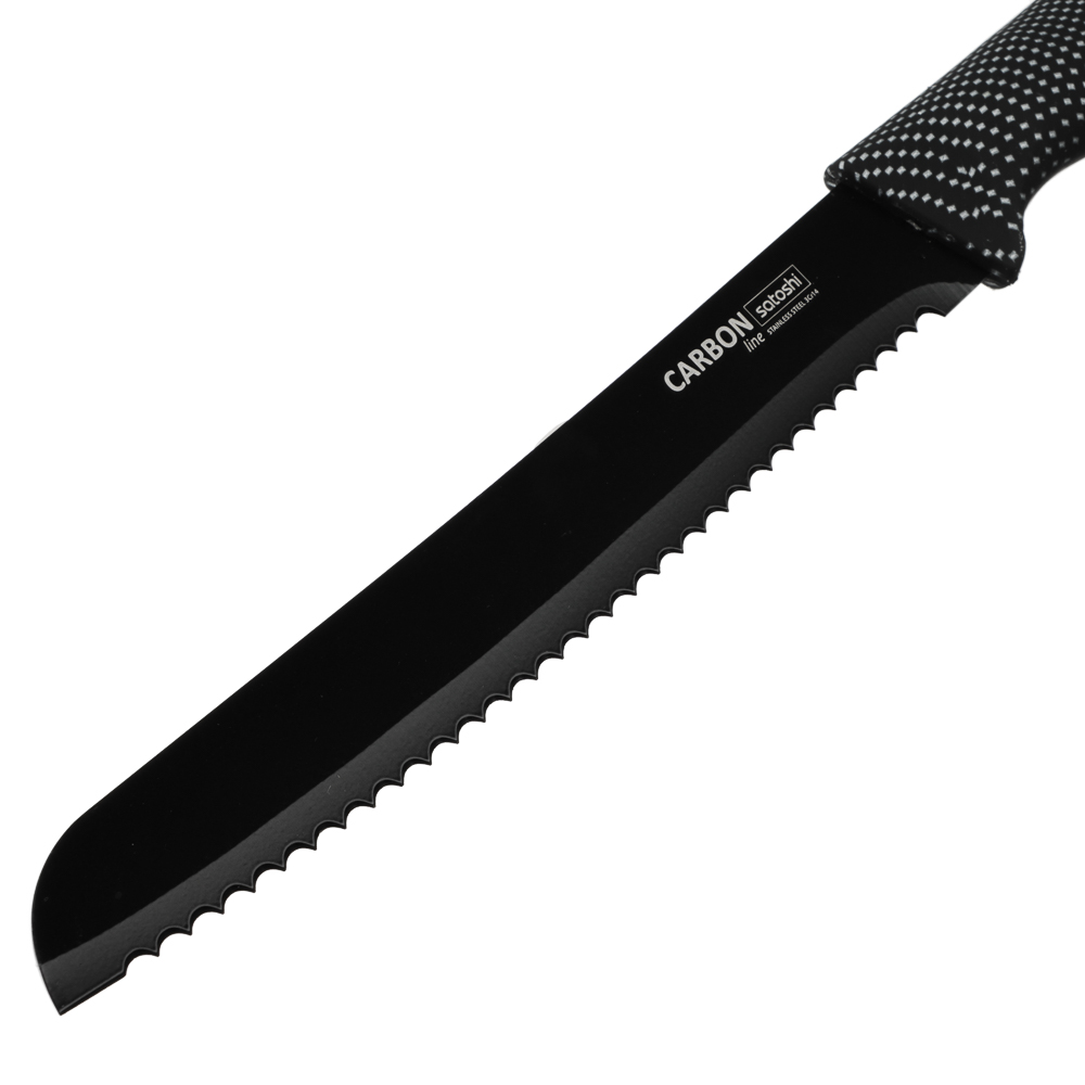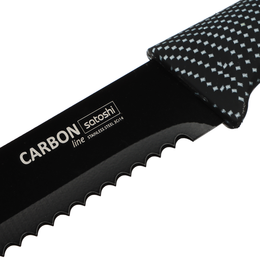 Комплект из 5 ножей и овощечистки SATOSHI Карбон поможет выполнять различные задачи на кухне по разделке, нарезке и шинковке продуктов. Нож-шеф с длиной клинка 20 см удобен для быстрой нарезки овощей, зелени и фруктов. Универсальные ножи 20 и 12,7 см справятся с чисткой овощей и разделкой мяса и рыбы. Маленький нож 9 см удобен для вскрытия упаковок, мелких нарезок и чистки продуктов от кожуры. Хлебный нож 20 см позволит нарезать хлебобулочные изделия на идеальные ломтики без образования крошек. Горизонтальная овощечистка позволяет быстро очистить овощи, а следовательно – ускорить процесс готовки. Лезвия из нержавеющей стали имеют острую заводскую заточку, не подвержены коррозии, а также имеют антибактериальное покрытие. Рукоятки изделий приятно ложатся в руку и не выскальзывают. Набор ножей SATOSHI Карбон – прекрасный подарок для хозяйки, который станет украшением современной кухни.